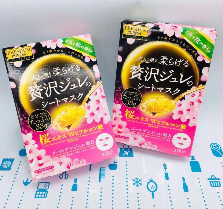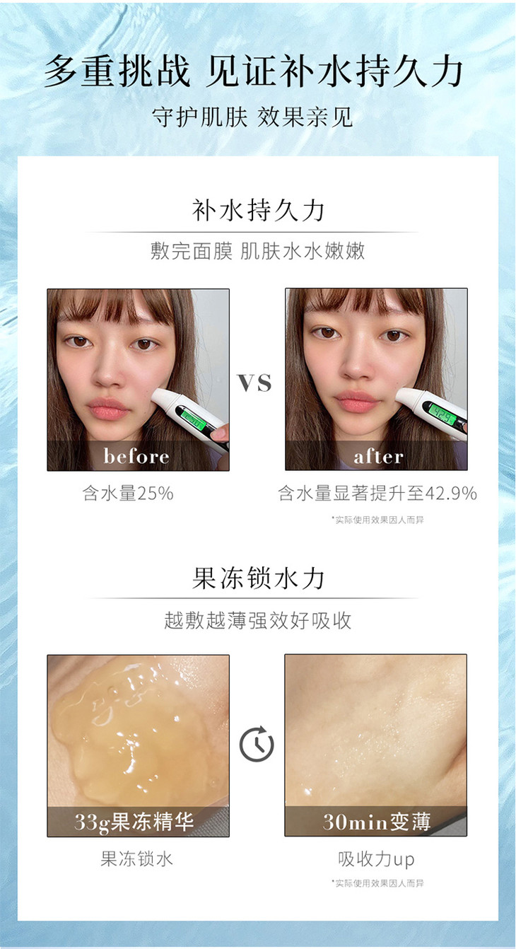 💙樱花款:樱花结合双玻尿酸💦,搭配樱花提取物🌸,比普通款更细腻哦。蜂皇浆加樱花美白保湿✨,补水和吸收效果都很棒,不会感觉黏腻👅!精华超多,贴完按摩至全部吸收效果更佳