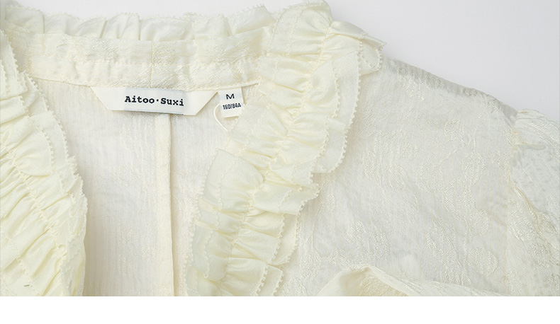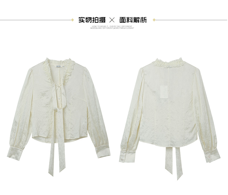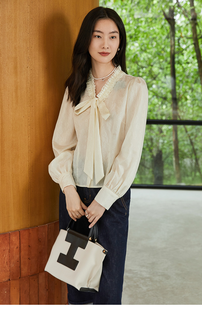 法式奶杏木耳边飘带衬衫 春夏季新款肌理感宽松甜美长袖衬衣