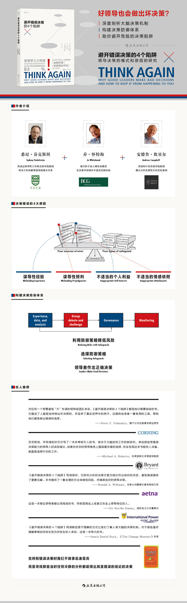 三位管理学大师,均致力于研究“决策为什么会失败”,各有所长,相得益彰。共同构建了决策防御体系,期望为读者将决策的风险降到最低。本书已成为《哈佛商业评论》决策管理经典。
