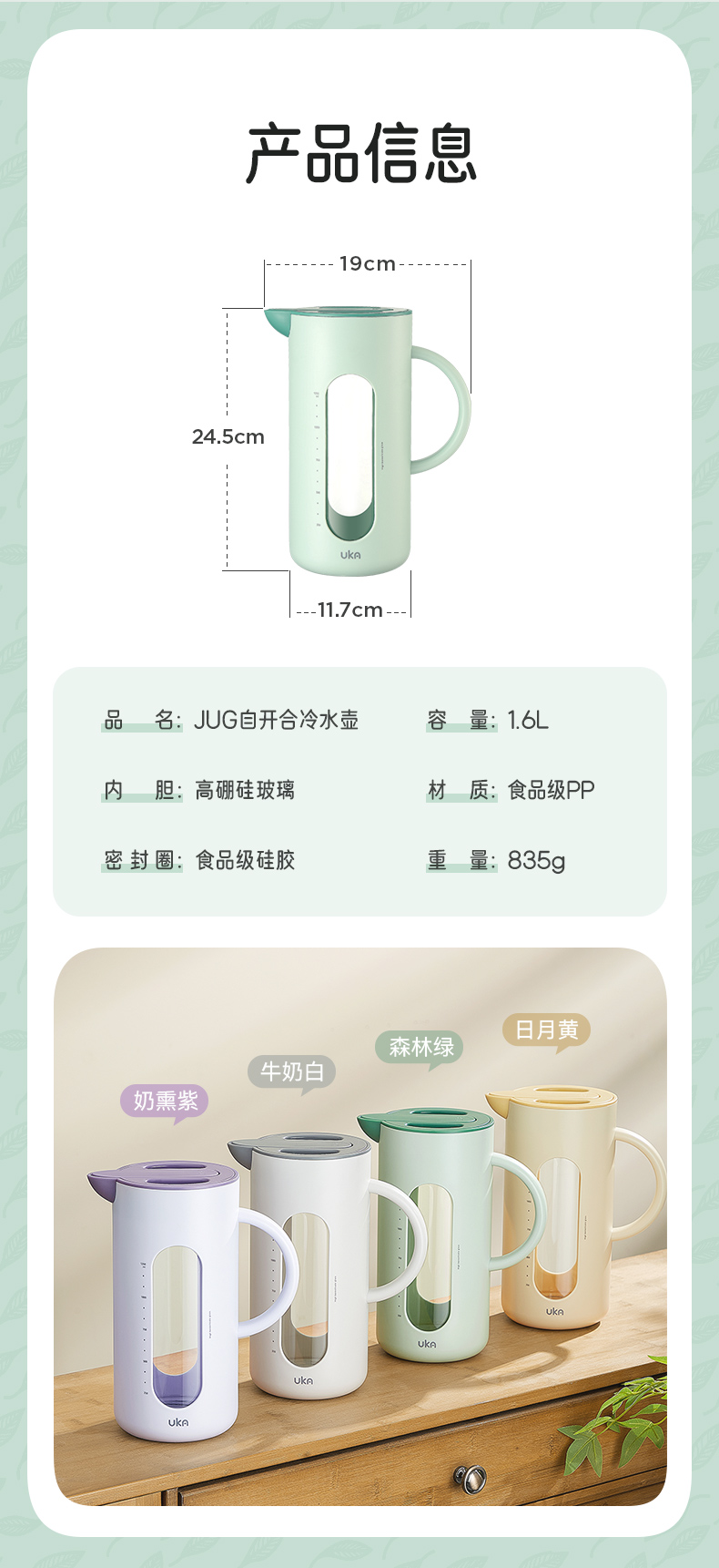 UKA 自开合冷水壶1.6L玻璃耐高温家用防爆防烫大容量夏季凉水壶茶扎壶【该商品不支持用券】