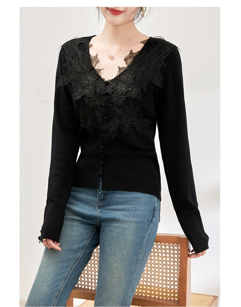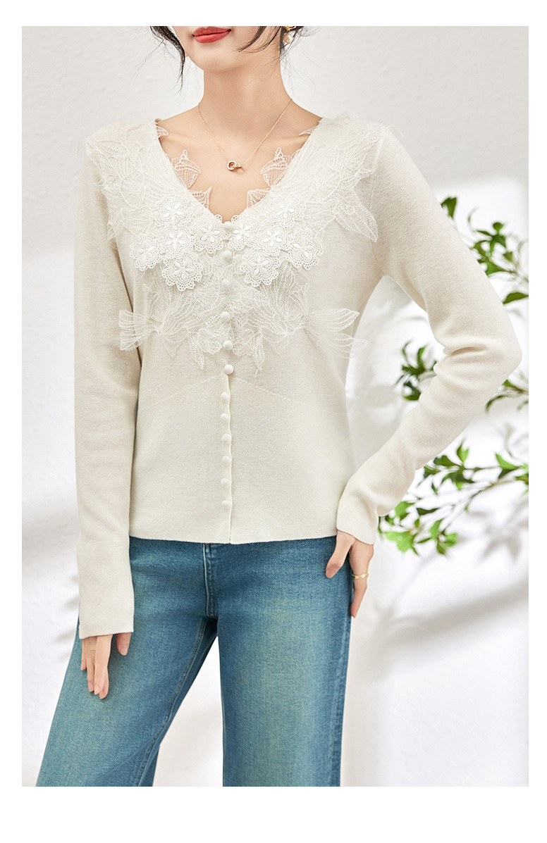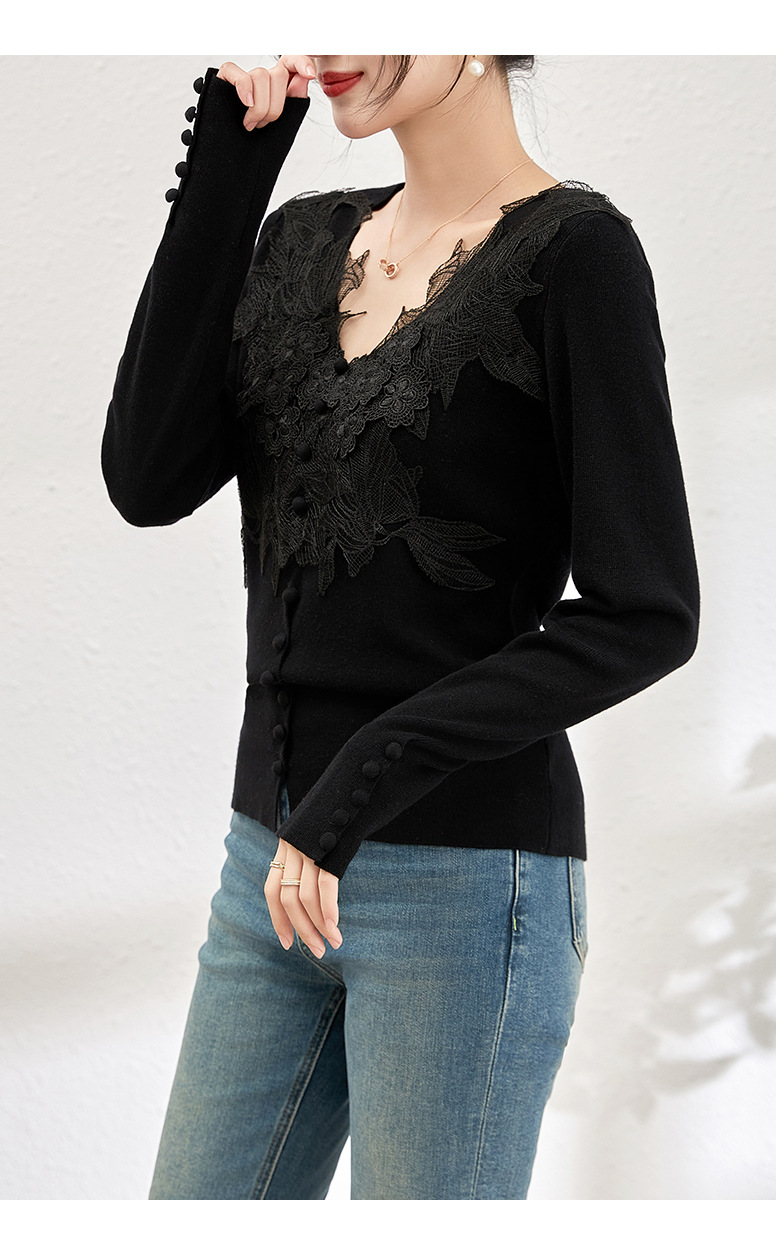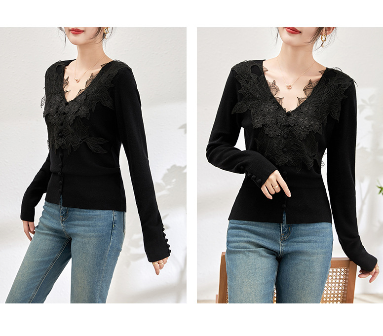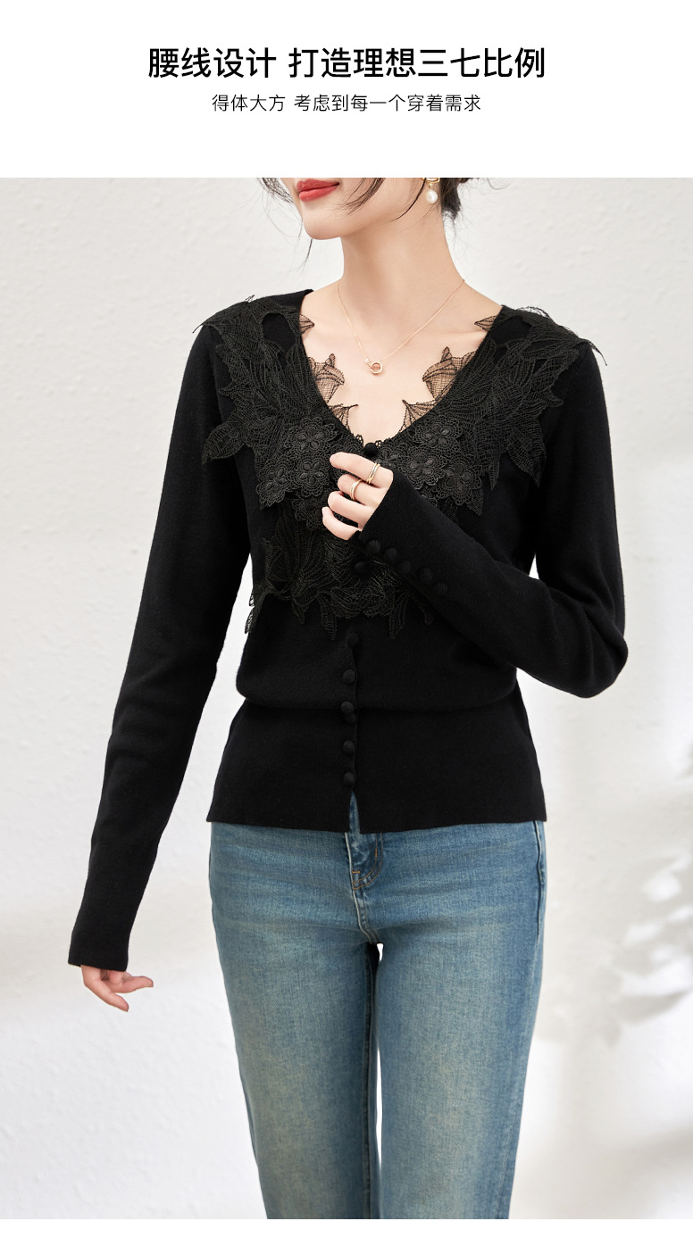 蕾丝拼接设计感别致内搭,打底长袖气质V领修身针织衫WLZD-2401105