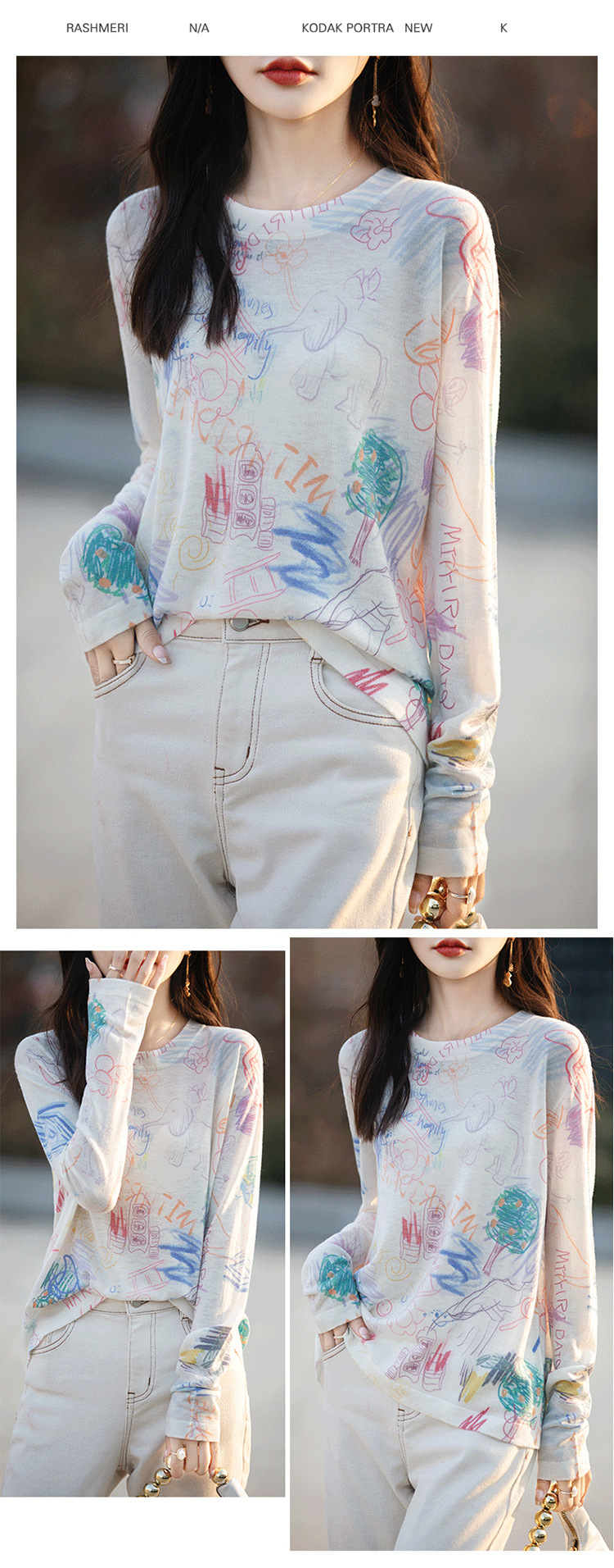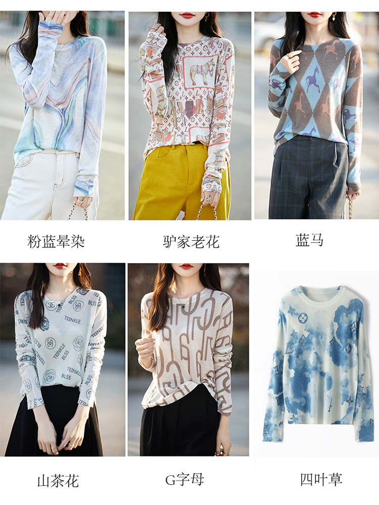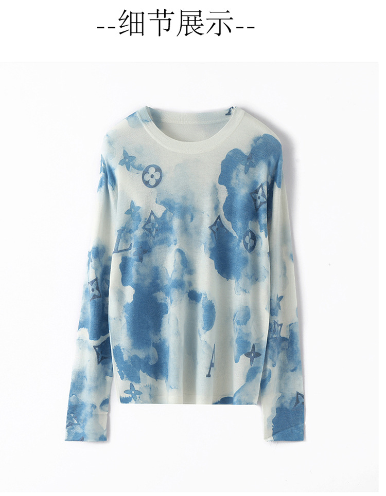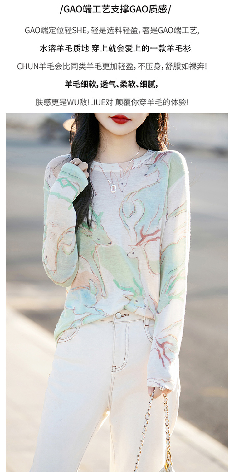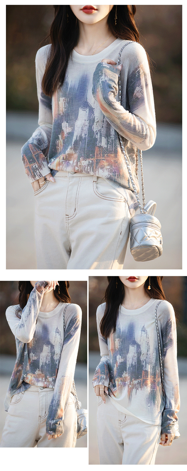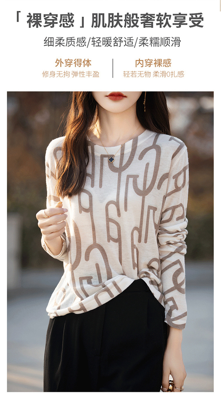 丁摩【120支水溶】精纺超细水溶羊毛水墨画圆领亲肤薄款针织打底衫AL2507