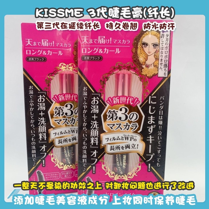 KISSME 3代睫毛膏(纤长)👍睫毛精的心头大好👀!第三代在延续纤长,持久卷翘,防水防汗一整天不晕染的功效之上,对卸妆问题也进行了改进✔,现在真的超级好卸掉喔。轻松上手的弯月型刷头,超长纤维成分😎,抓住每根睫毛,瞬间锁定成分持久定型🕓,宛如为睫毛擦上定型蜡。超强防水防油,眼泪、汗水、皮脂都不再怕!添加睫毛美容液成分💦,上妆同时保养睫毛。