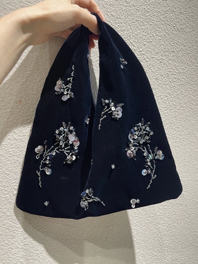 这款中式风丝绒钉珠福袋手提包以单片折叠成型设计,摒弃繁复拼接,回归材质与工艺本质。包身采用日本进口粘纤铜氨丝绒,绒毛细腻如雾,触感柔滑亲肤,温润光泽与底色相映,宛如夜色波光,低调中尽显高级质感。内衬搭配定制半粘纤里布,丝质光泽柔和,兼顾实用与高级体验。