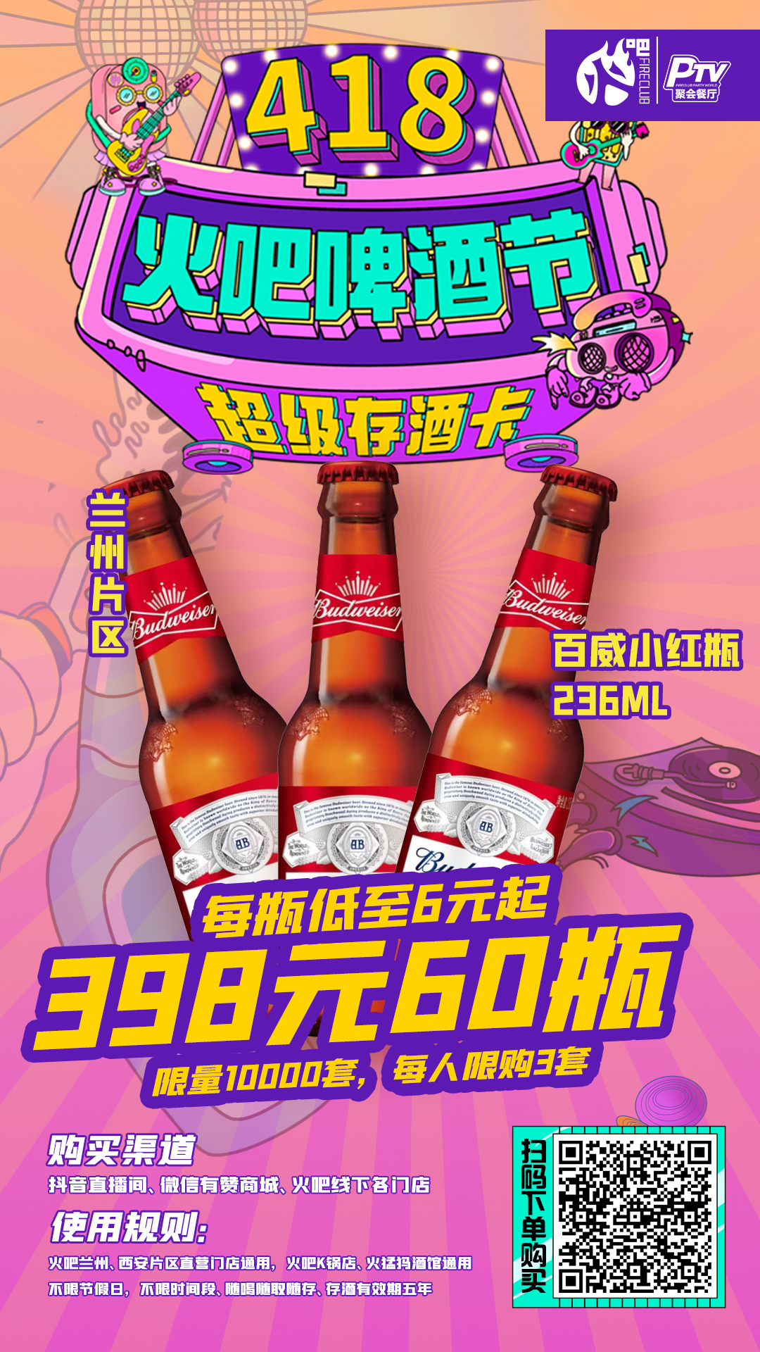 兰州片区-4月18日火吧啤酒节—超值存酒卡来了—398元60瓶百威小红瓶啤酒
