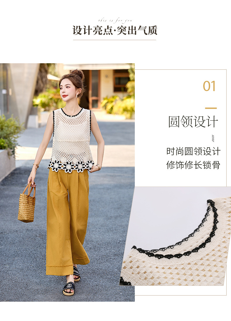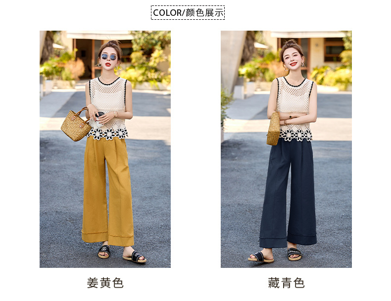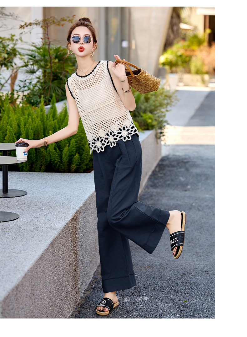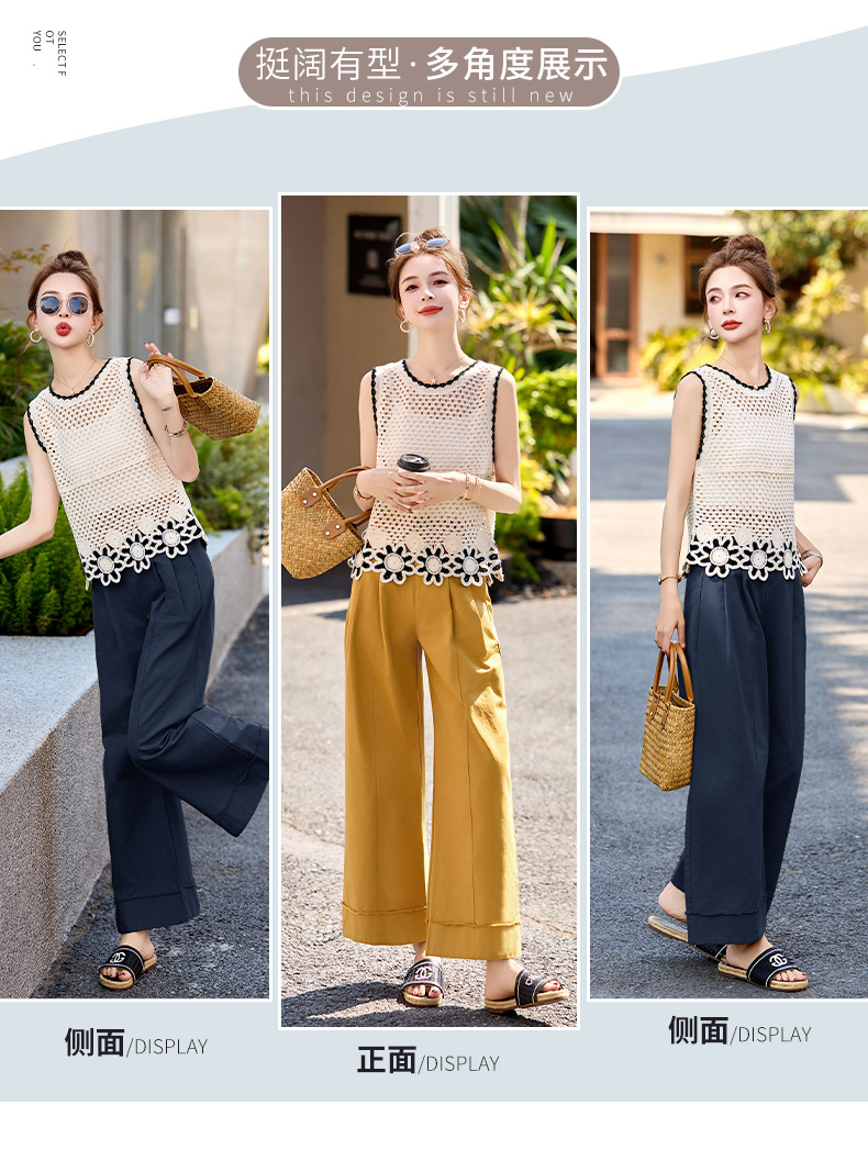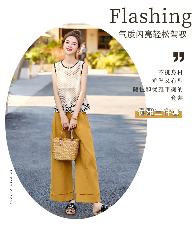 洋气镂空无袖上衣,吊带裤子显瘦阔腿裤三件套装HR-1-500