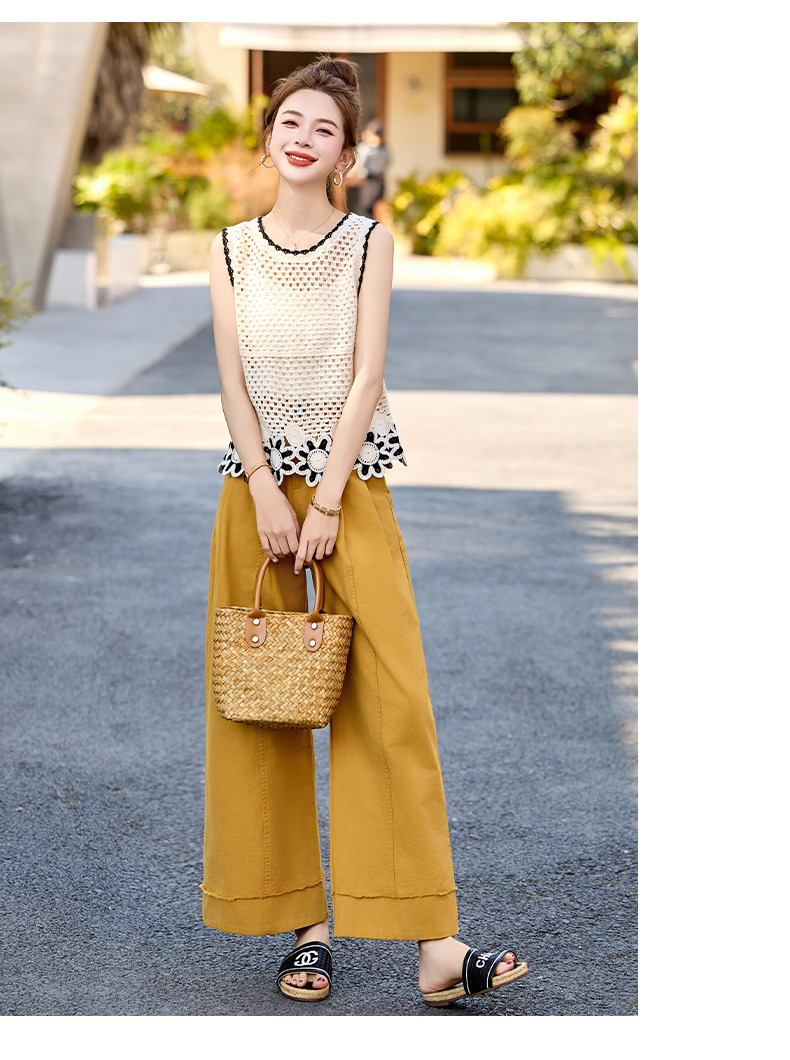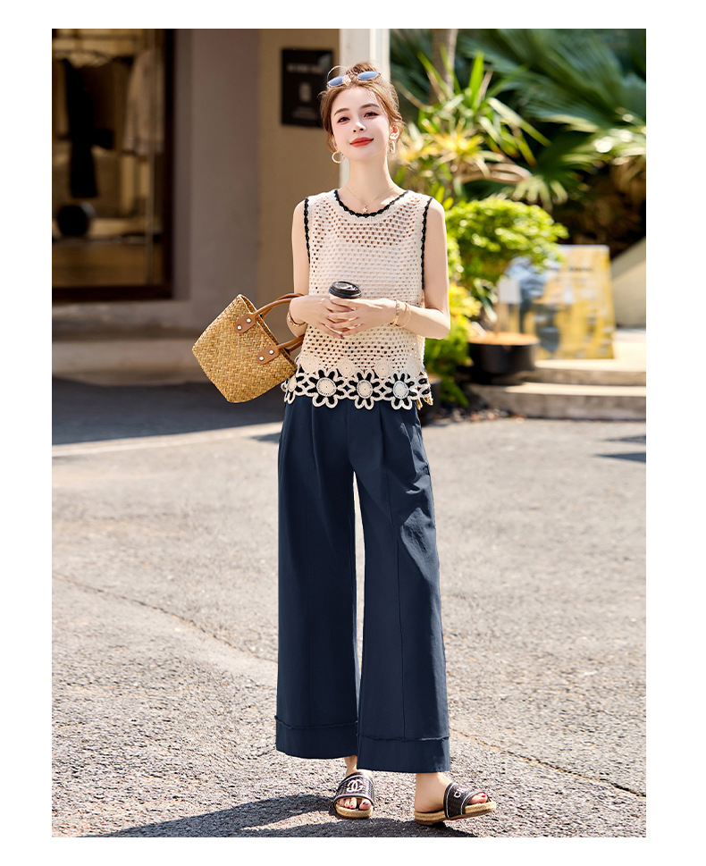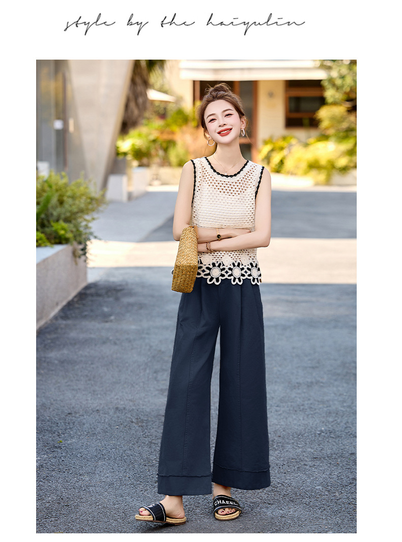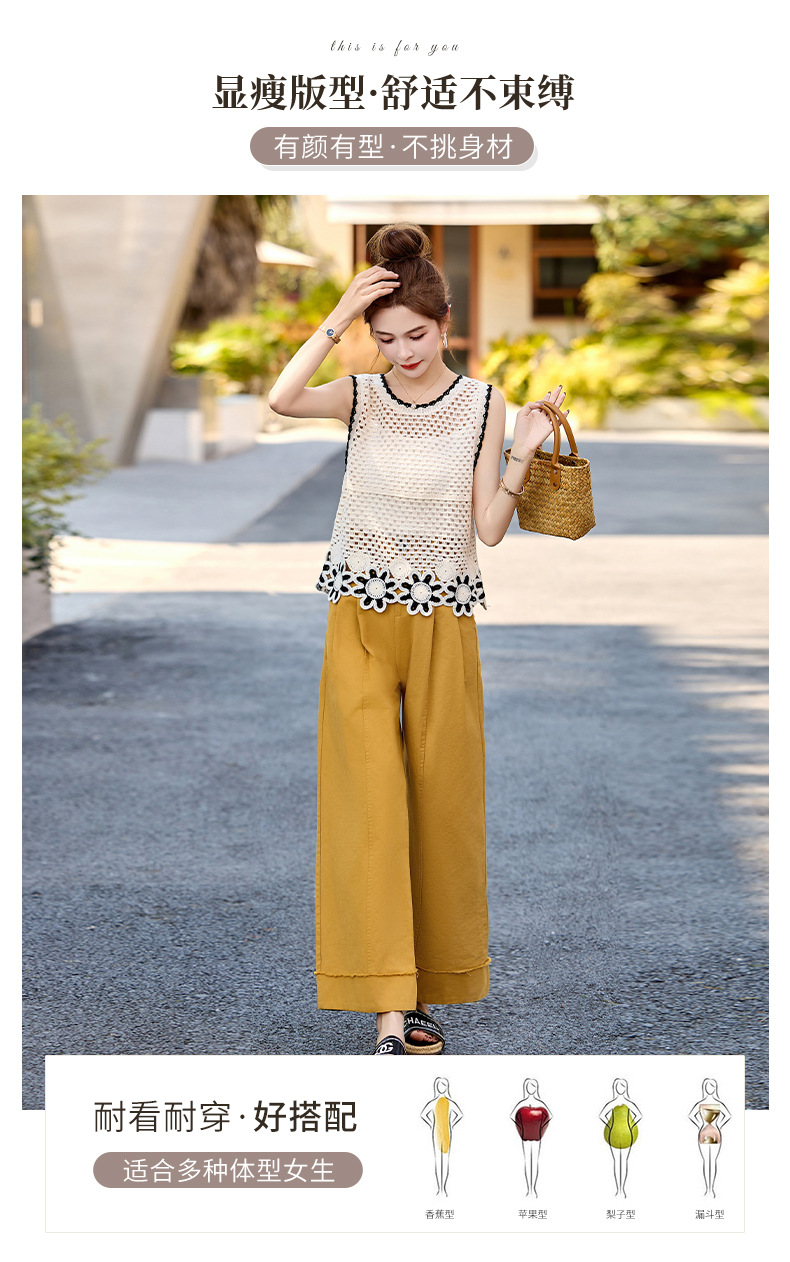 洋气镂空无袖上衣,吊带裤子显瘦阔腿裤三件套装HR-1-500
