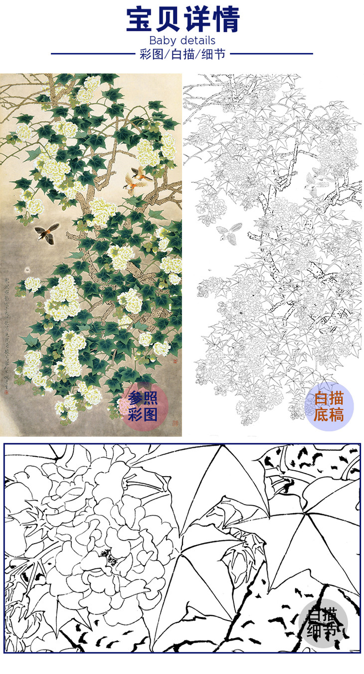 竖幅工笔花鸟白描底稿-周彦生芙蓉花《寒波照影》-多种白描尺寸可选-QN19
