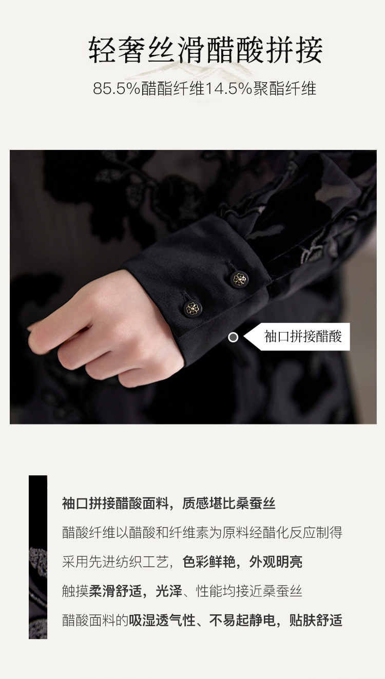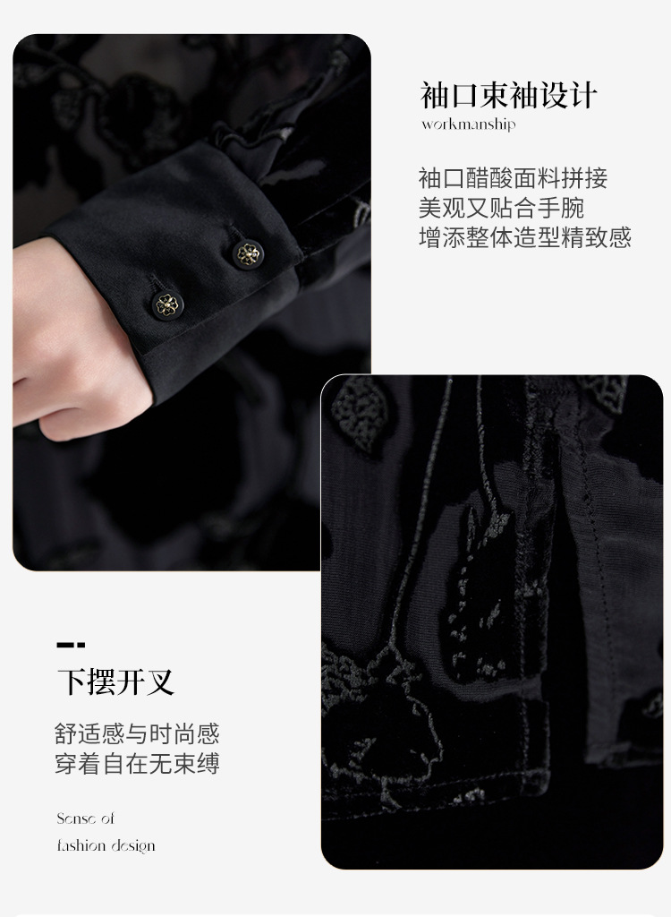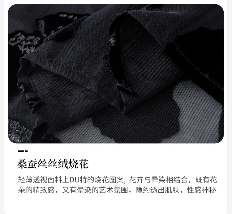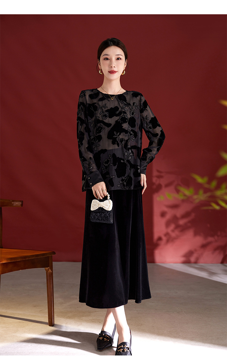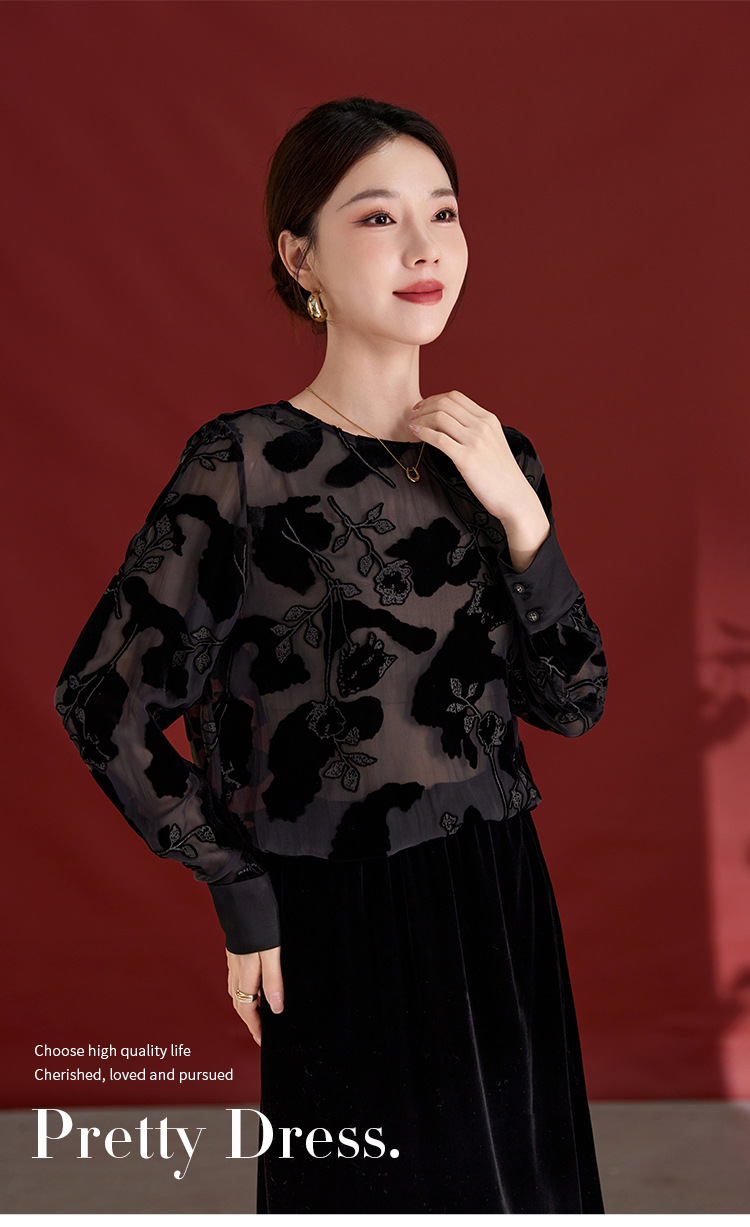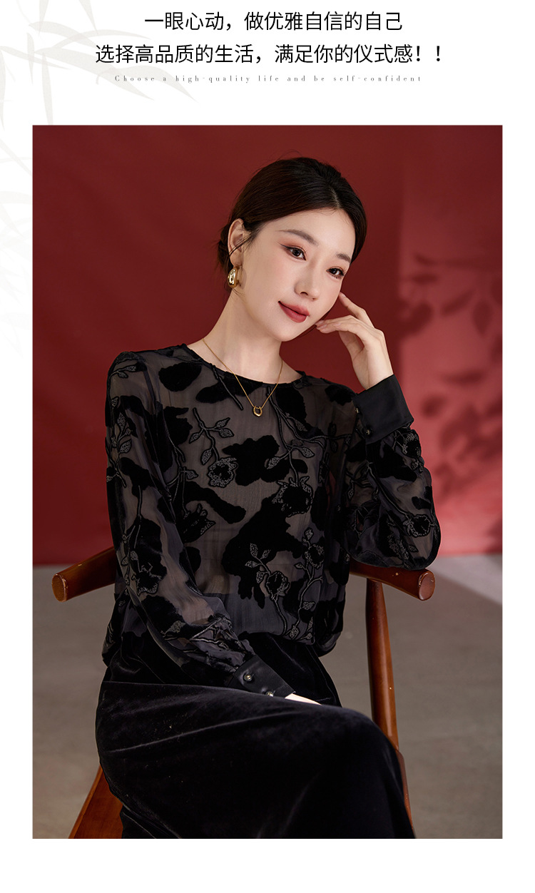 QS2025早秋新款烧花真丝丝绒休闲T恤女时尚轻奢显瘦圆领长袖1861