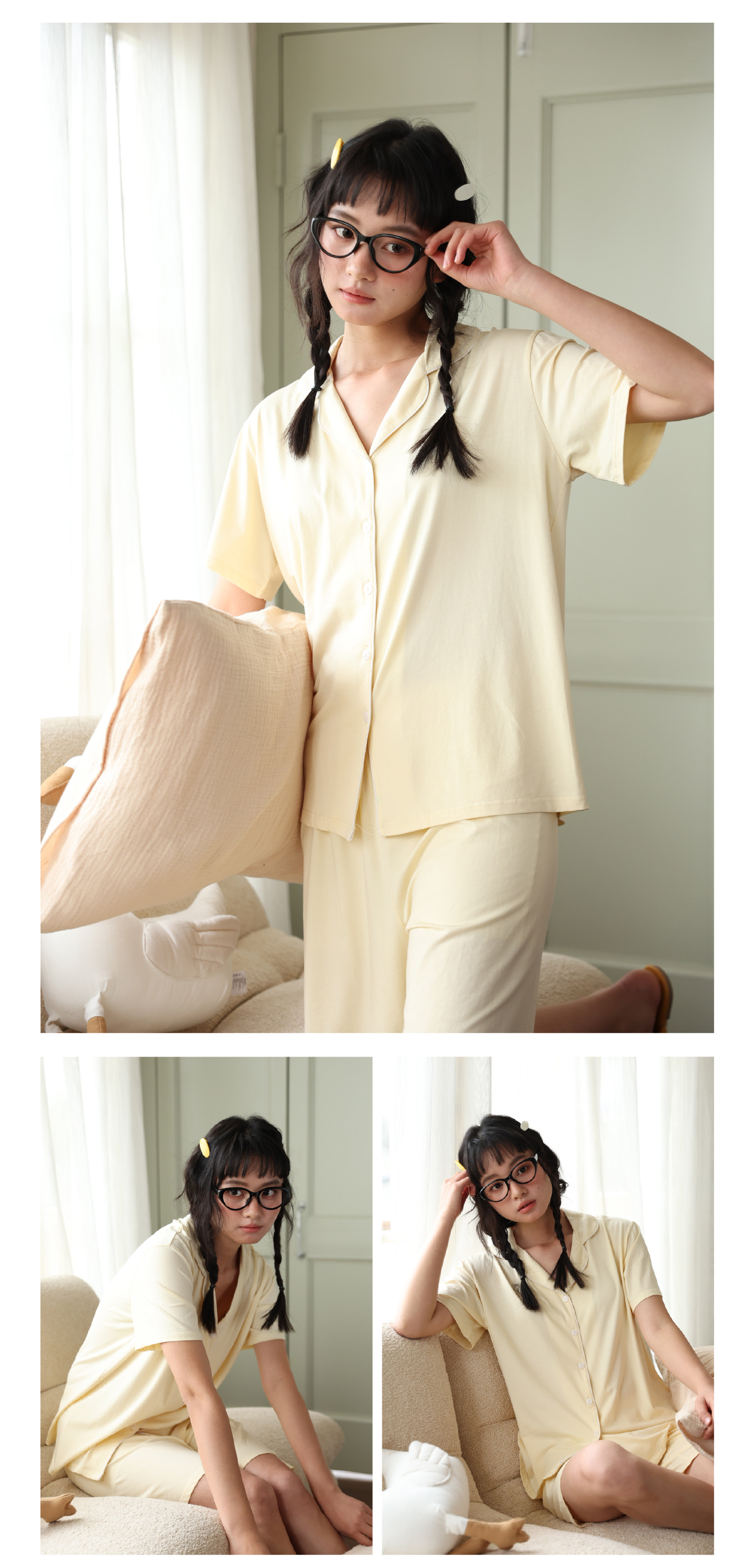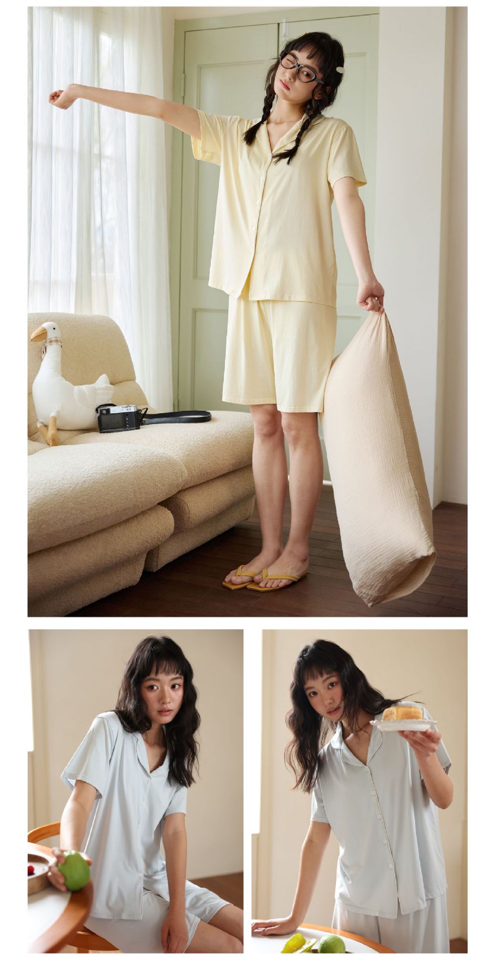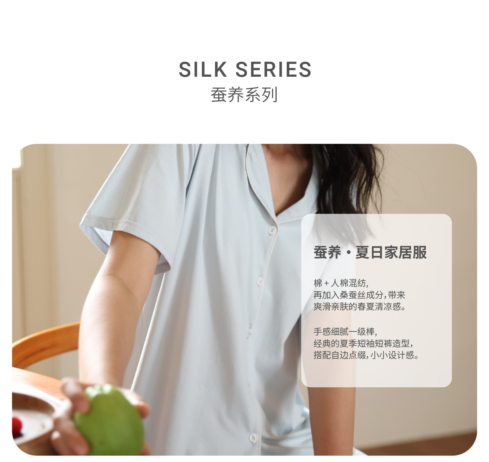 【2026夏季】桑蚕丝・开衫家居服 翻领爽滑亲肤凉感 短袖短裤宽松纽扣套装 纯色设计感外穿睡衣