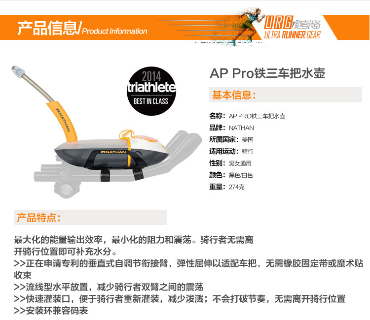 NATHAN内森 户外骑行水壶 AP Pro 铁三车把水壶自行车把水壶