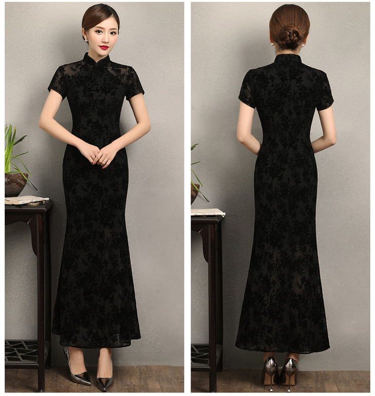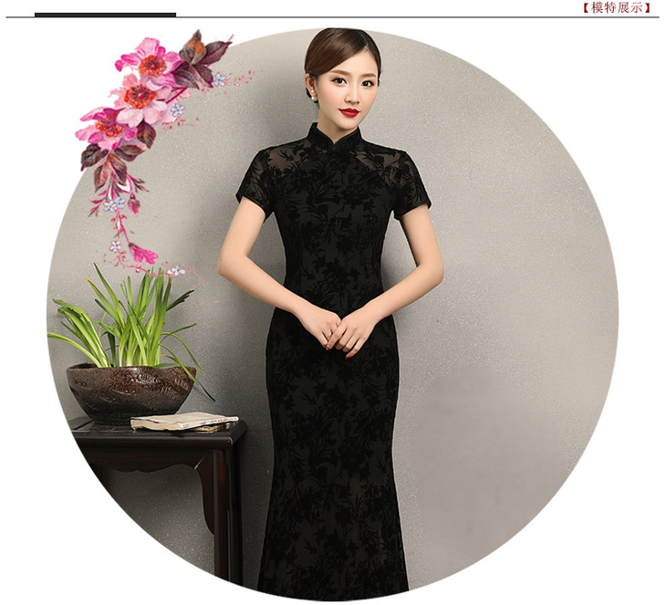 上海旗袍厂XGT-8096丝绒烧花鱼尾摆旗袍