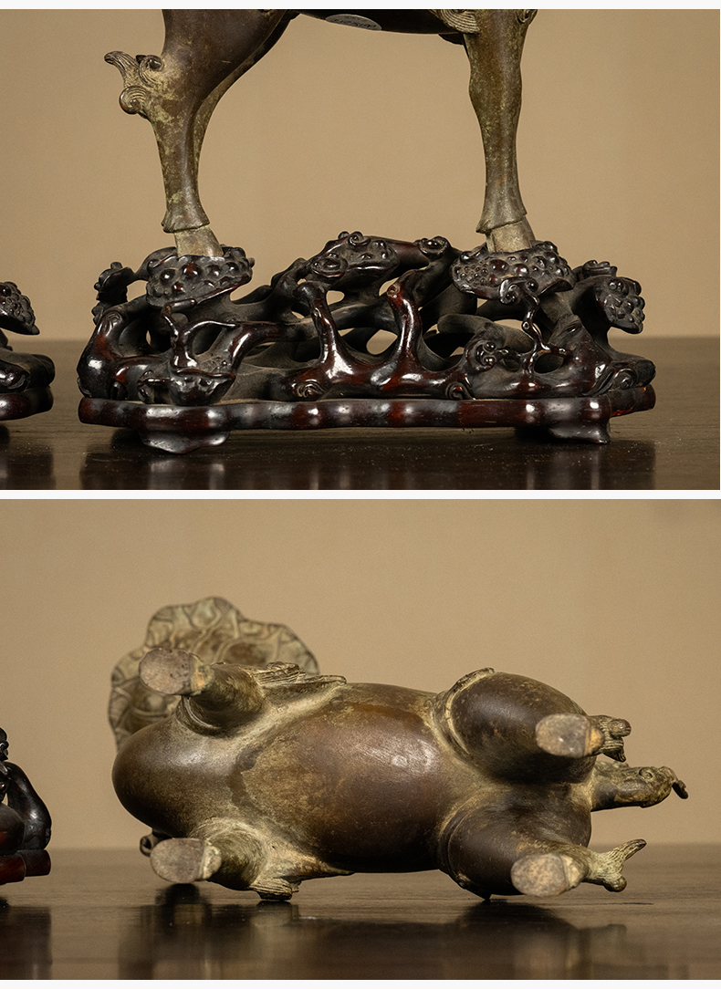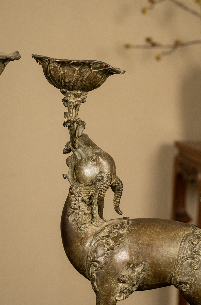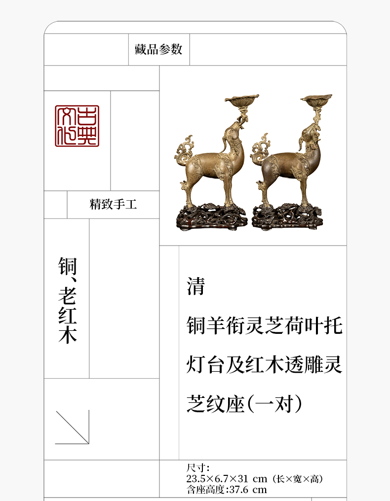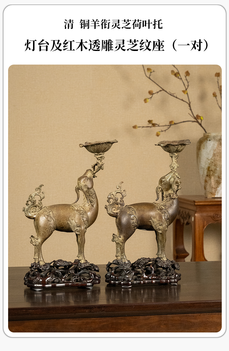 清 铜羊衔灵芝荷叶托灯台及红木透雕灵芝纹座(一对)