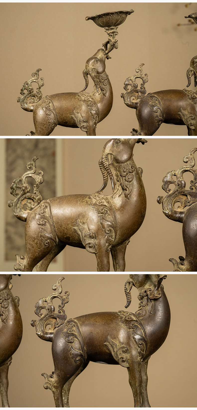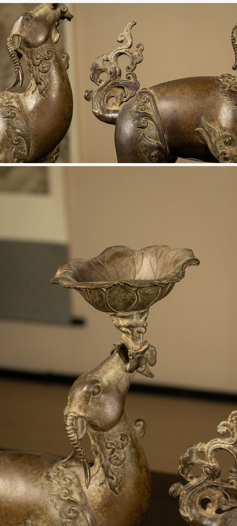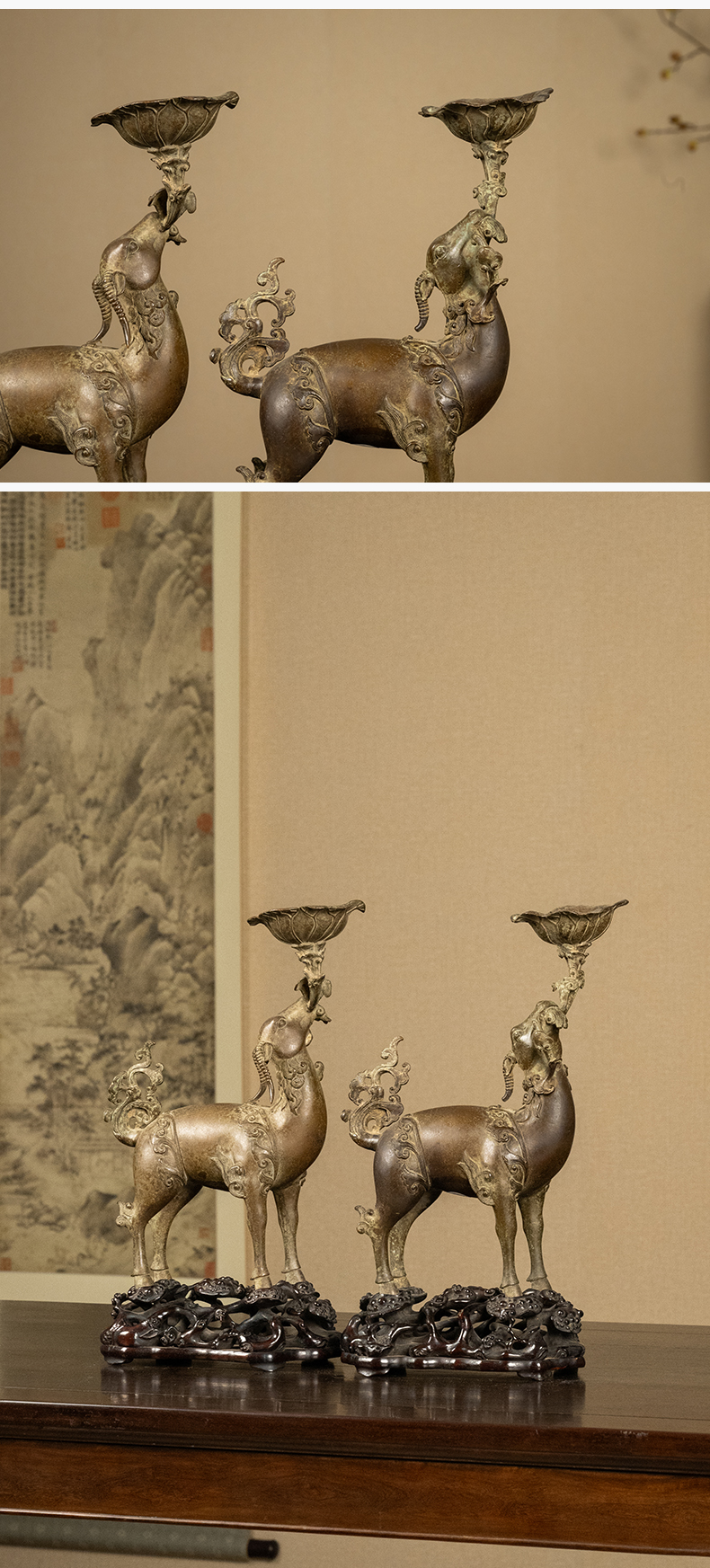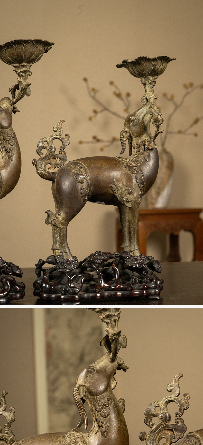 清 铜羊衔灵芝荷叶托灯台及红木透雕灵芝纹座(一对)