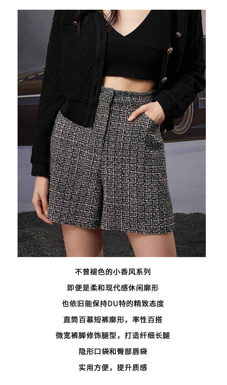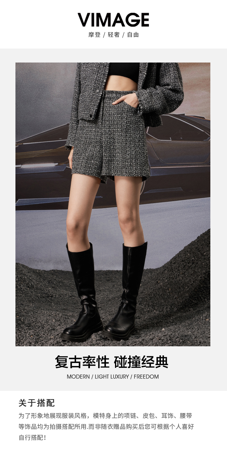 VIMAGE纬漫纪秋季新款粗花呢格子洋气复古直筒显瘦高腰女短裤裤子V1805409