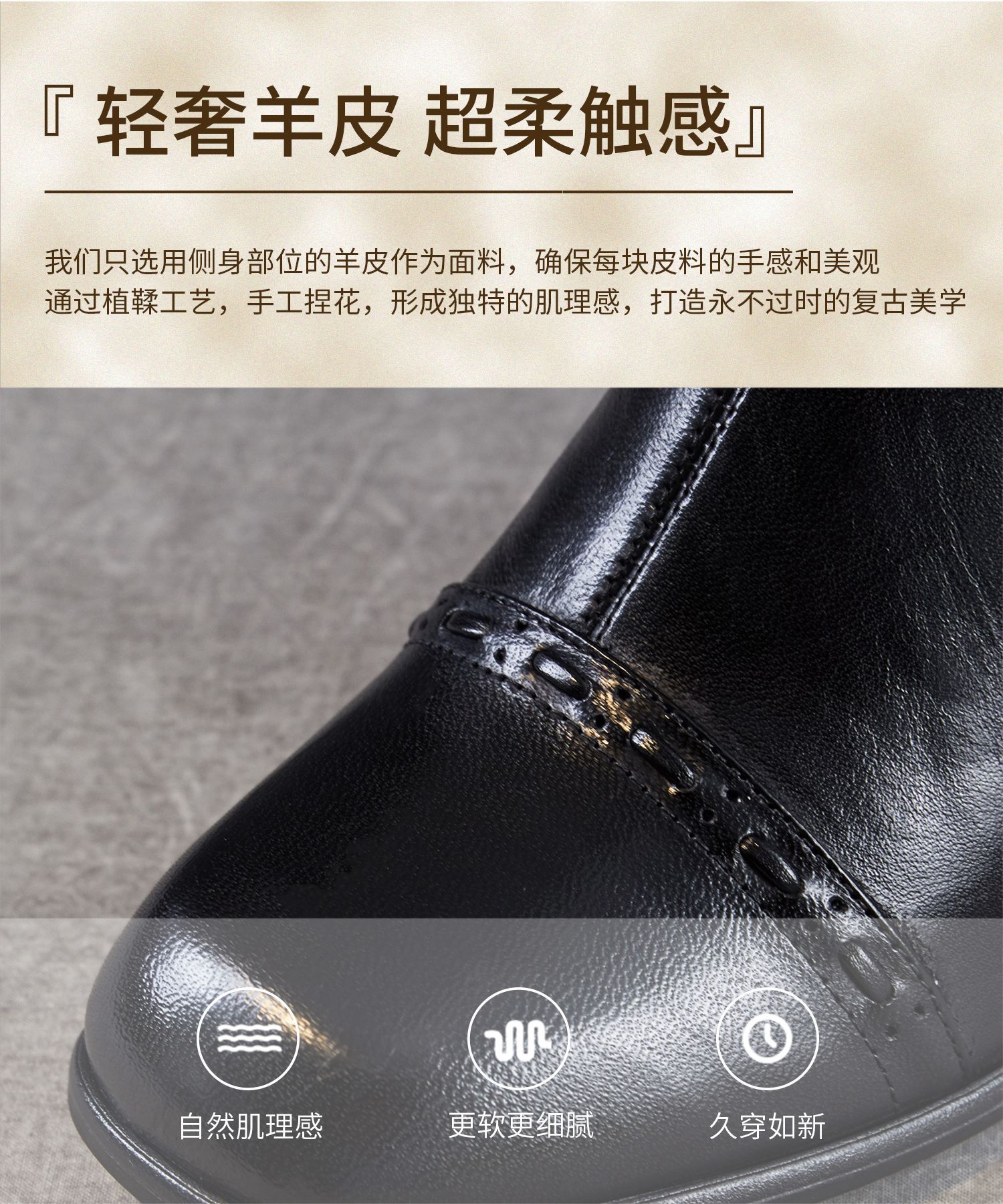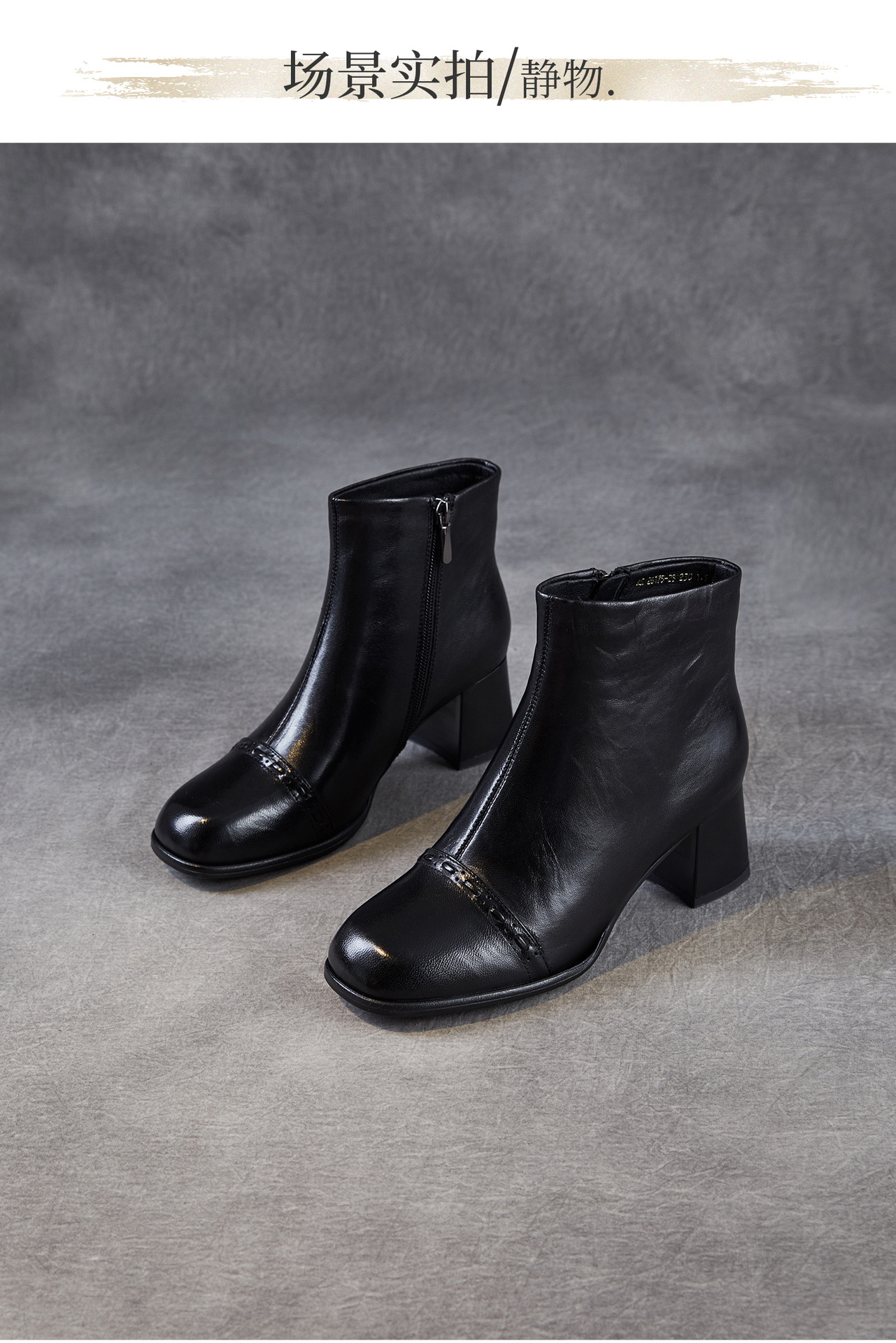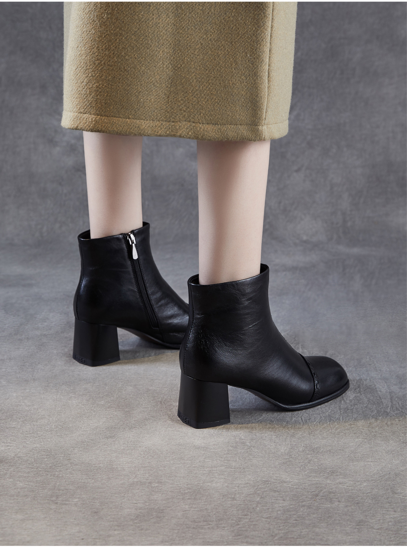 ZM 258688粗跟轻奢羊皮短靴软底真皮方头气质显瘦加绒靴