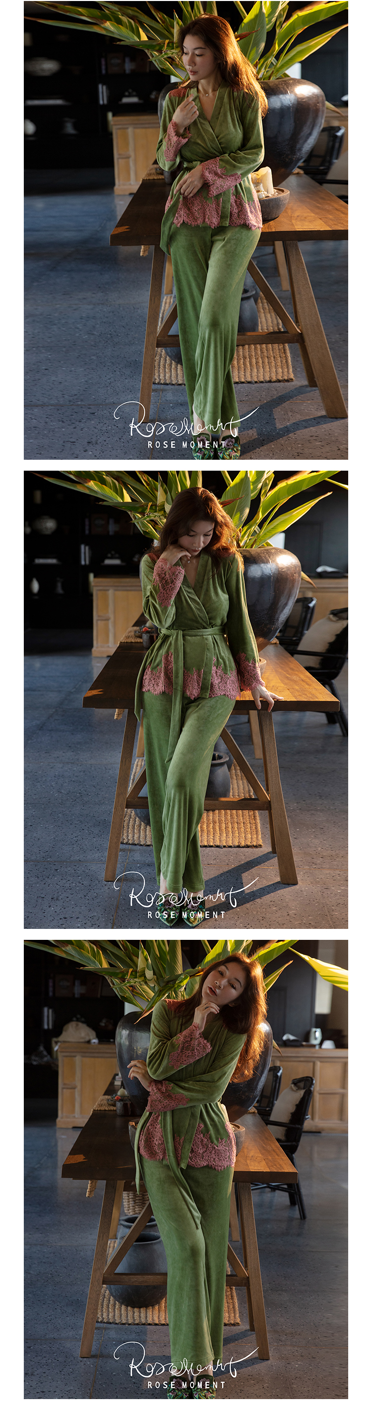 彩色蕾丝露背长款真丝吊裙睡袍 A22103