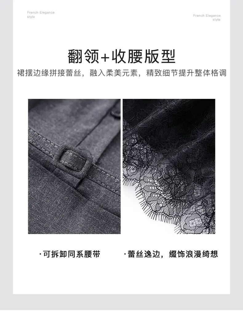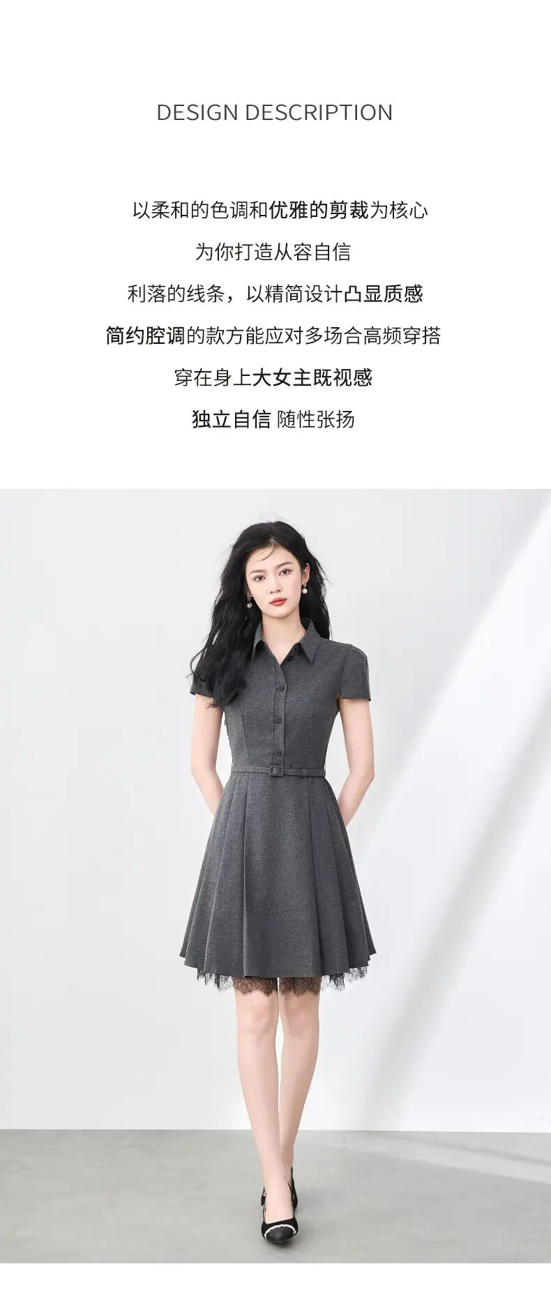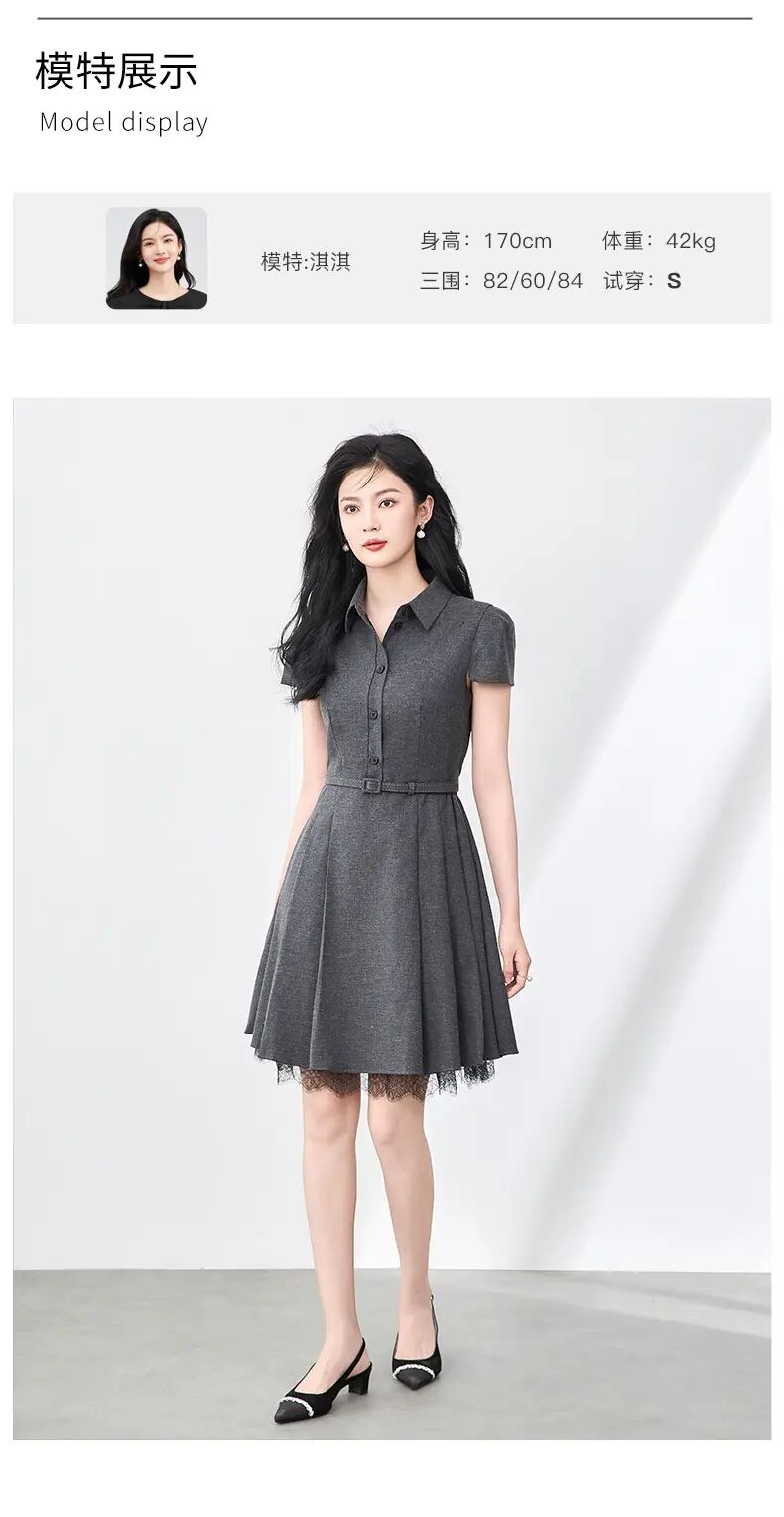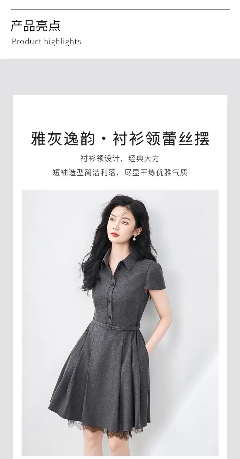 【高货wl】全新升级【铂金会员330/天猫439/差价109】(00202) 洛诗琳复古时髦洋气翻领短袖拼蕾丝压褶收腰显瘦连衣裙
