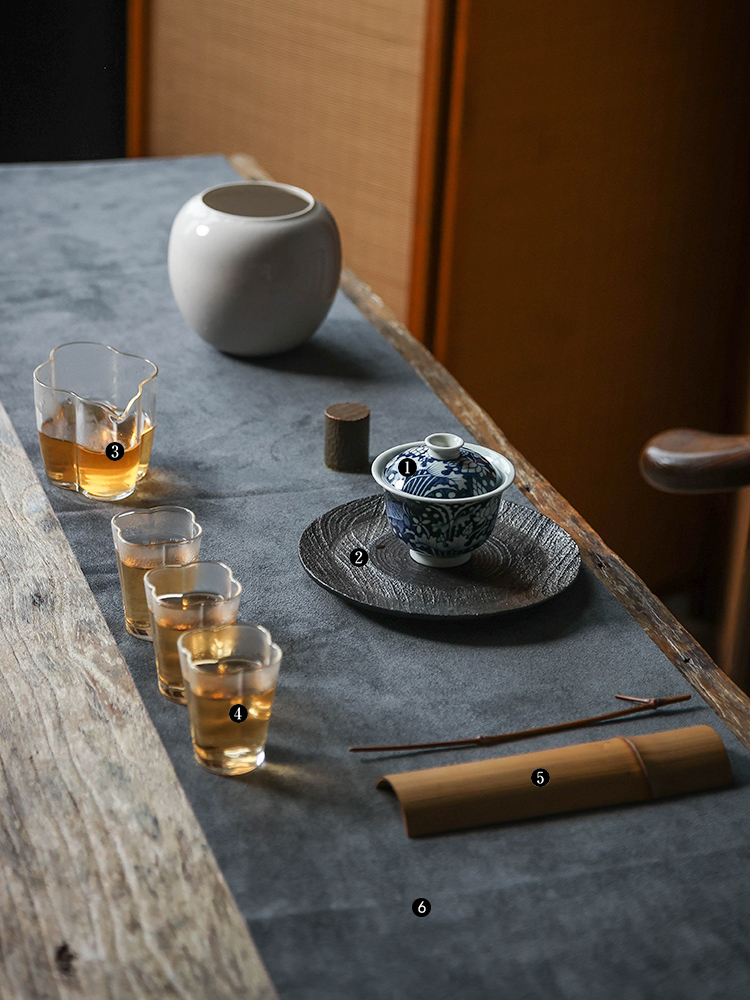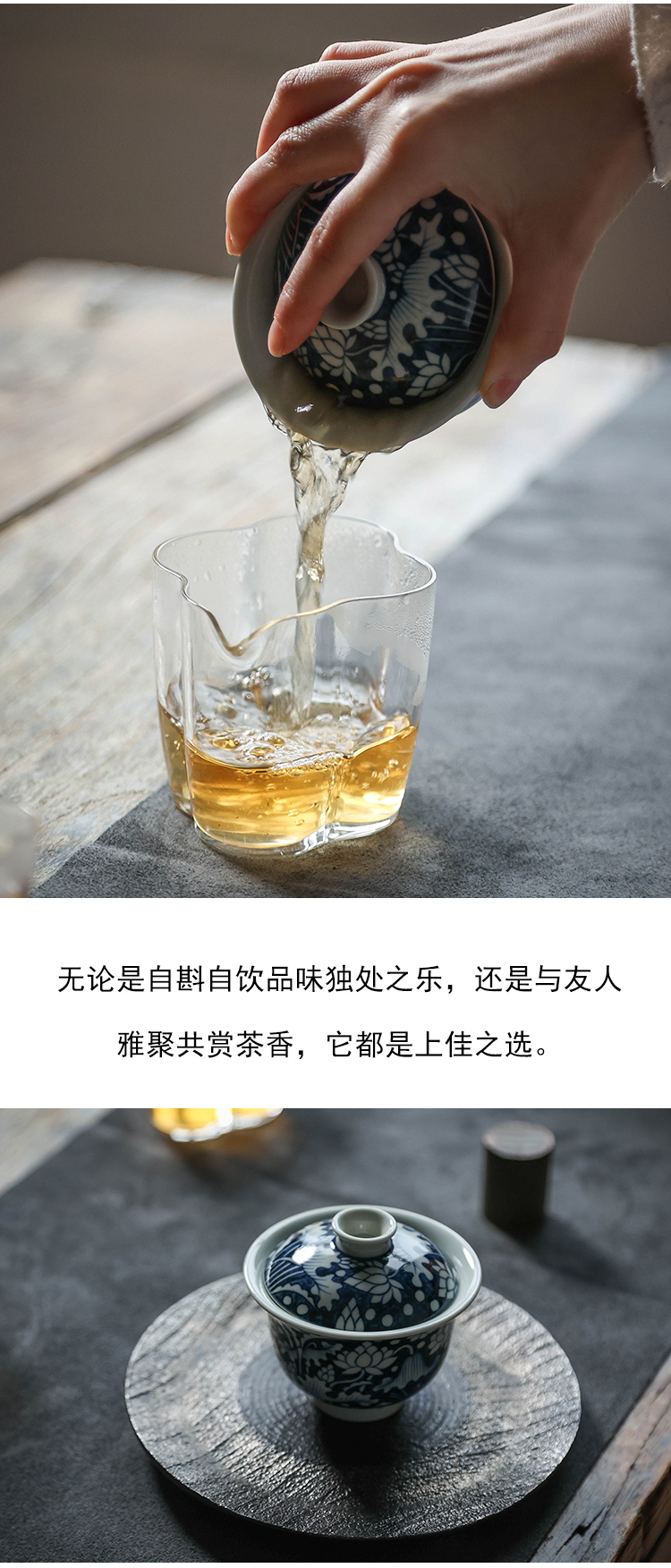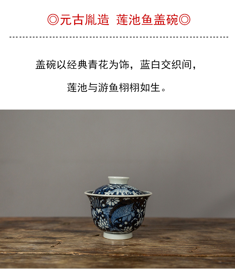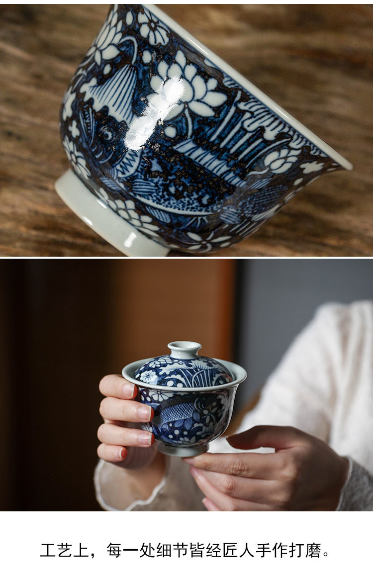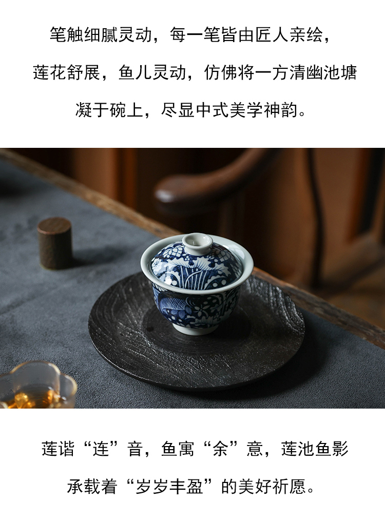 茶香记 元古胤造莲池鱼盖碗110ml手绘青花陶瓷泡茶碗古雅厚重茶具
