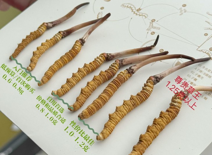 0.6g-0.8g规格,按比例搭配,中间的最多,20:50:30比例,适合初次尝试虫草和预算低的客人,这里面会有30% 0.8g左右的草大家在这个级别也可以体验到中大草!
