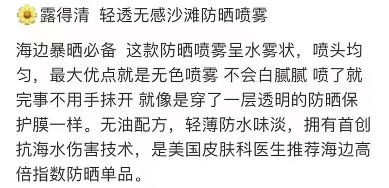 露得清防晒可以一生推,毕竟医美级别的防晒产品值得信赖,防UVA和UVB!喷雾对于夏天补妆更加方便,不光脸上防晒身体也要防晒!这货是户外运动出门旅行的好伙伴!SPF60去海边也可以安心用了,无油配方,防水防汗长达80分钟!两支防晒喷雾特别划算