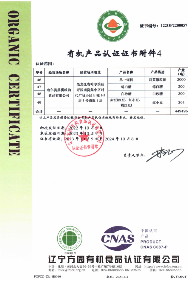 砂糖、山楂以及加工品的有机认证证书