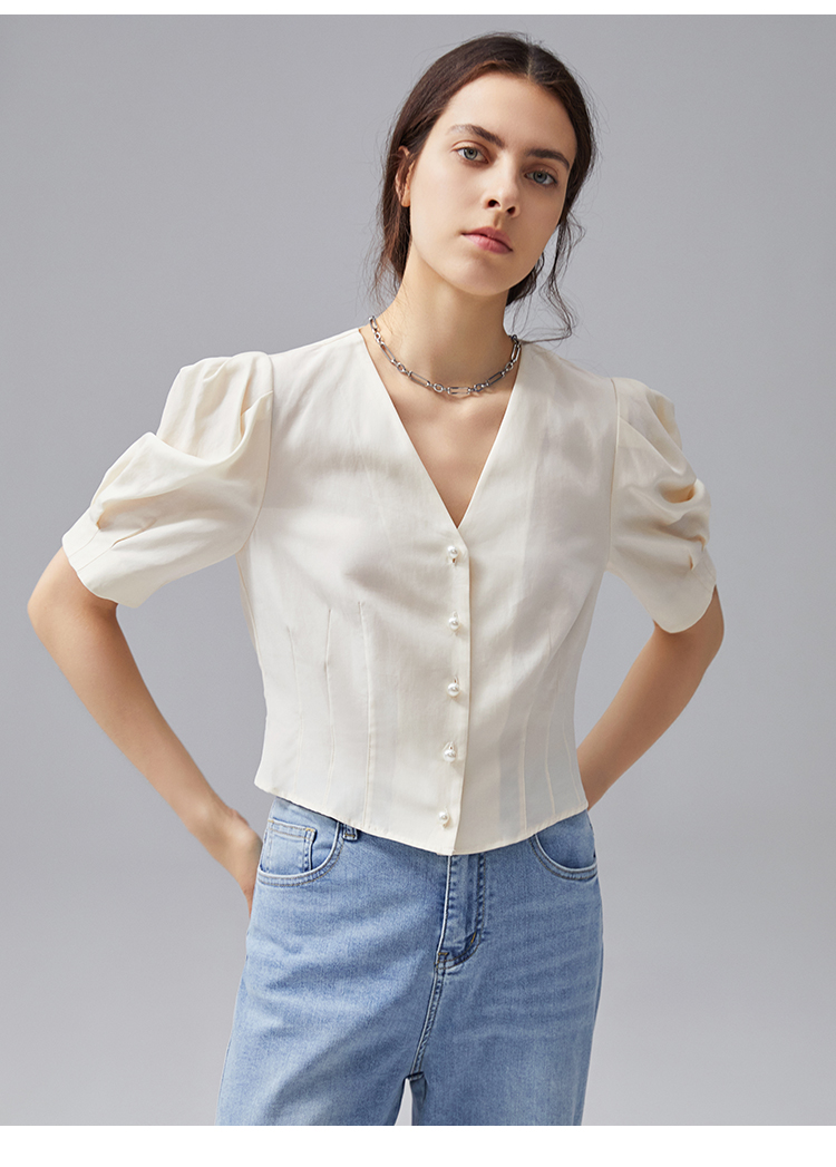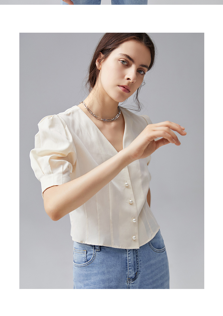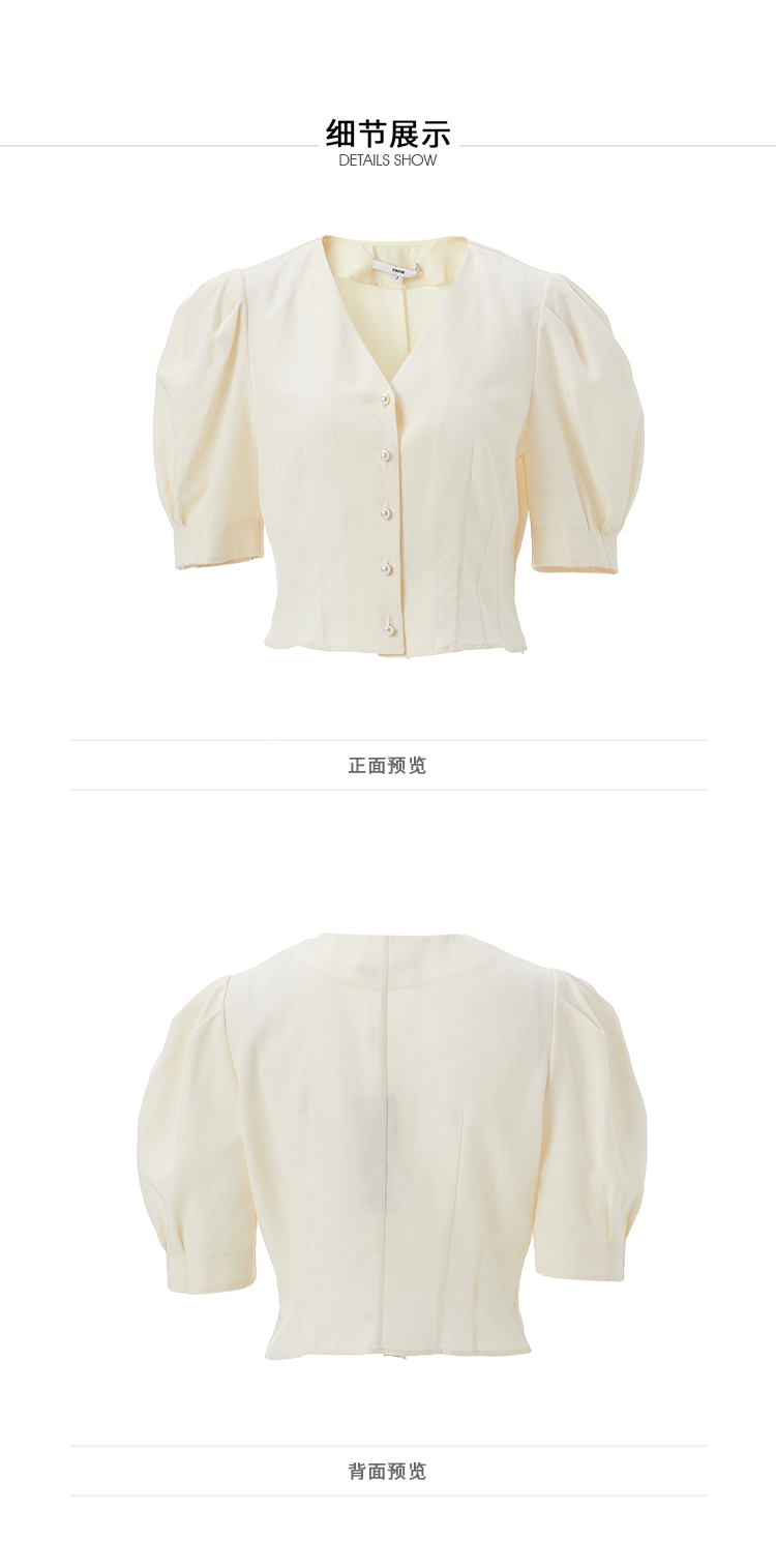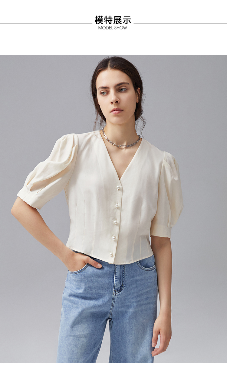 VIMAGE纬漫纪夏季新款V领设计泡泡袖修身短袖小上衣女T恤V1509134
