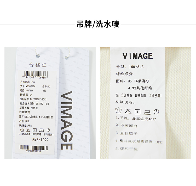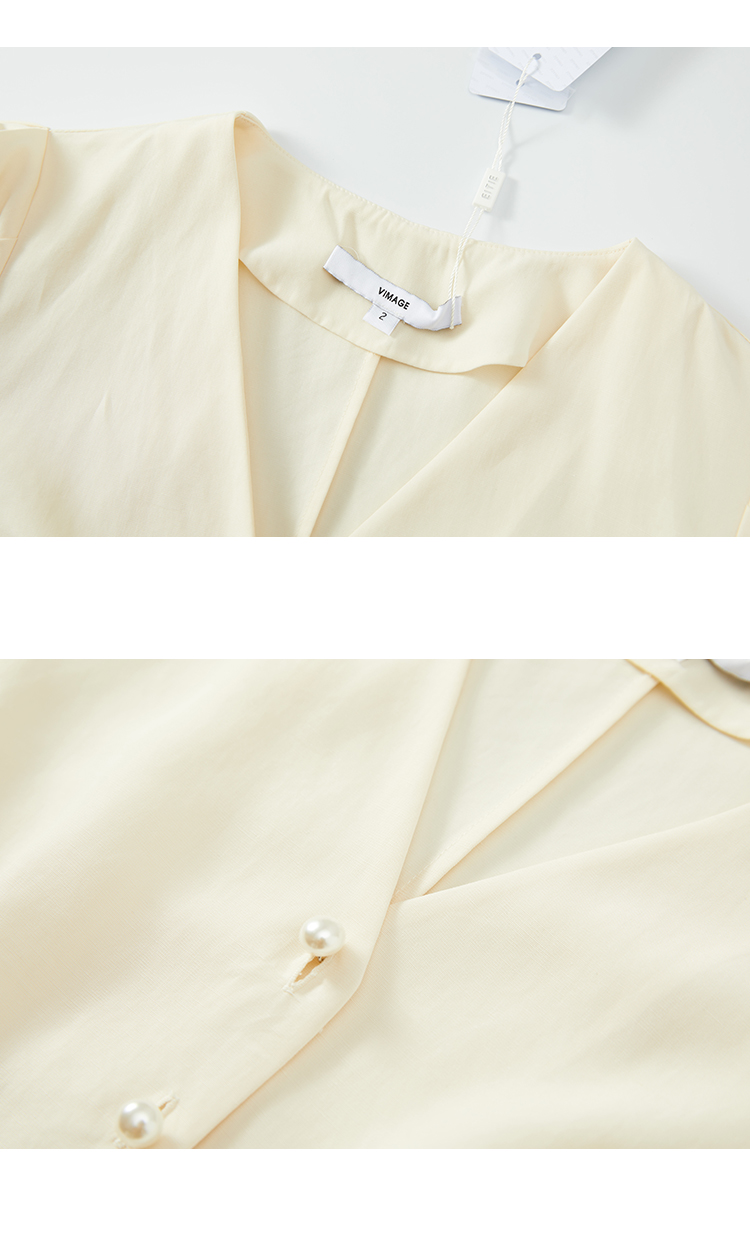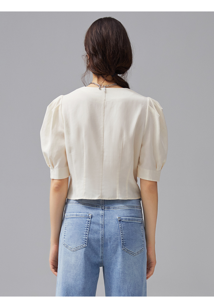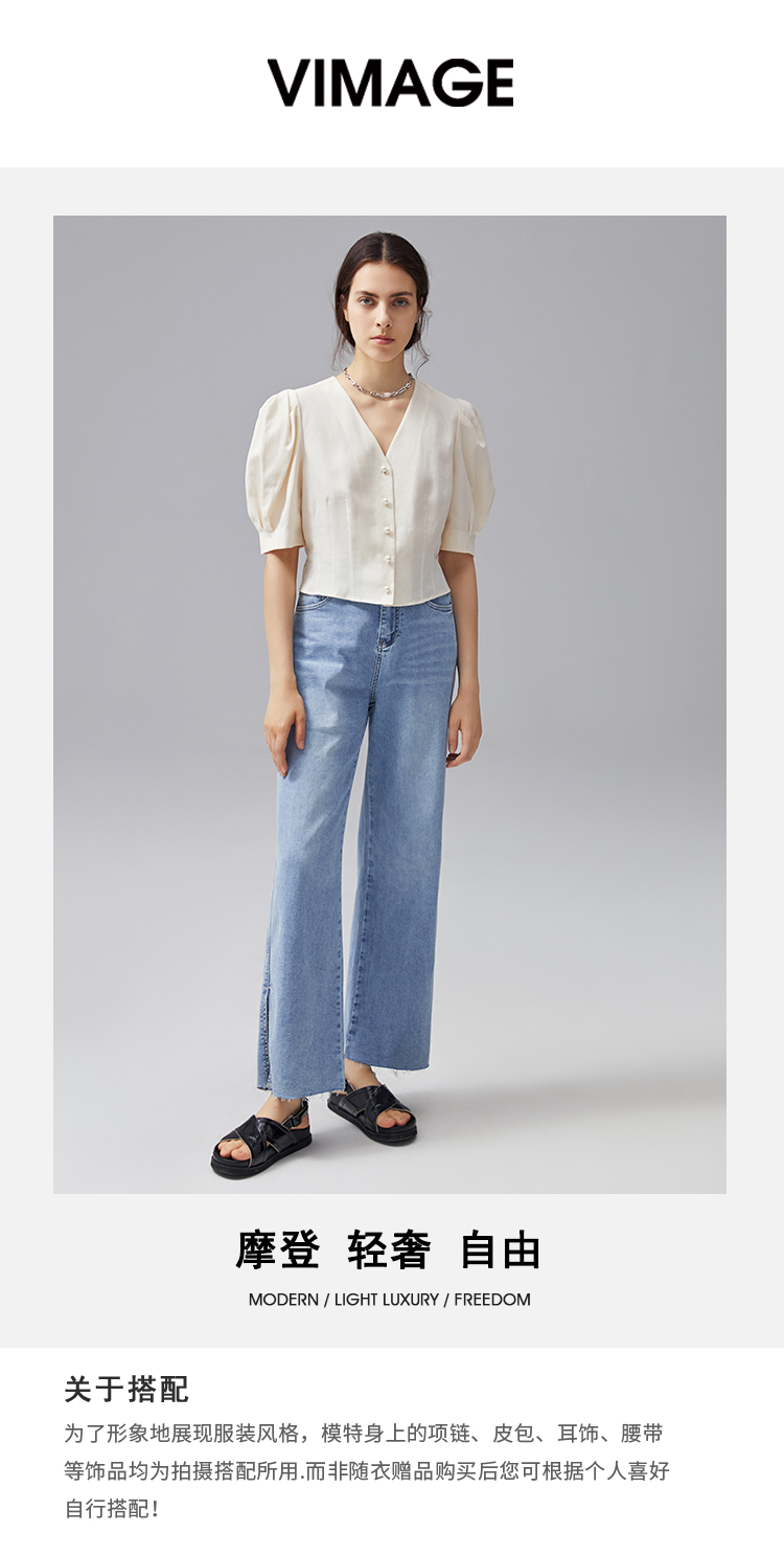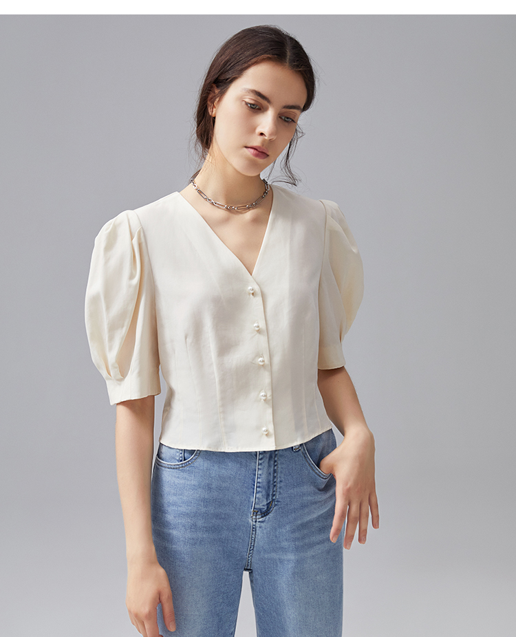 VIMAGE纬漫纪夏季新款V领设计泡泡袖修身短袖小上衣女T恤V1509134