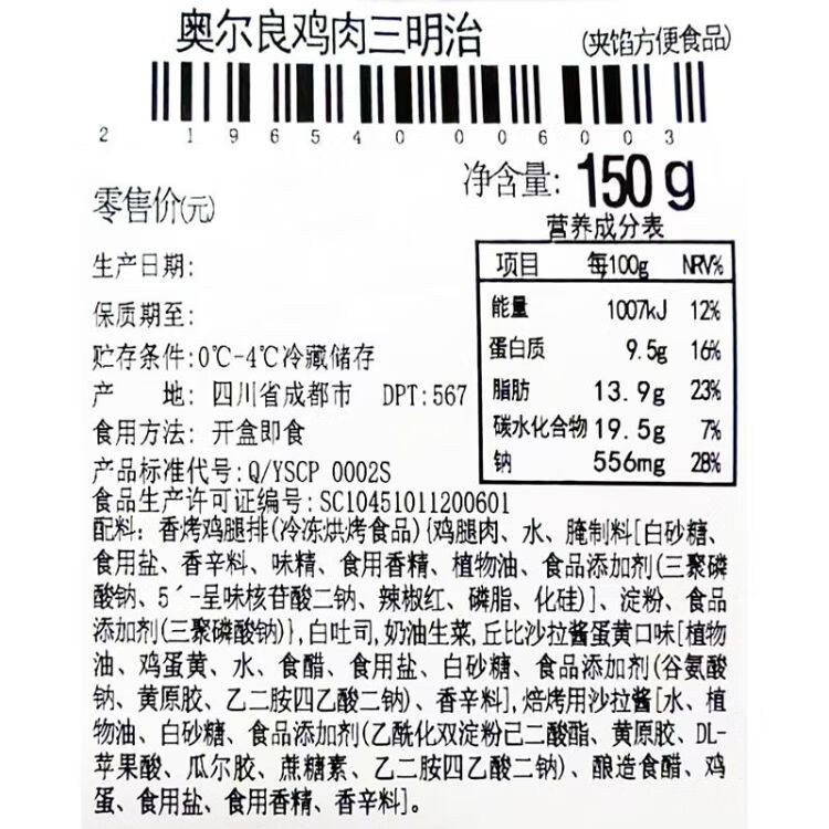 奥尔良鸡肉三明治150g(快餐)