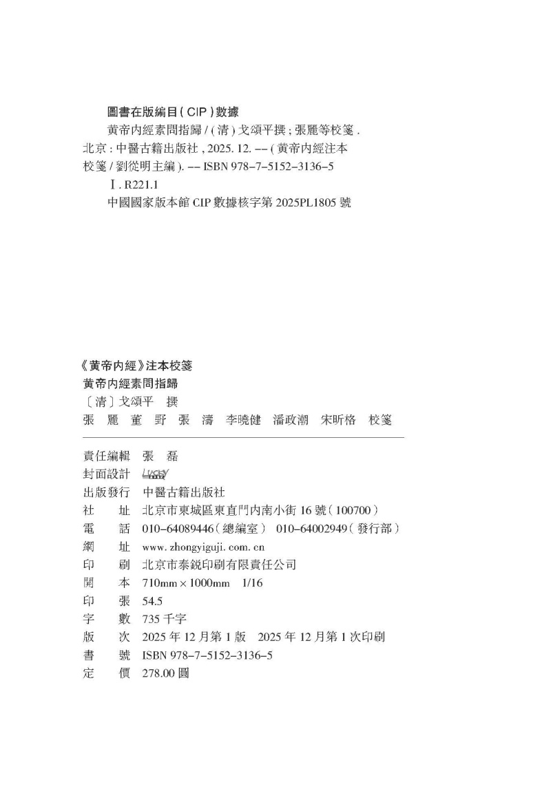 黄帝内经素问指归《黄帝内經》注本校箋 [清]戈頌平 撰 张丽 董野 张涛 李晓健 潘政潮 宋昕格 校箋 9787515231365中医古籍出版社