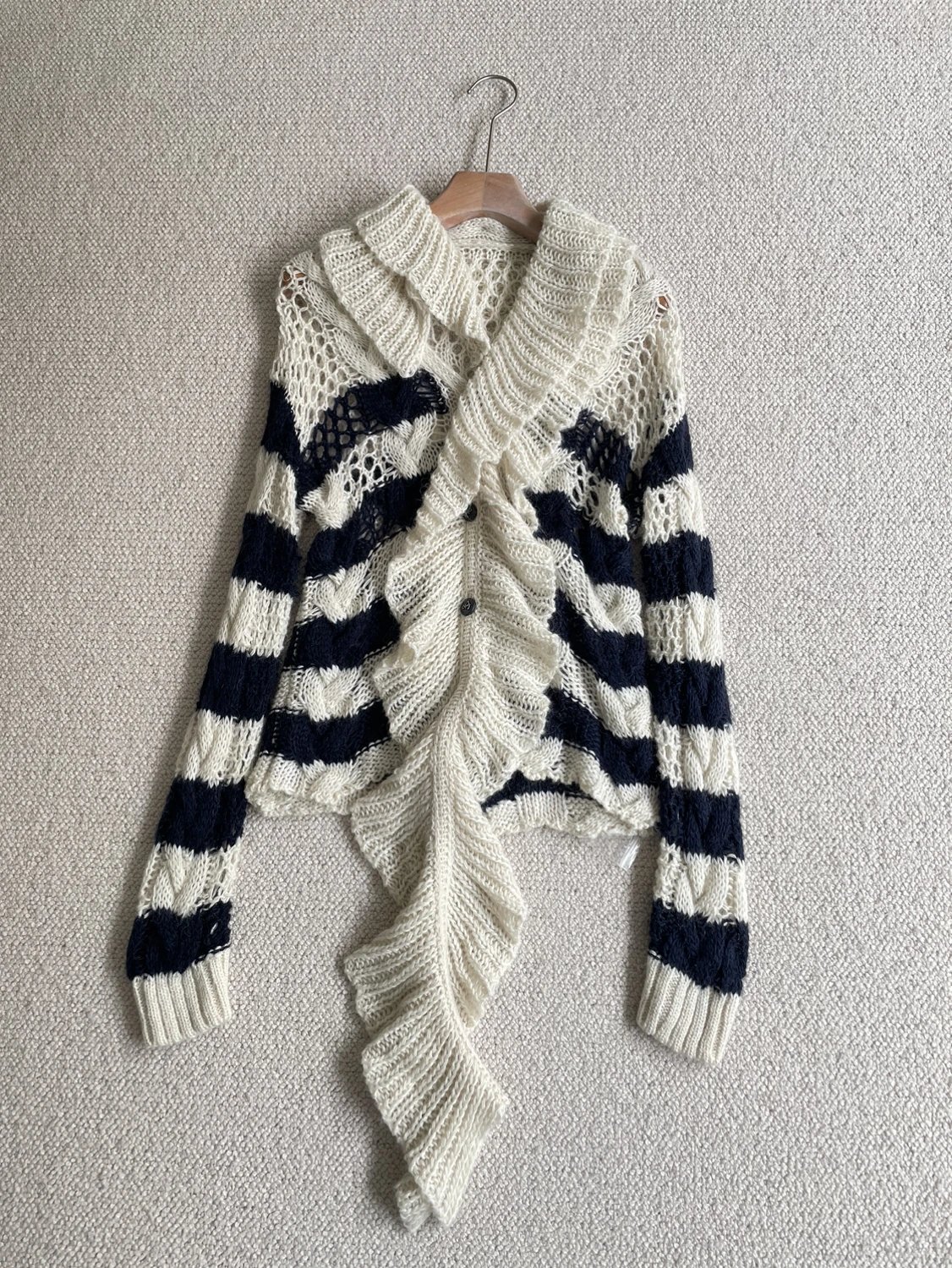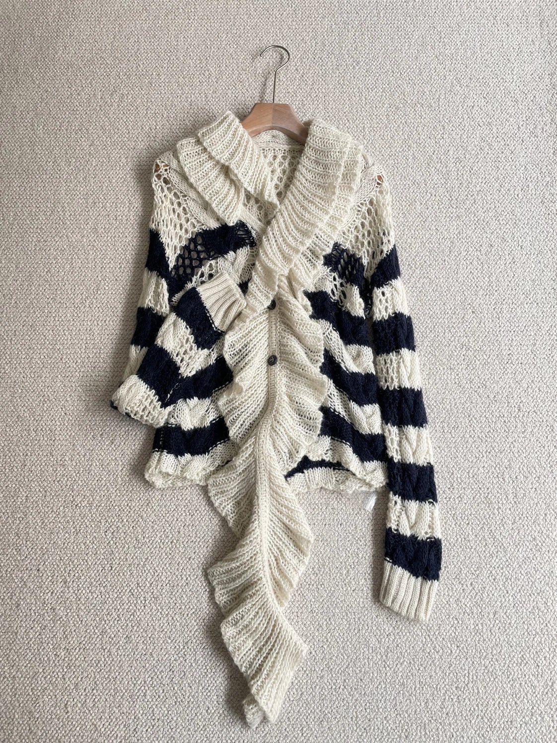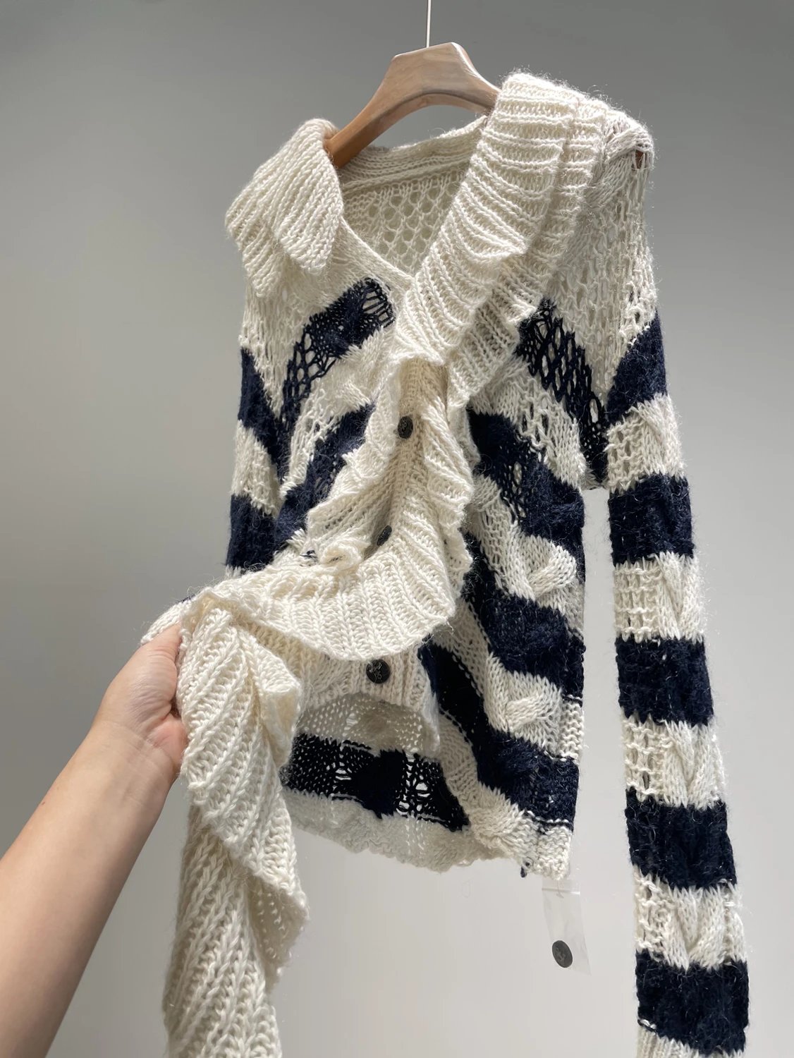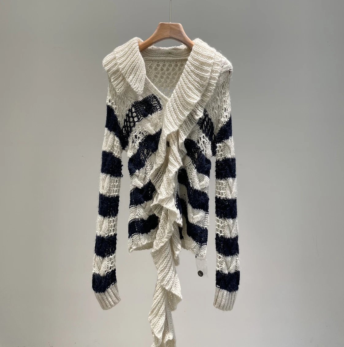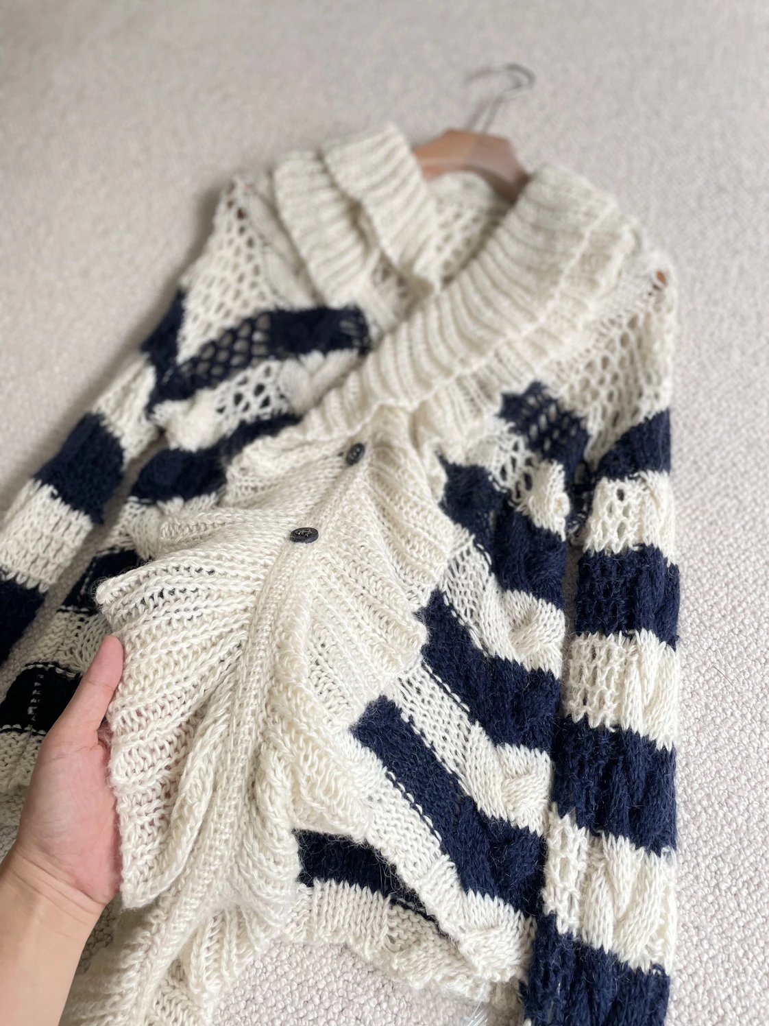 双11福利款 可拆卸荷叶领开衫 亚麻马海毛 条纹镂空针织衫