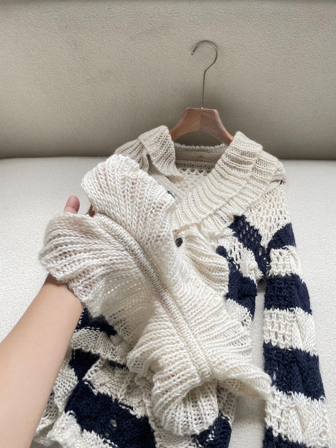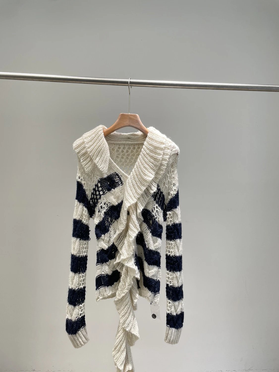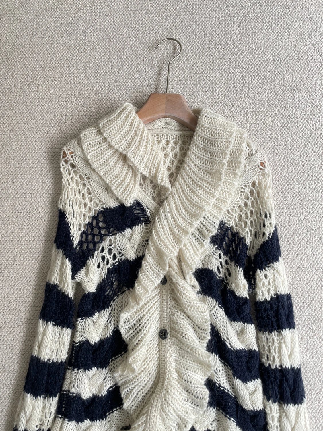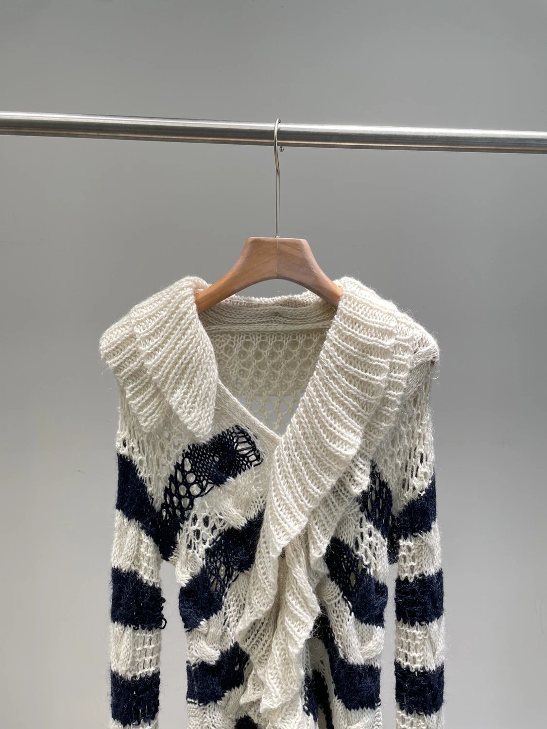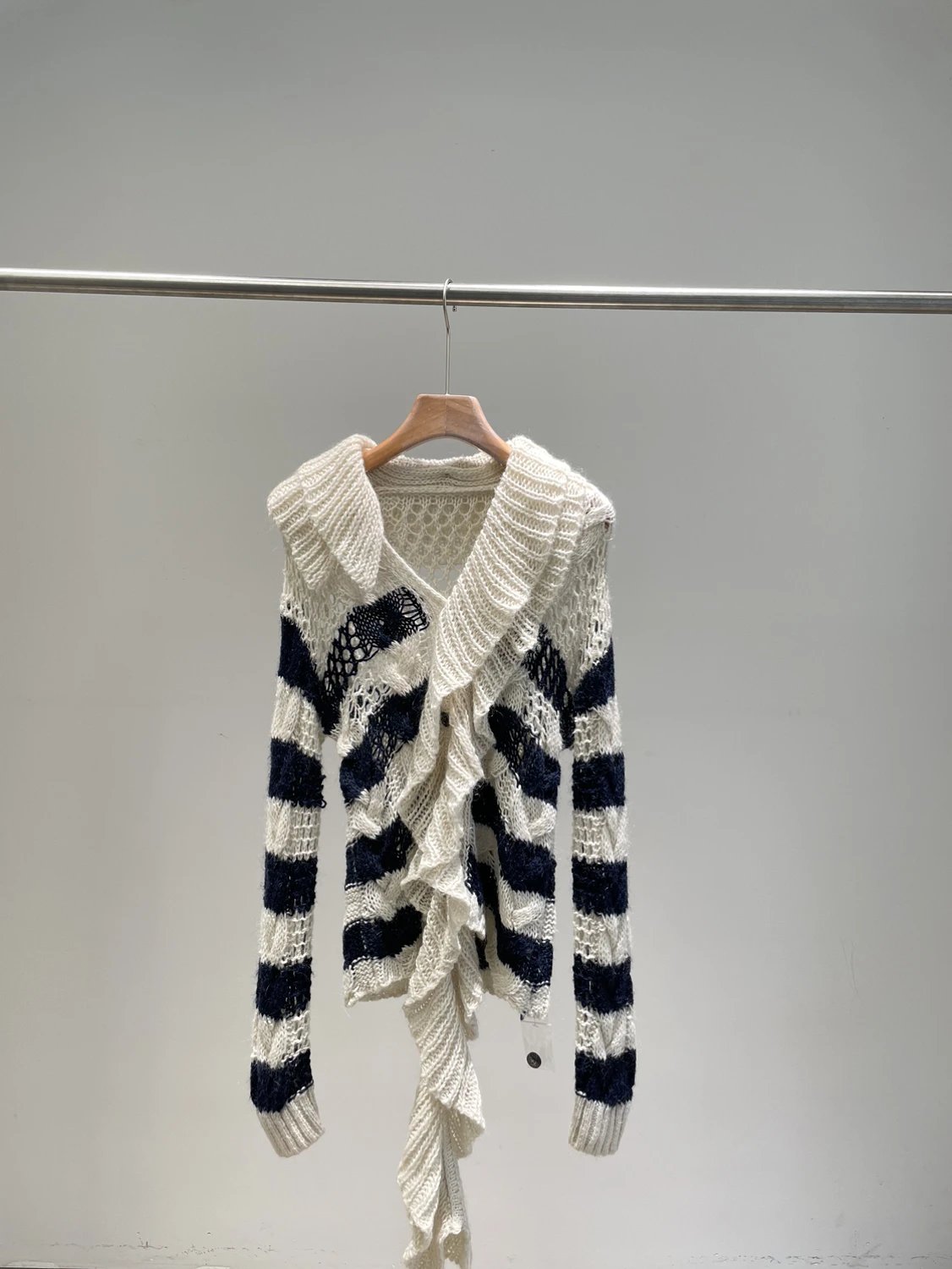 双11福利款 可拆卸荷叶领开衫 亚麻马海毛 条纹镂空针织衫