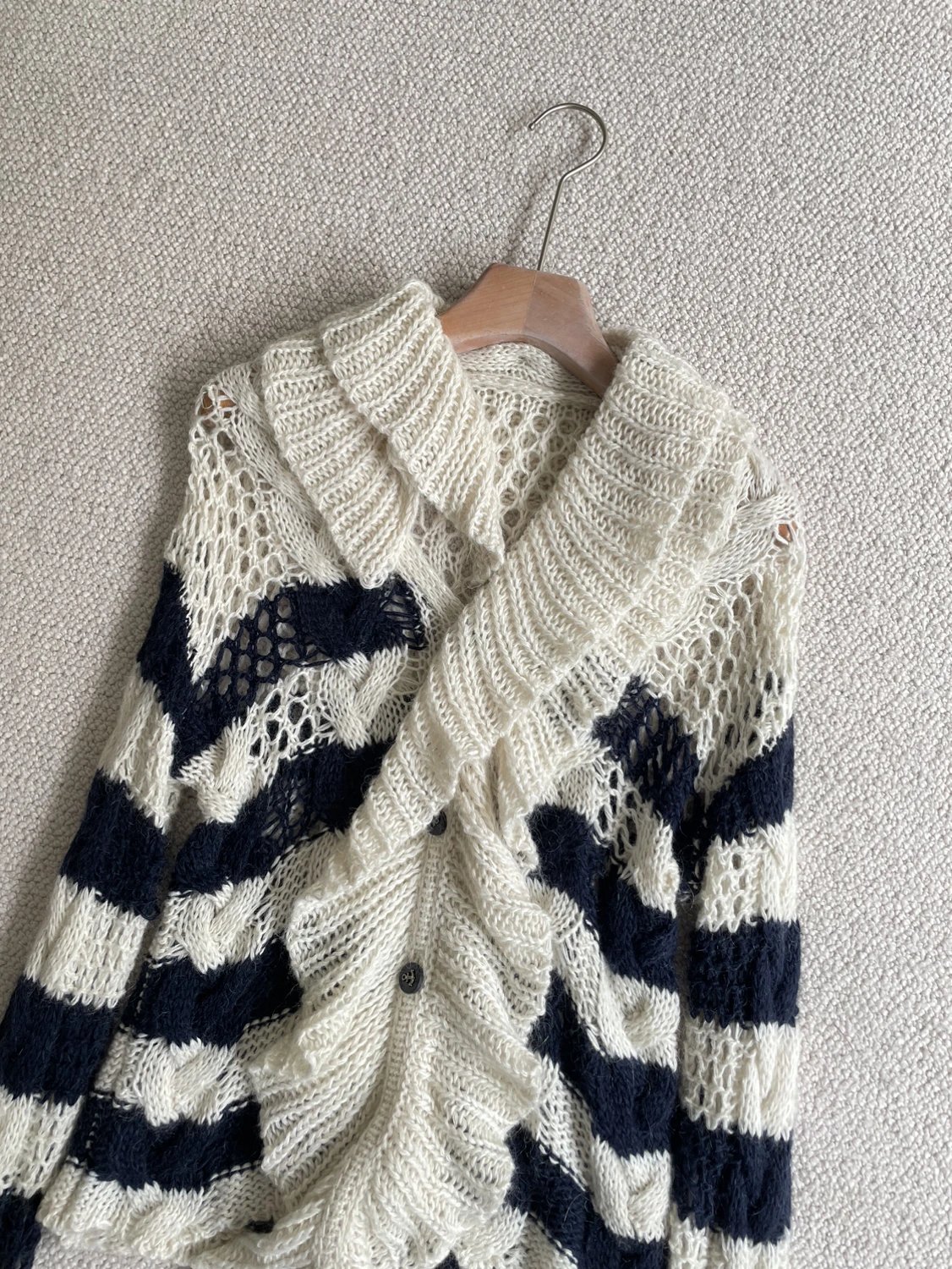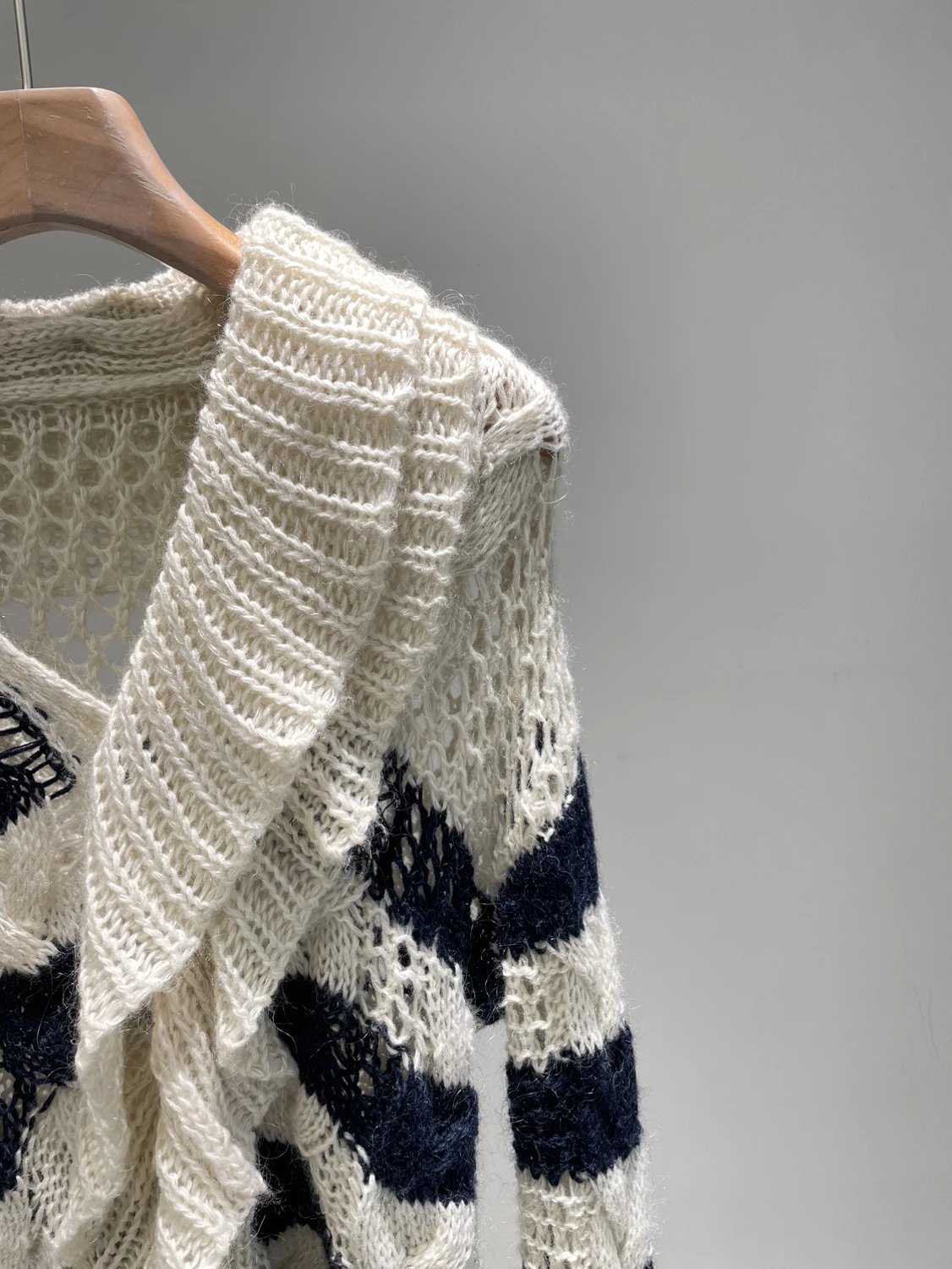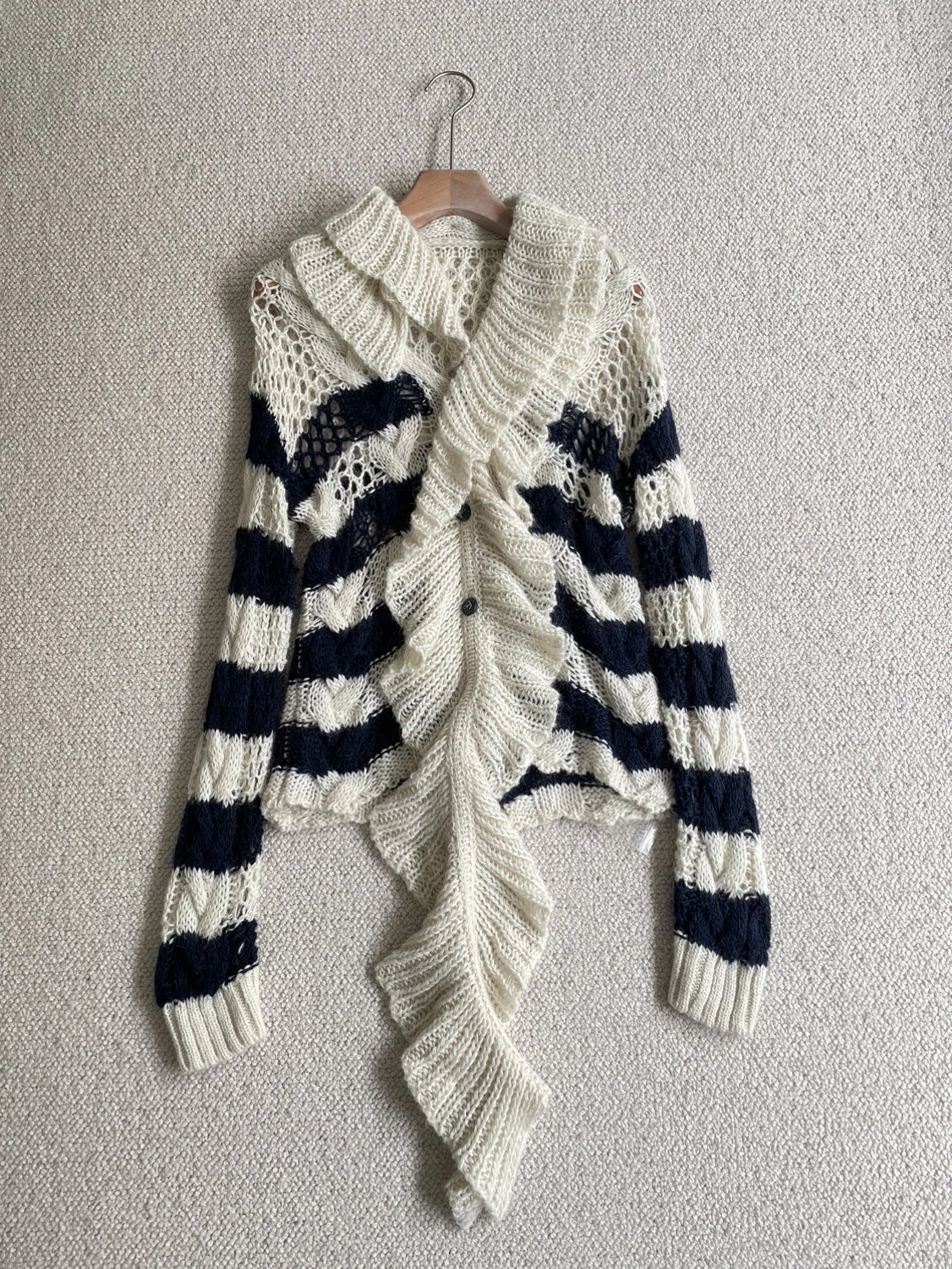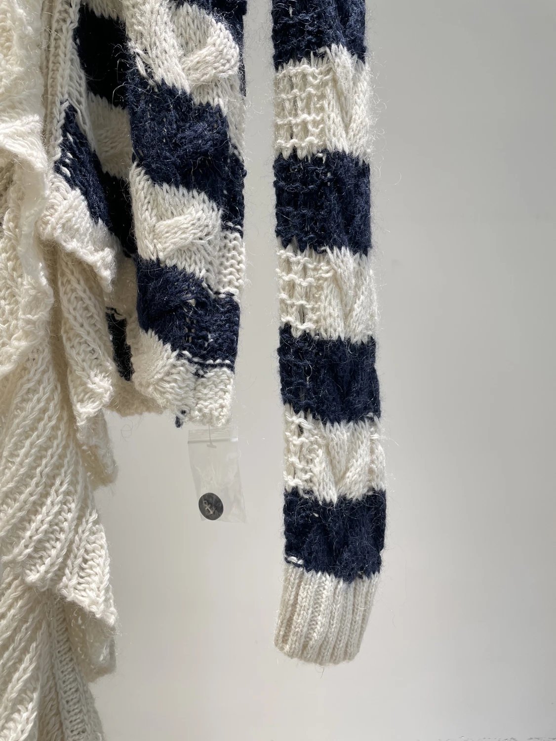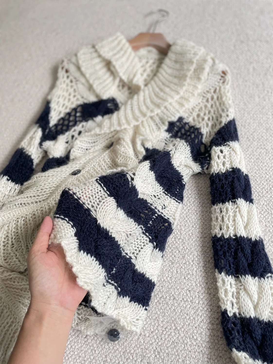 双11福利款 可拆卸荷叶领开衫 亚麻马海毛 条纹镂空针织衫