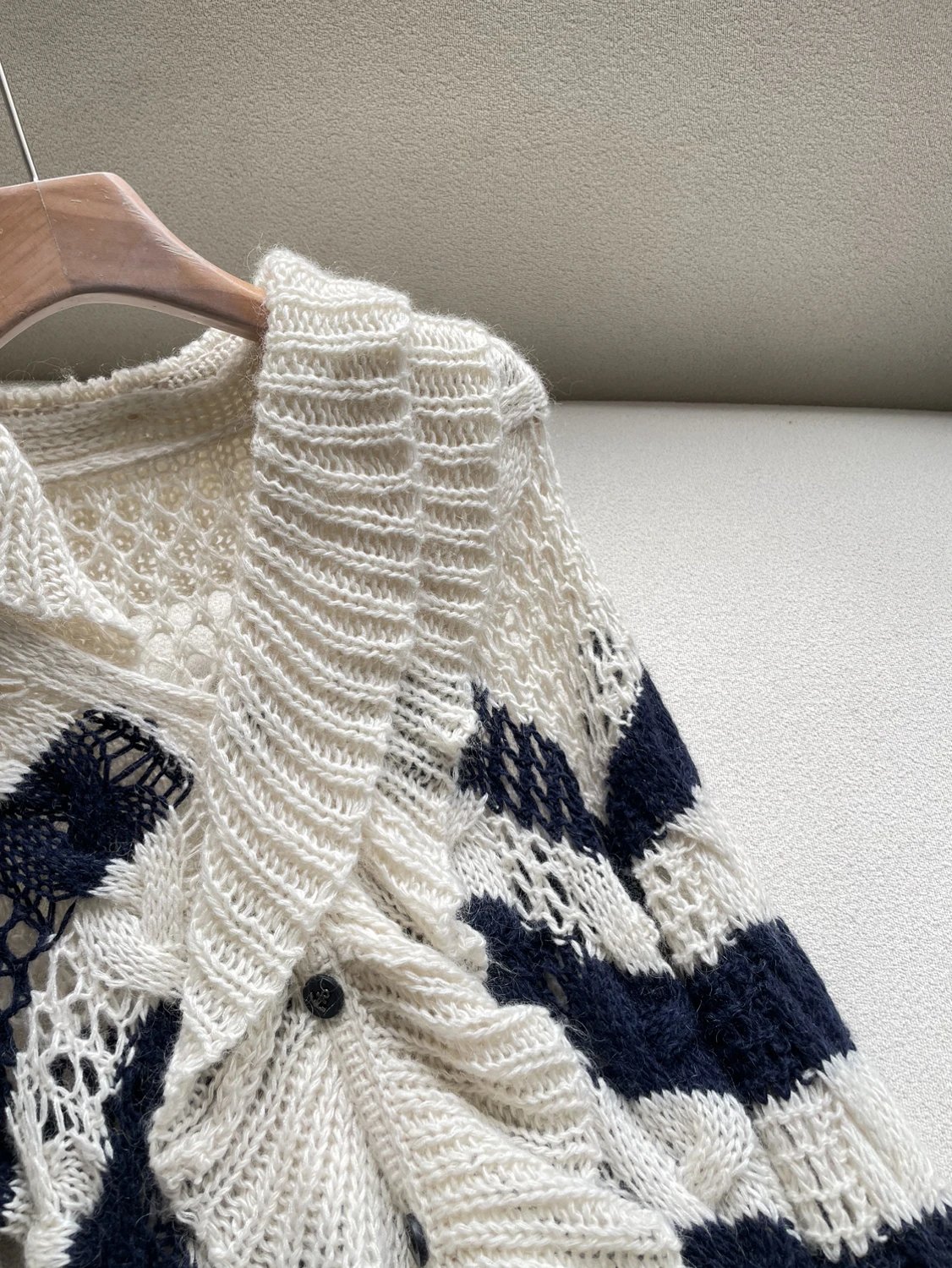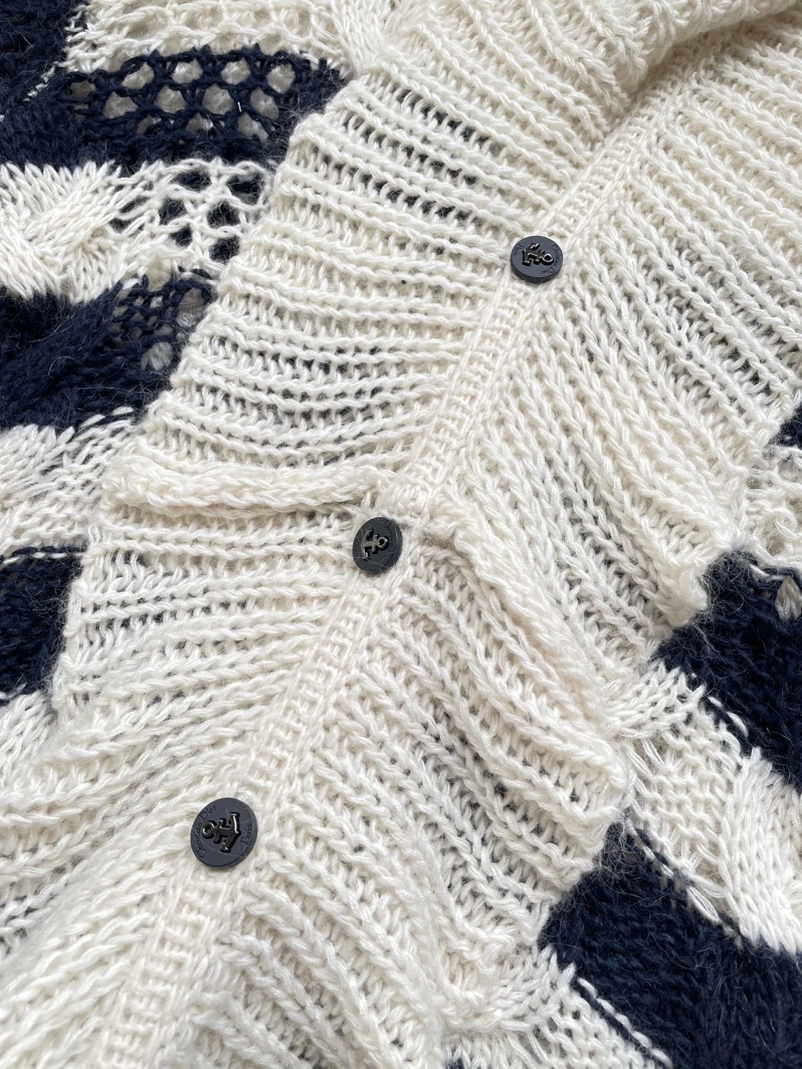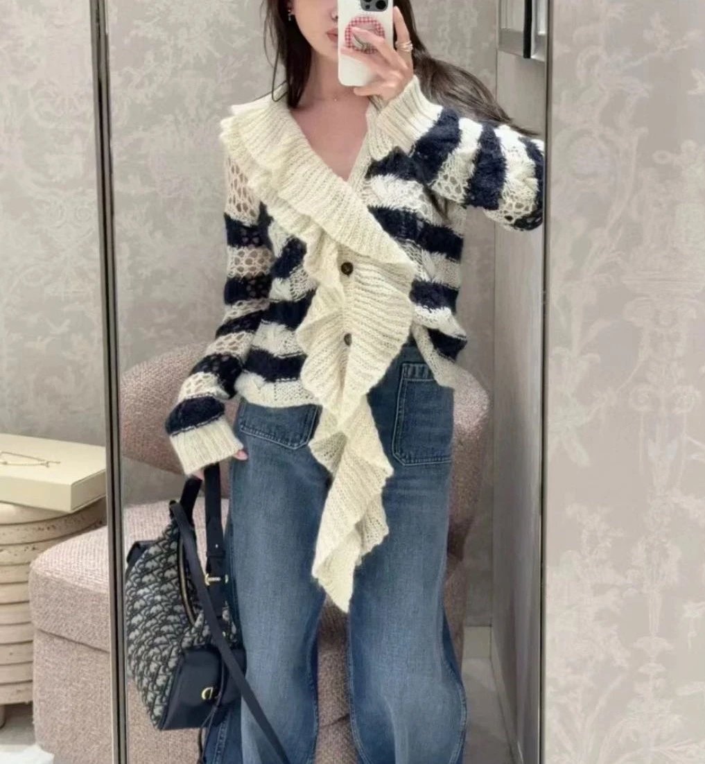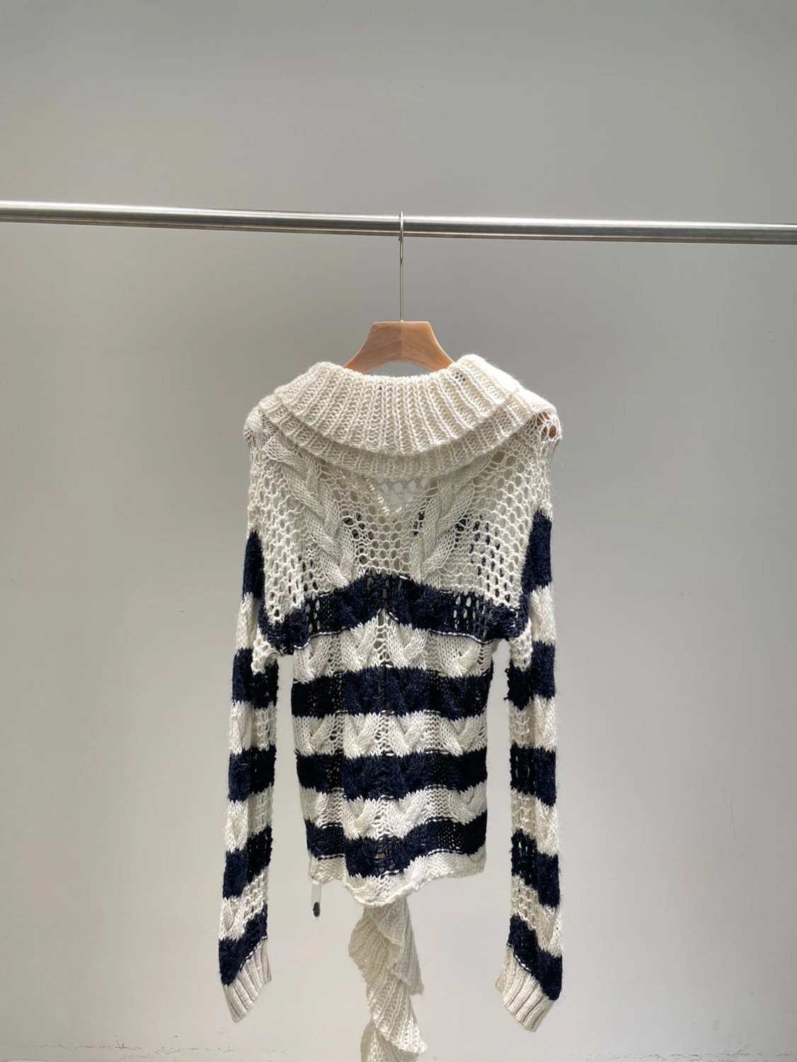 双11福利款 可拆卸荷叶领开衫 亚麻马海毛 条纹镂空针织衫