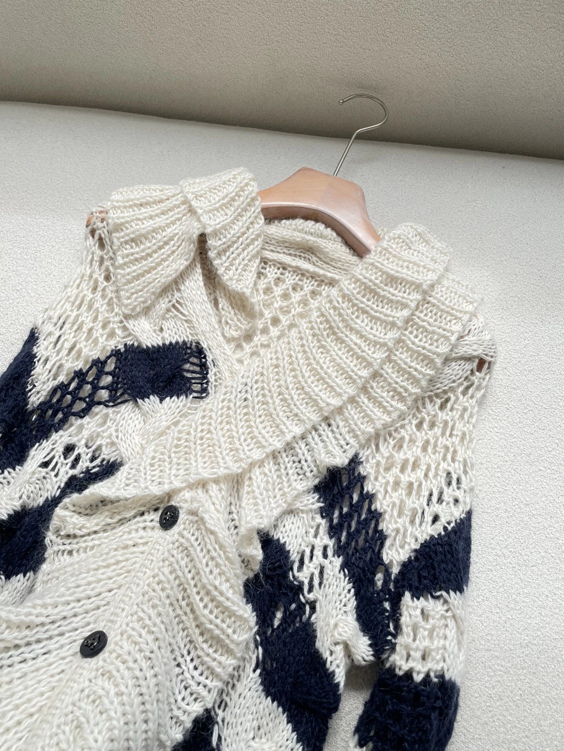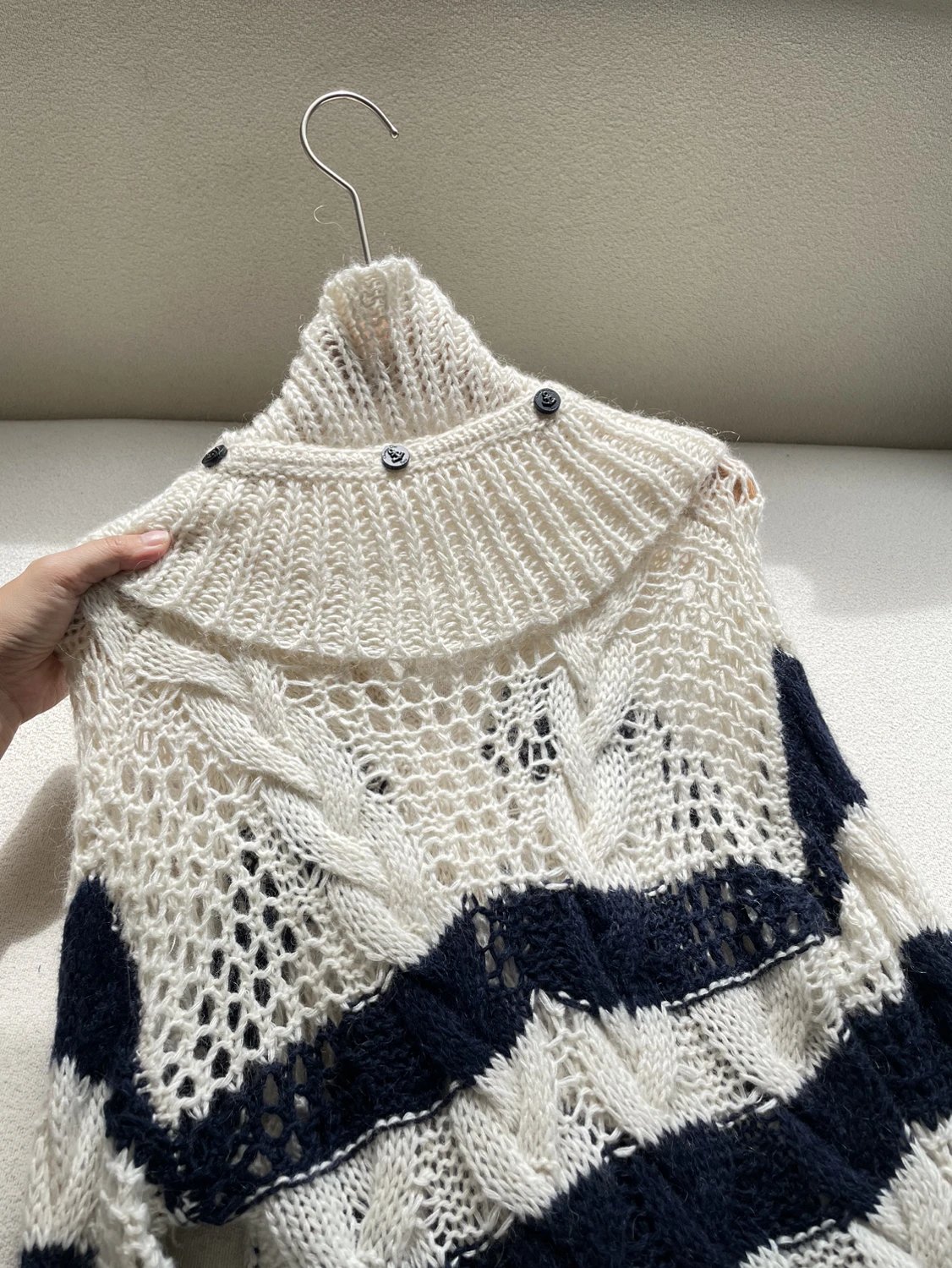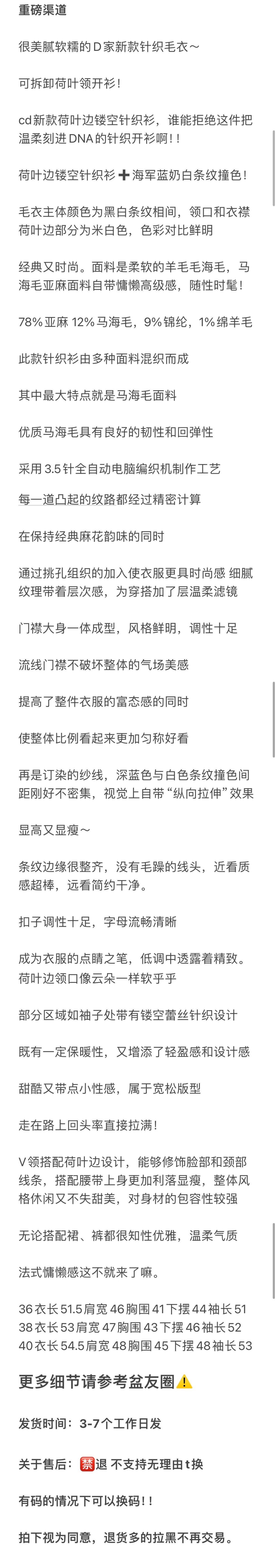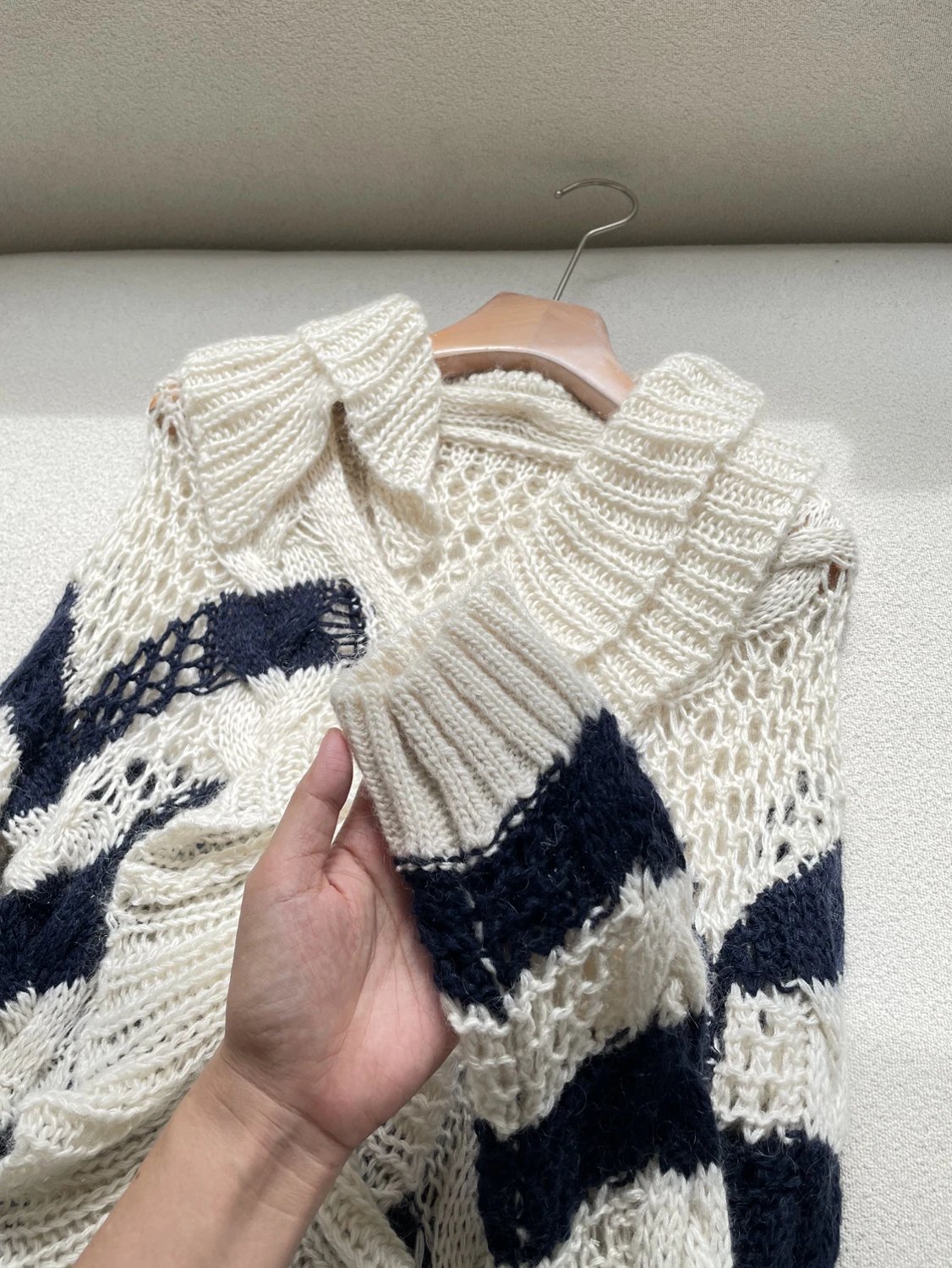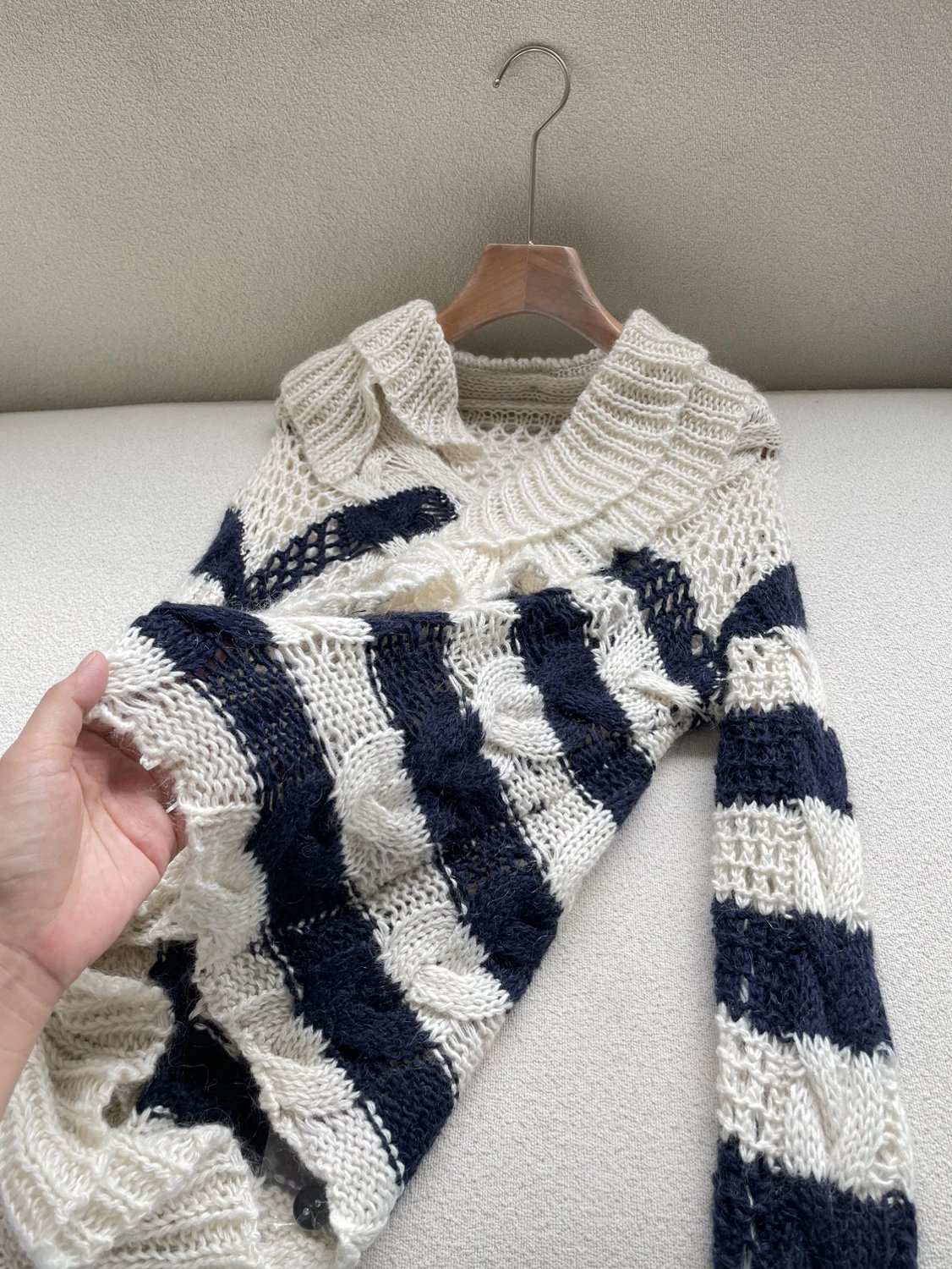 双11福利款 可拆卸荷叶领开衫 亚麻马海毛 条纹镂空针织衫