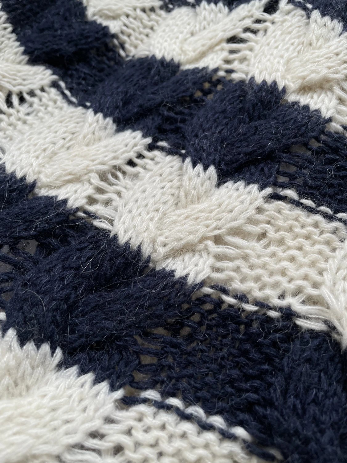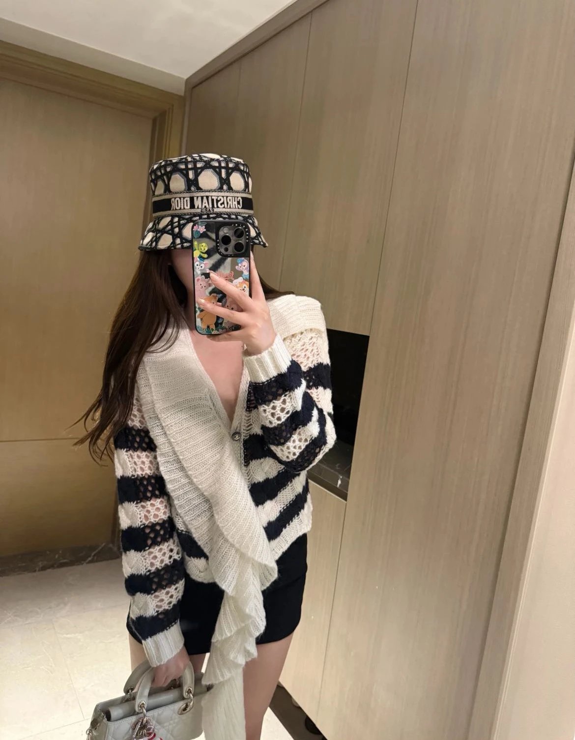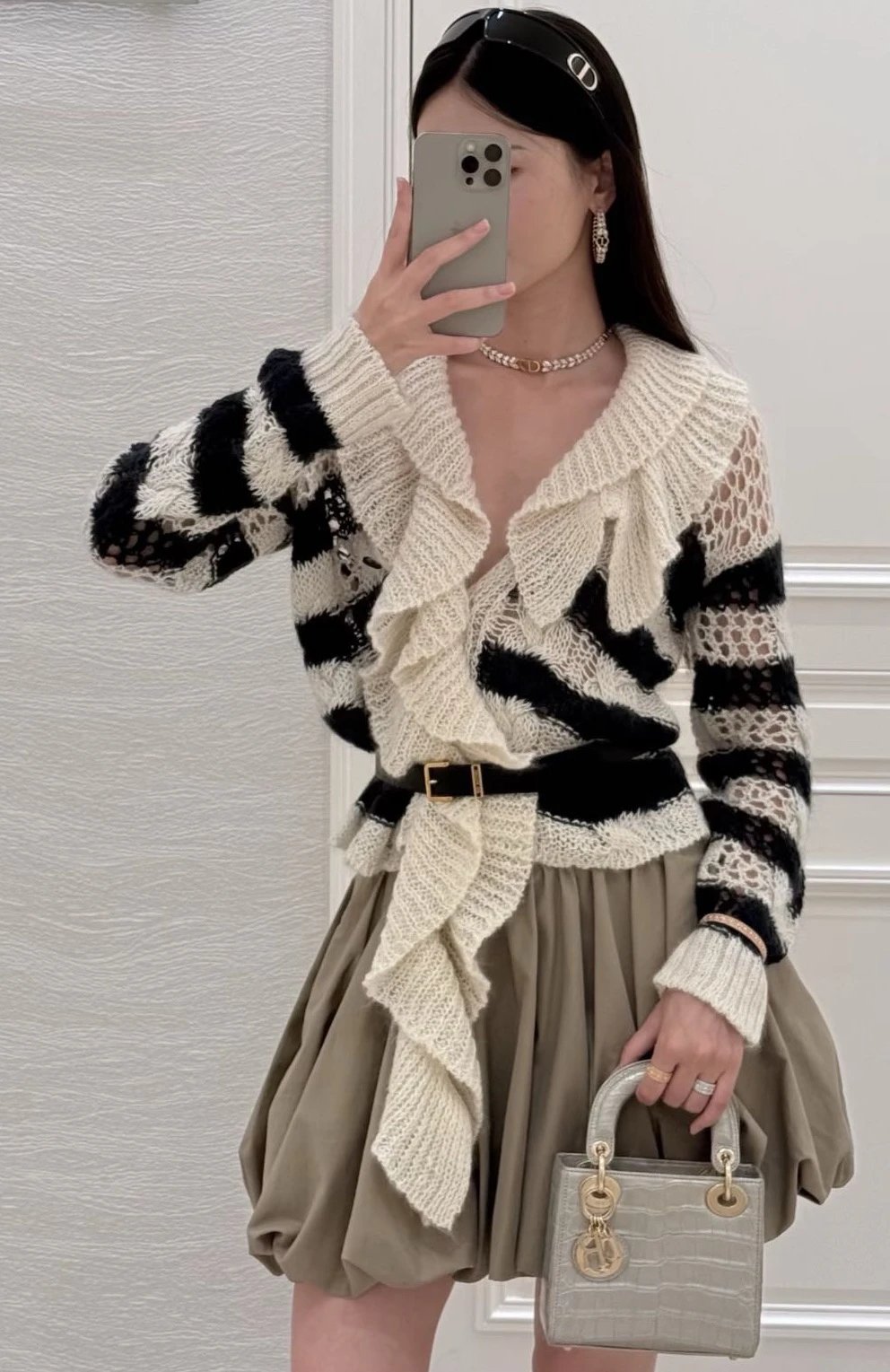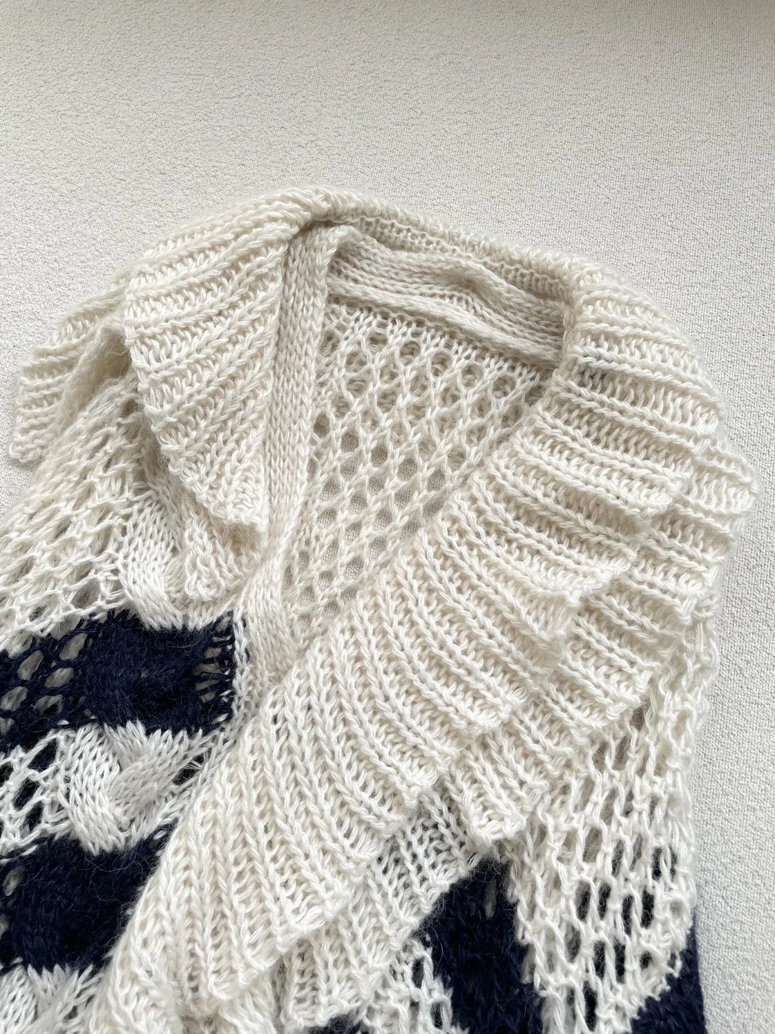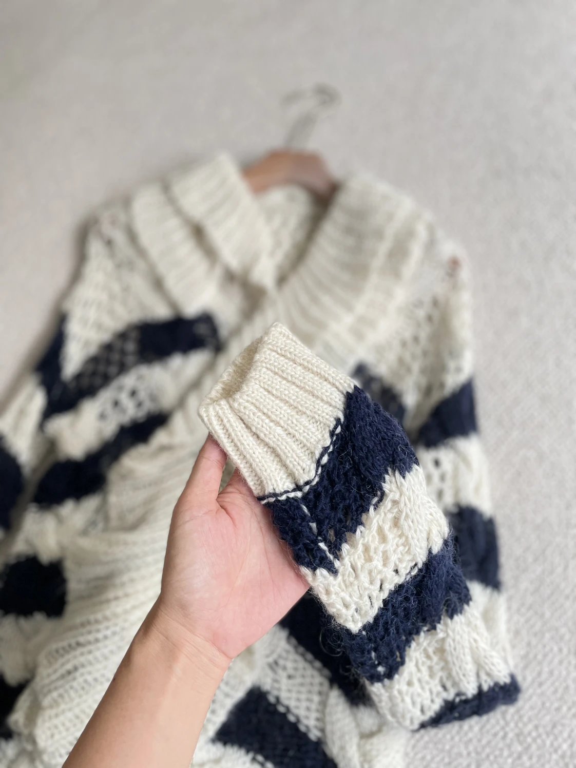 双11福利款 可拆卸荷叶领开衫 亚麻马海毛 条纹镂空针织衫