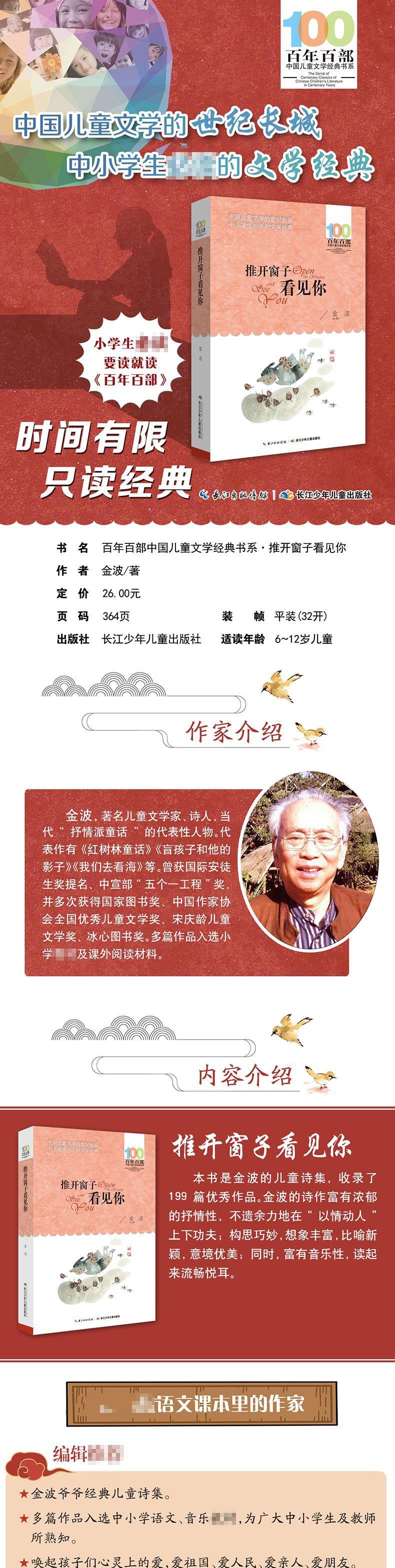 《推开窗子看见你/百年百部中国儿童文学经典书系》是金波的儿童诗集,收录了《春的消息》《献给母亲的花环》等199篇很好作品。