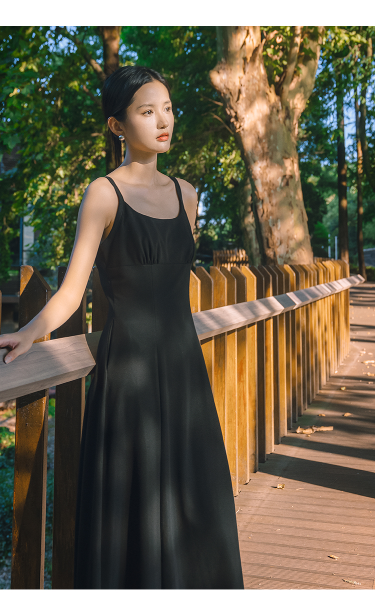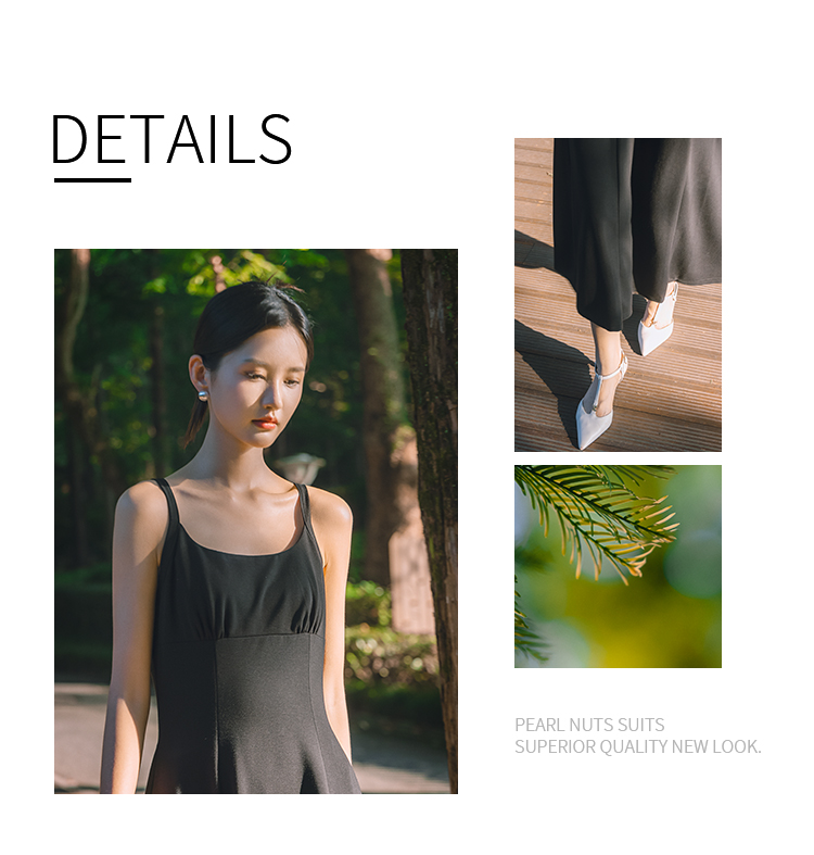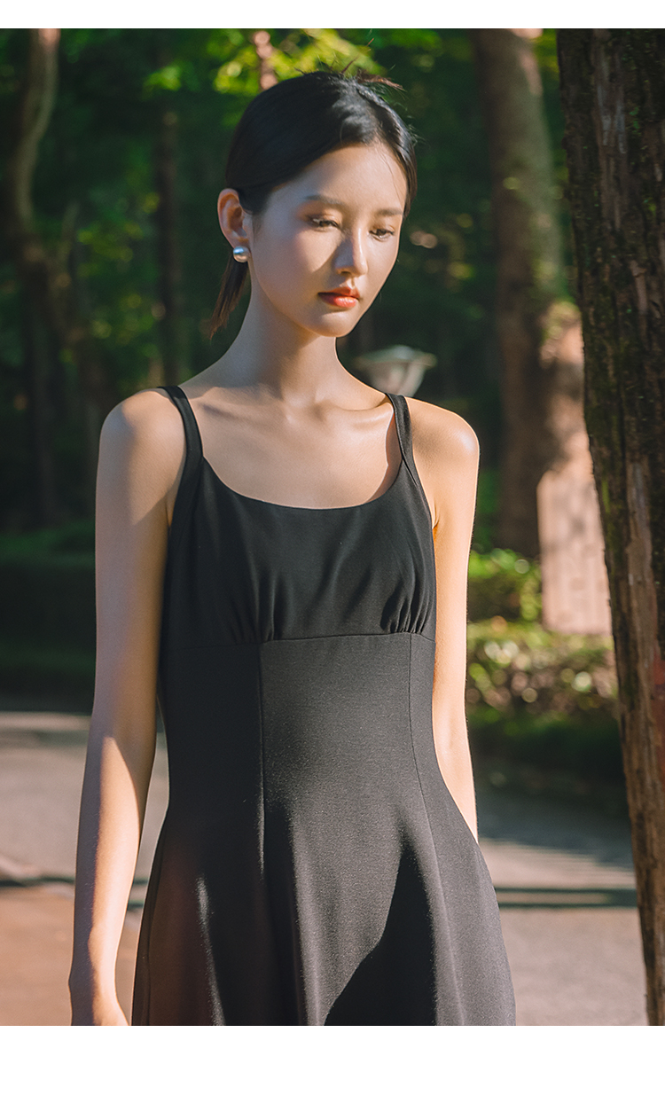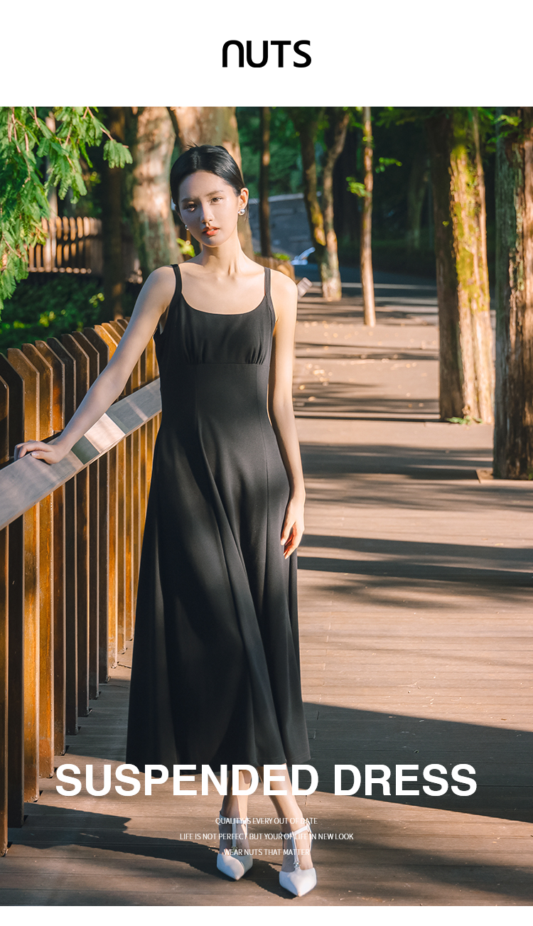 NUTS法式收腰吊带连衣裙女秋季小个子显瘦黑色中长裙4311011A1