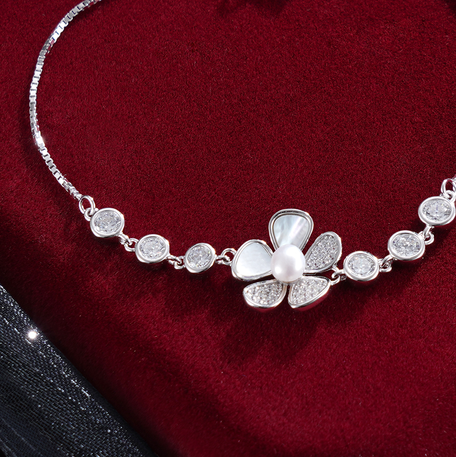 【寓意】:贝母凝瓣,珍珠为芯,组合成绽放的立体花朵,点缀于纯银手链之上,更显轻盈甜美。一款无比适合夏天的手链,银光闪闪,流幻迷人。