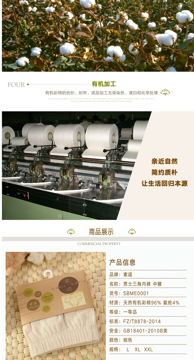 航.素道有机彩棉 男士内裤 U凸囊袋三角裤 棕色SBME01