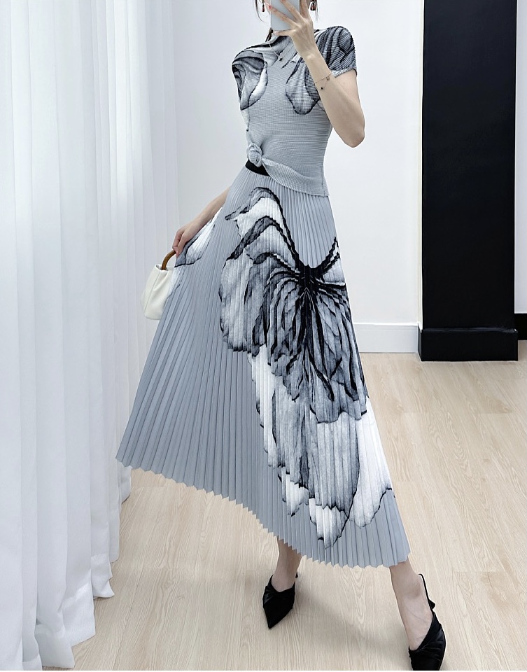 女压褶双肩花裙 # 灰 浅绿 均码 夏季新款高端褶皱印花 百搭显瘦百褶半身裙