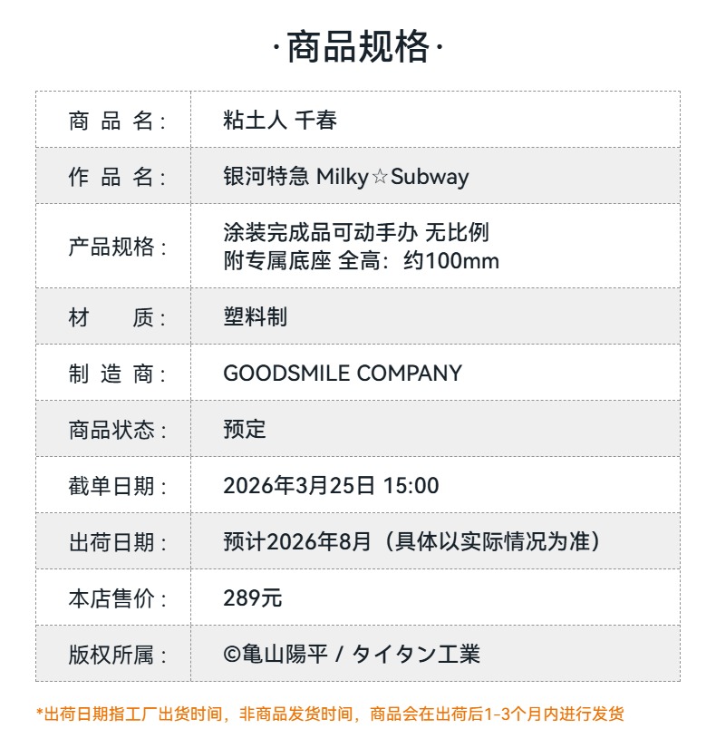 【GSC预售定金】粘土人 千春 银河特急 Milky Subway 附官方限定特典