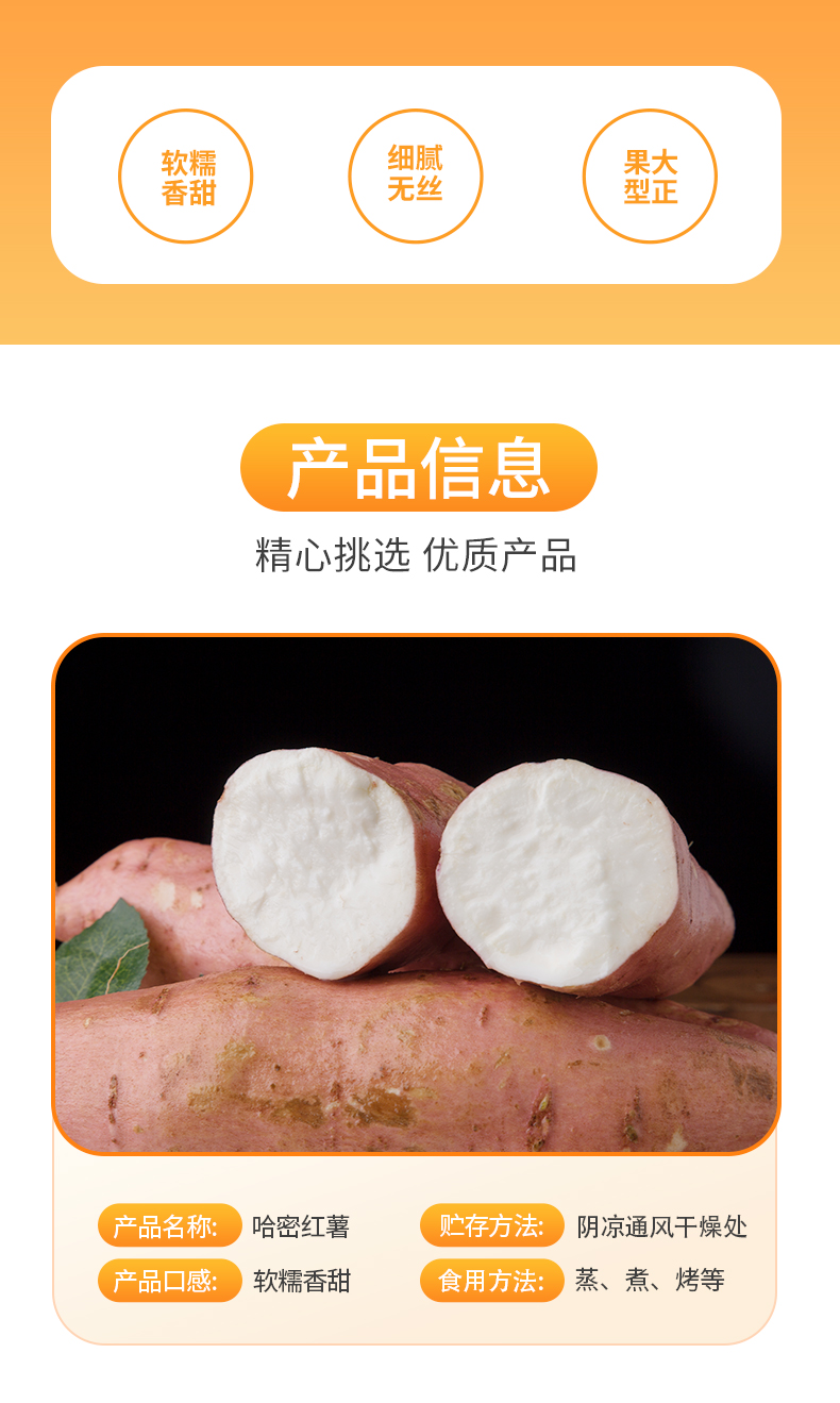 注意:1.红薯的储存温度10-15度,收到后请放置于通风防潮的地方,避免磕碰。这样放置时间才能稍微长一点(生鲜没有固定保质期,需自己观察,放坏不售后)。