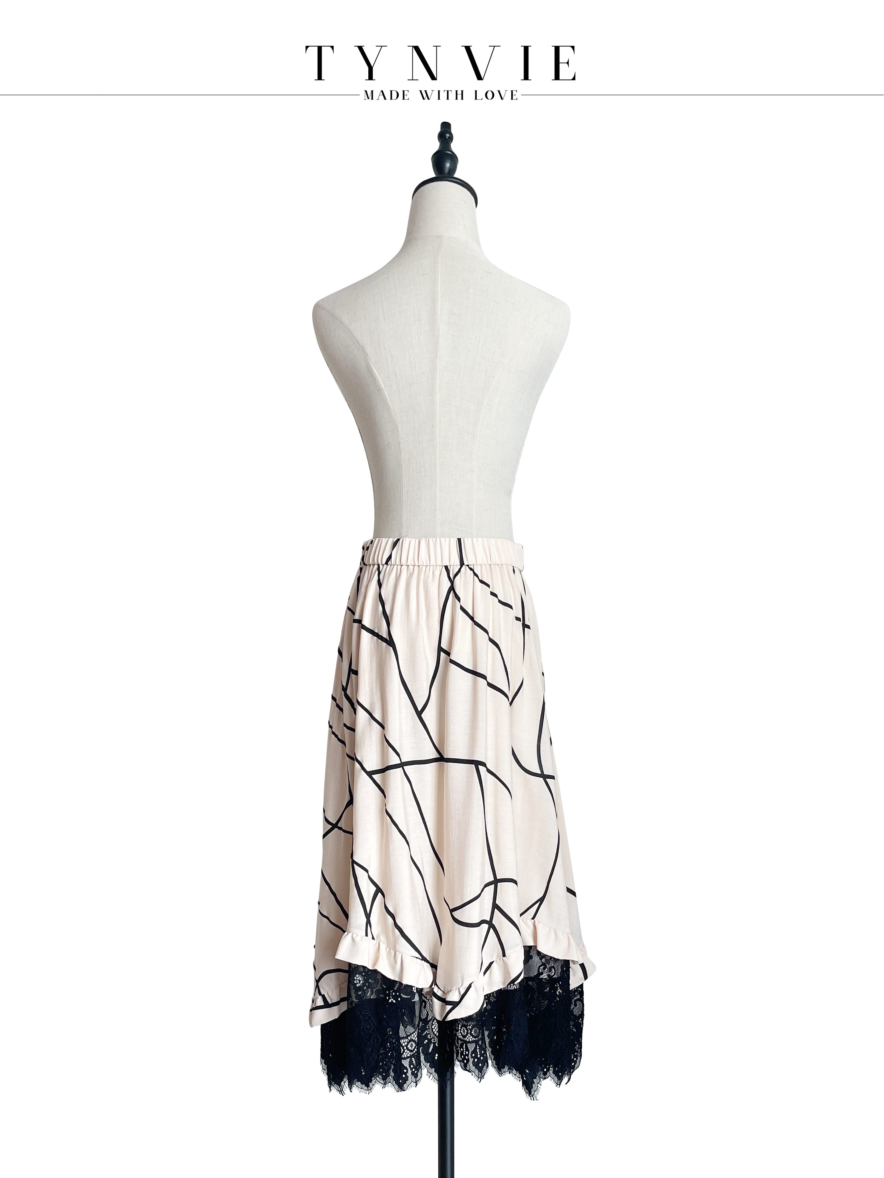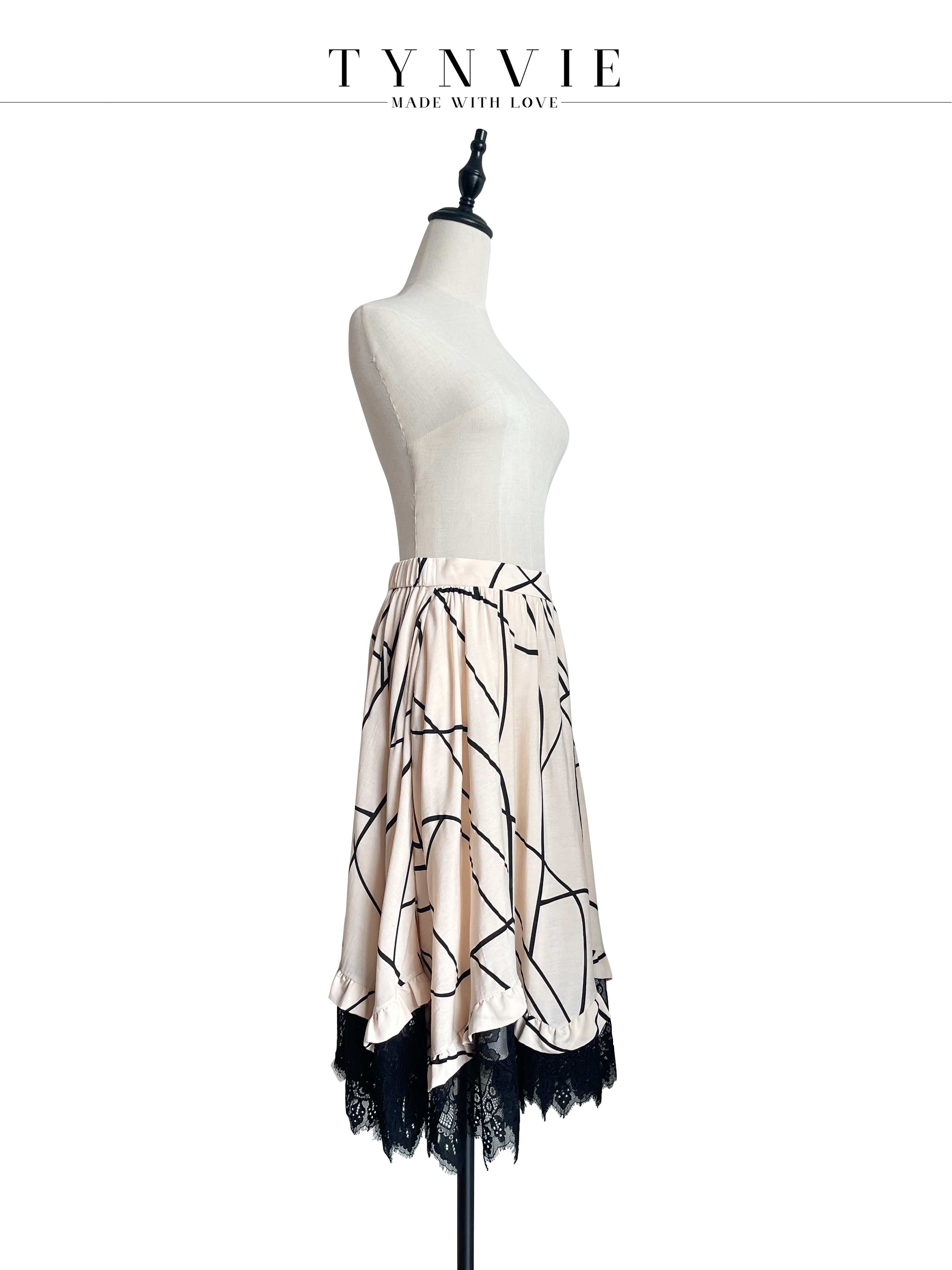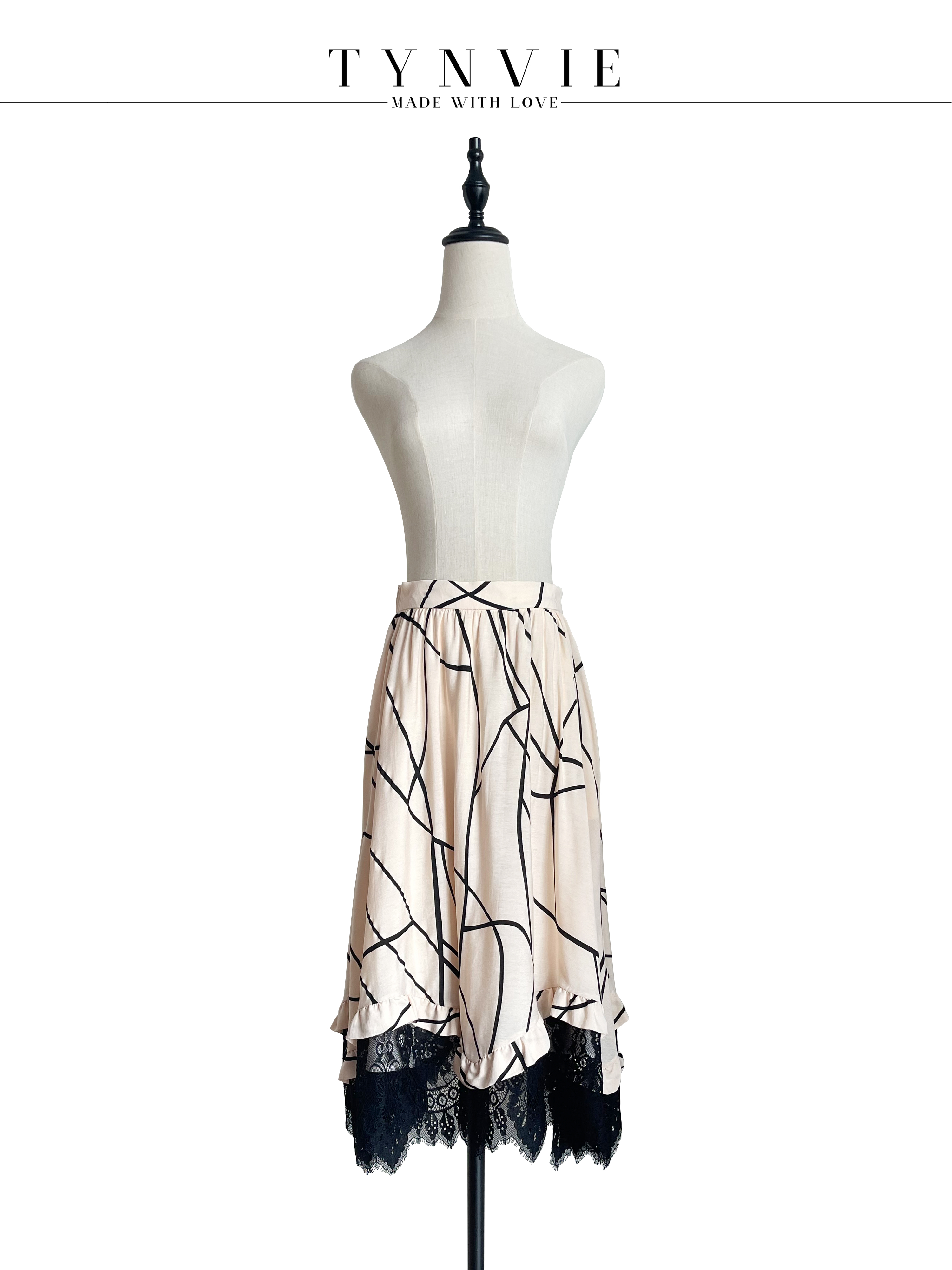 TYNVIE 波浪裙摆蕾丝拼接半身裙-印花