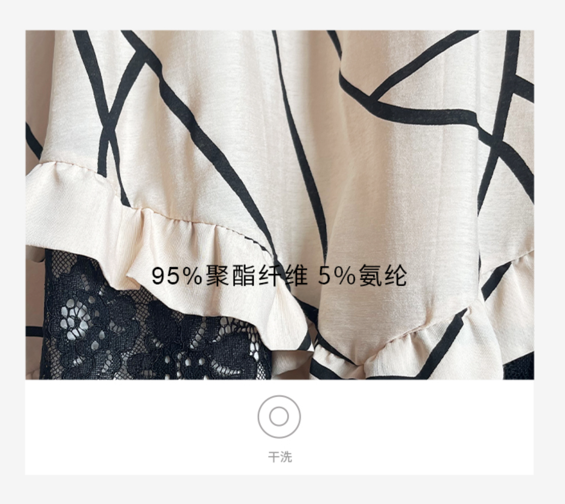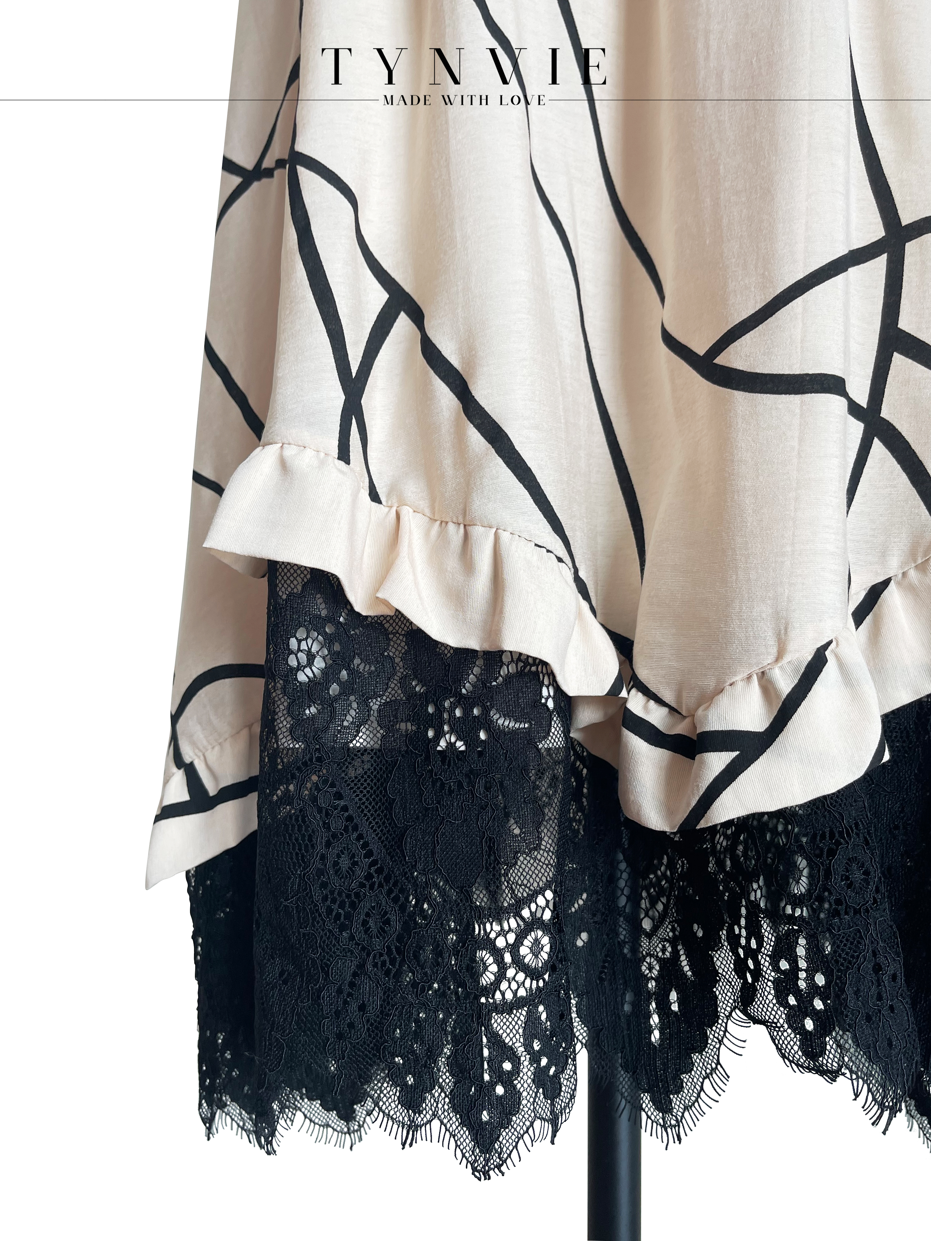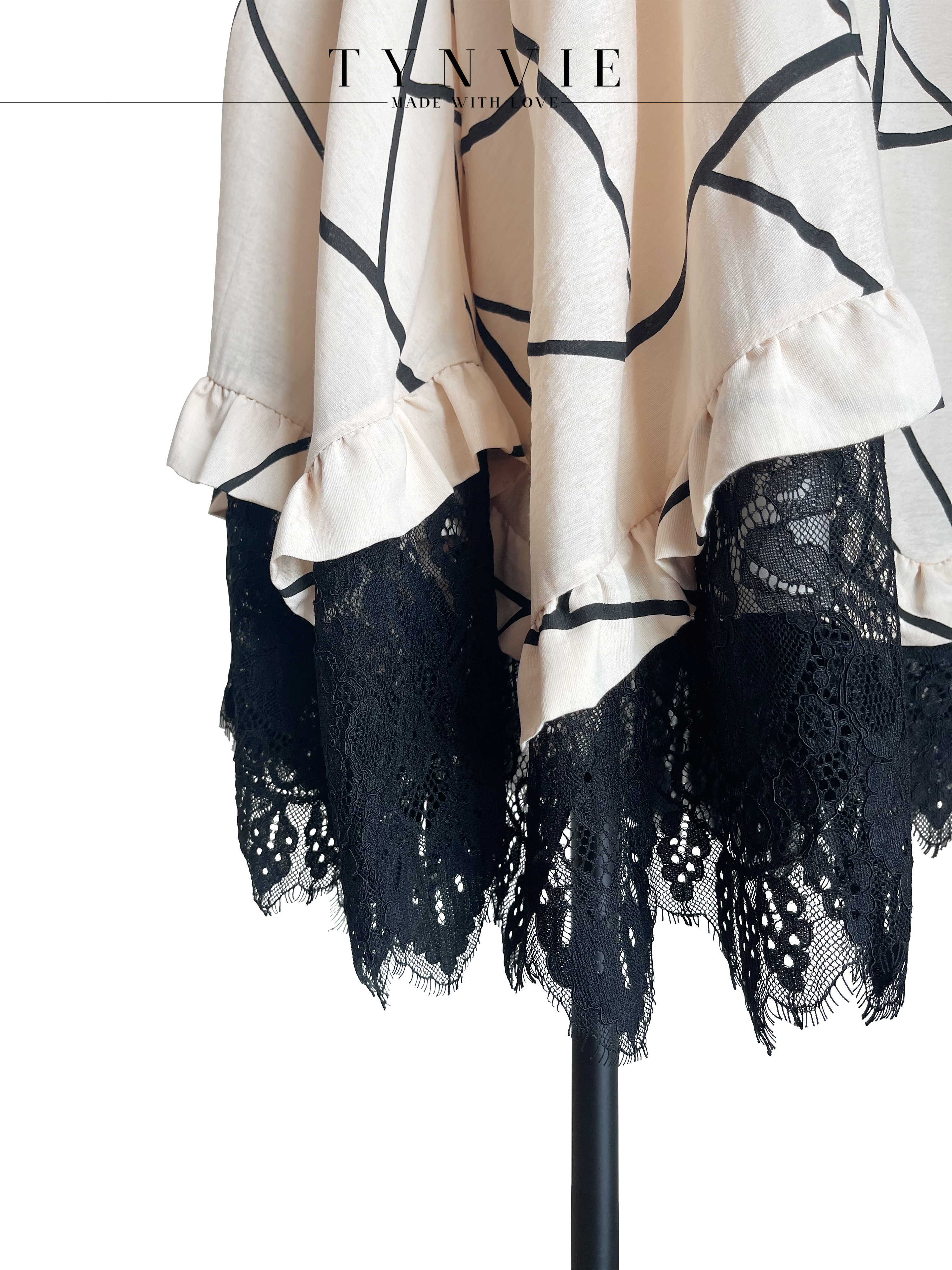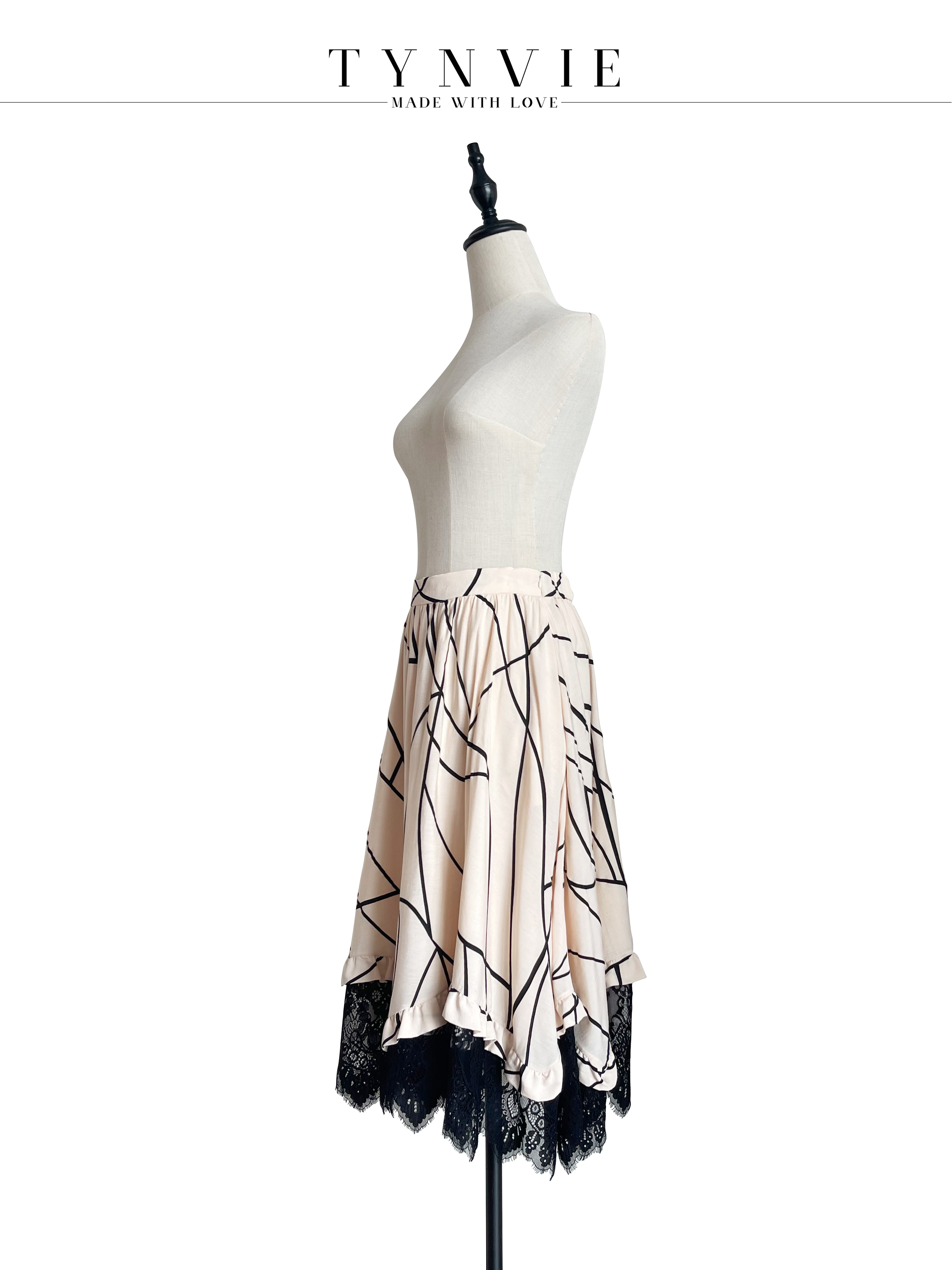 TYNVIE 波浪裙摆蕾丝拼接半身裙-印花