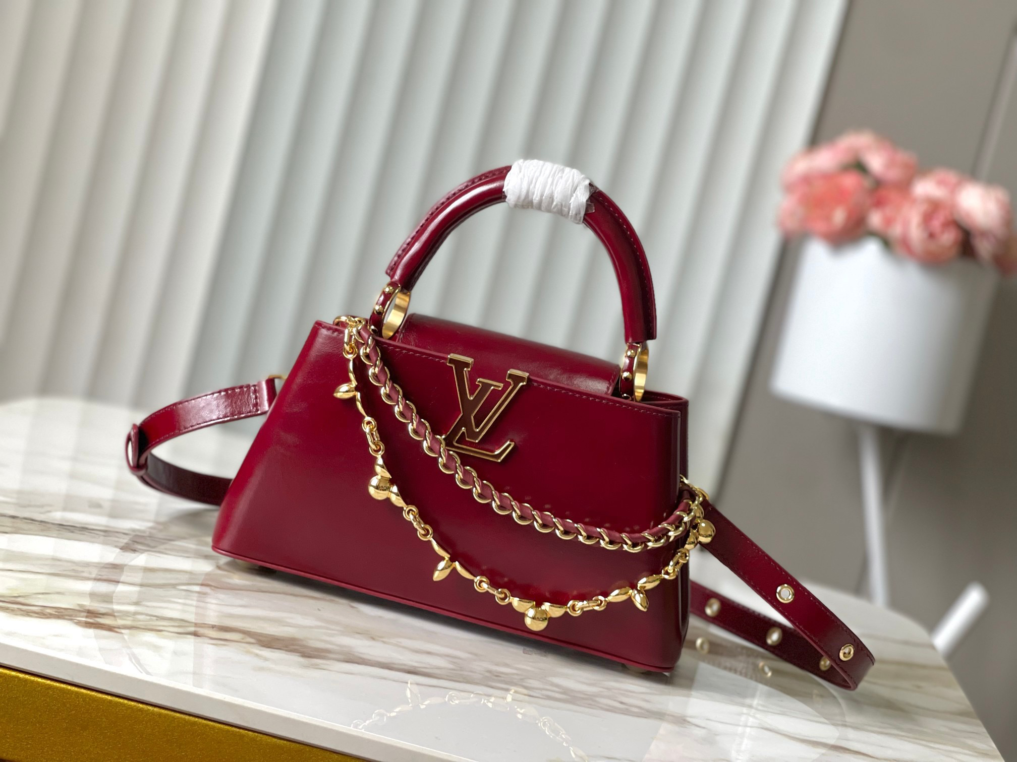 秋冬特惠💰1800 渠道级LV 新品 te级LV 动态芯片 M25473/M48865酒红油蜡二合一 本款Capucines East-West 手袋令皮革巧现褶皱质感 娓娓道出新季潮流风尚 牛皮革饰边勾勒流畅线条 LV字母与可拆卸链条闪烁金属莹泽 宽敞内里满足不同收纳需求 多种背携方式尽显功能巧思。Size : 26.5 * 14 * 8 CM