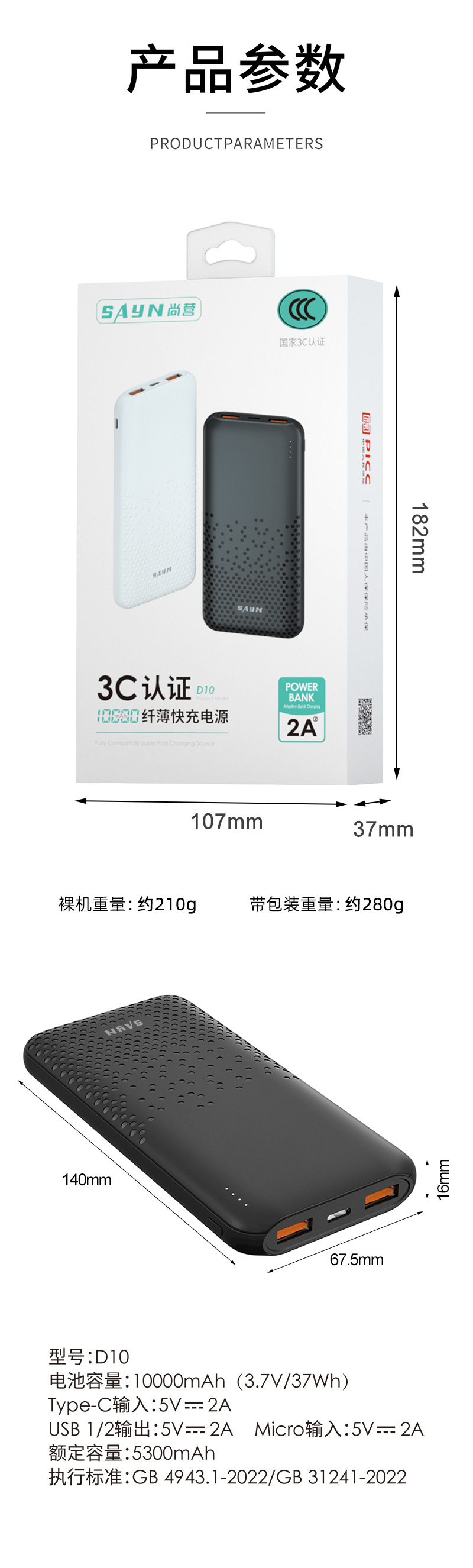 「1万毫安!3C认证」尚营移动电源 聚合物电池充电宝数码配件