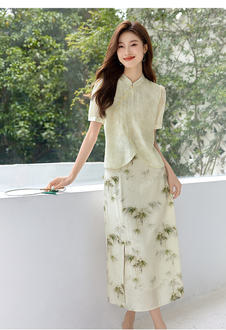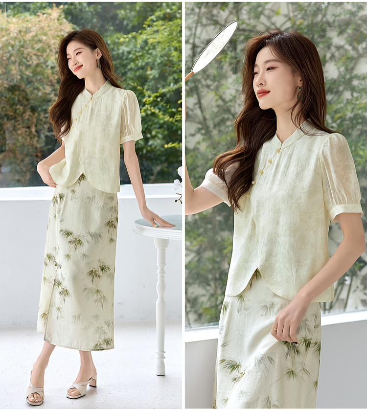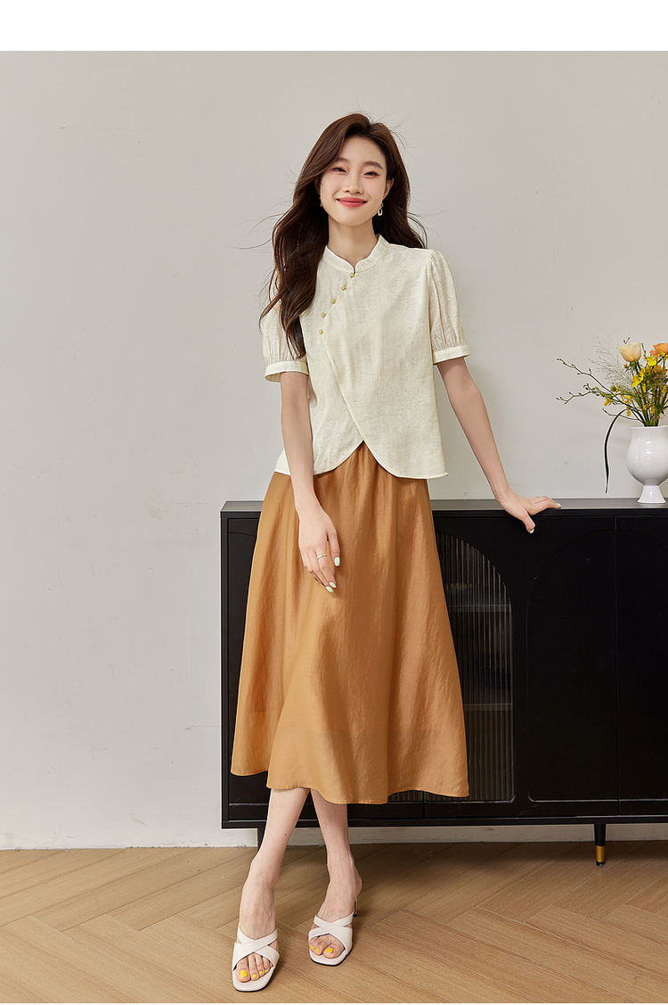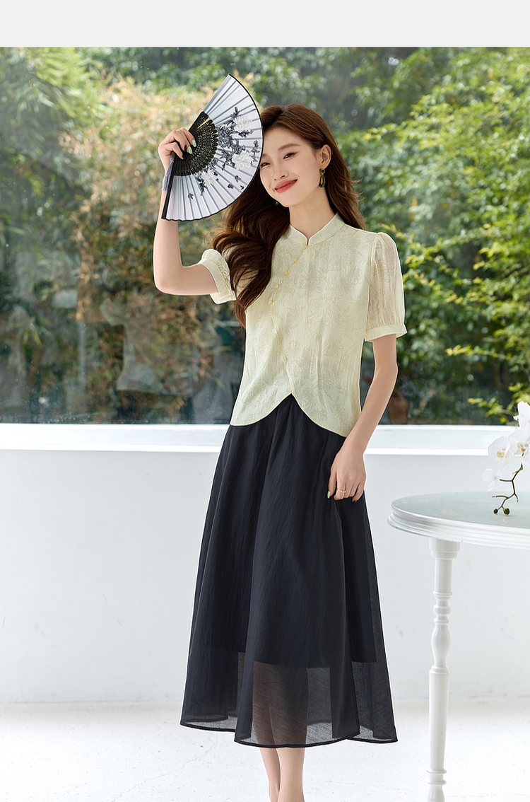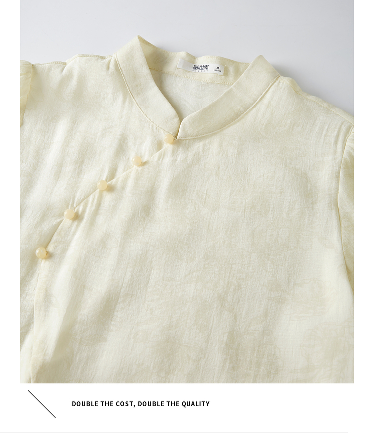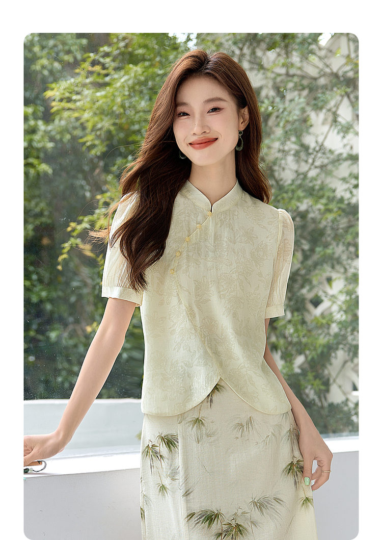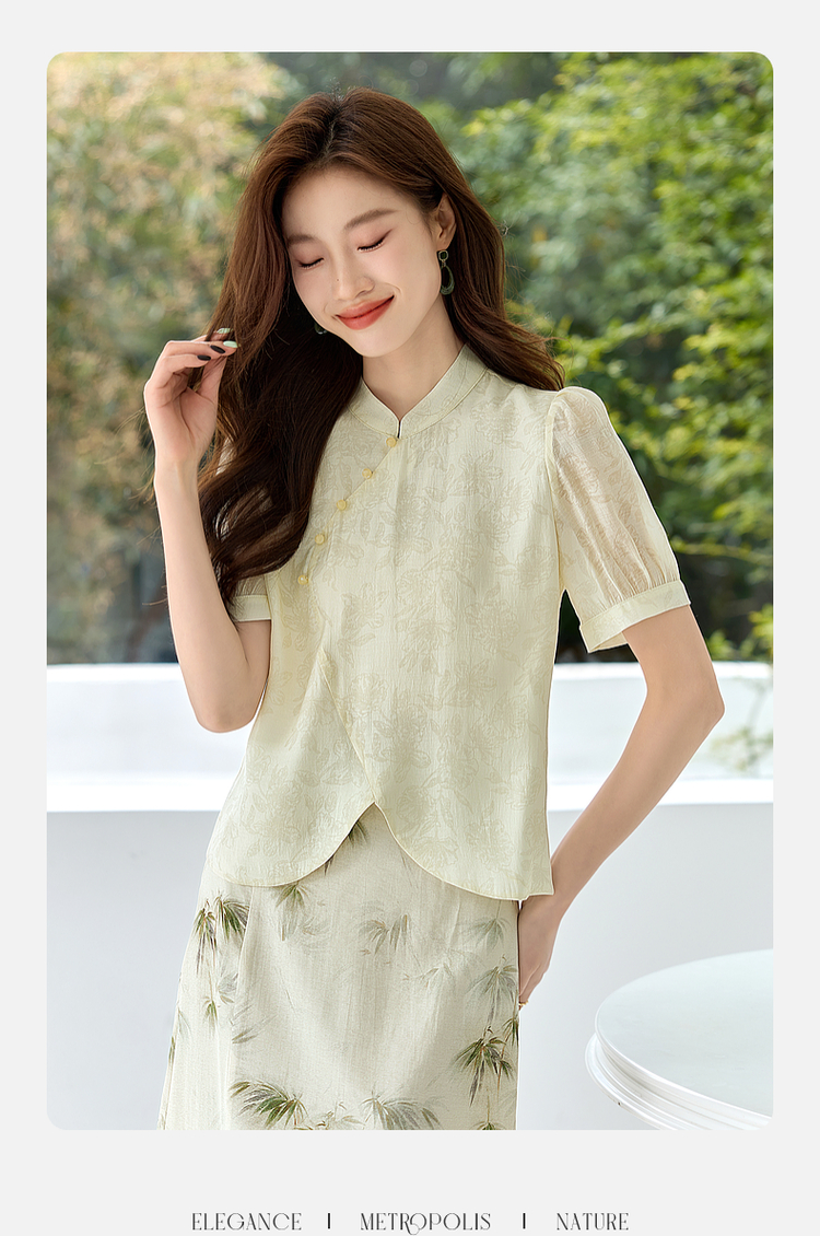 【五折购】熙世界2025夏女装新中式立领斜门襟扣暗纹提花国风短袖衬衫上衣