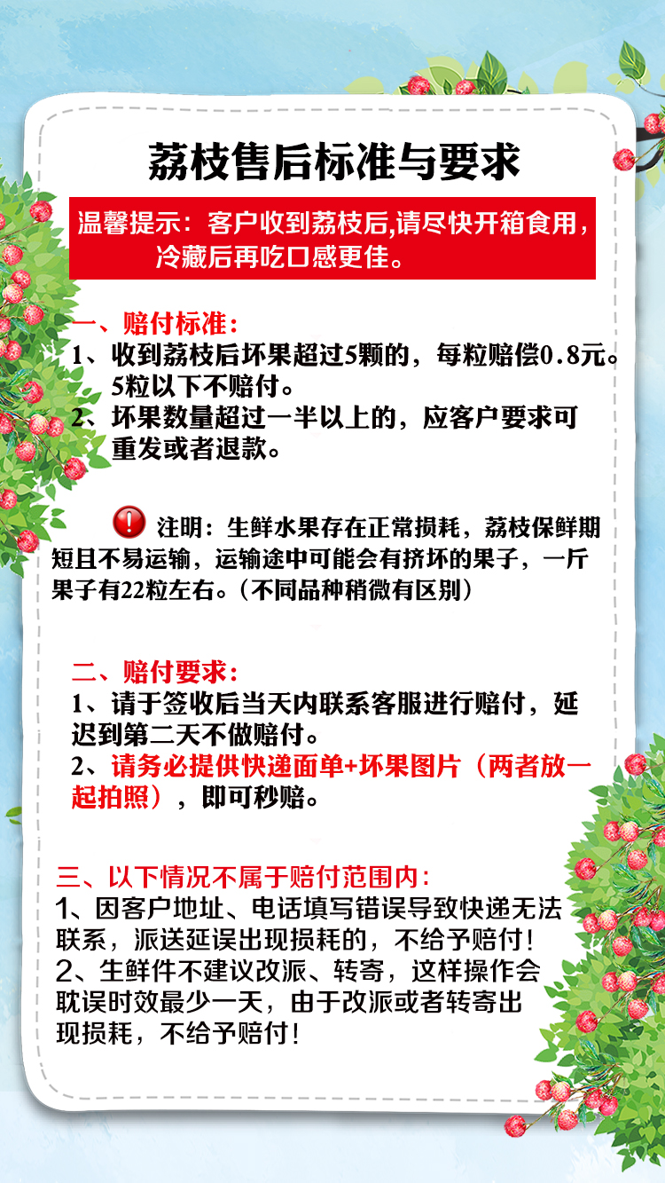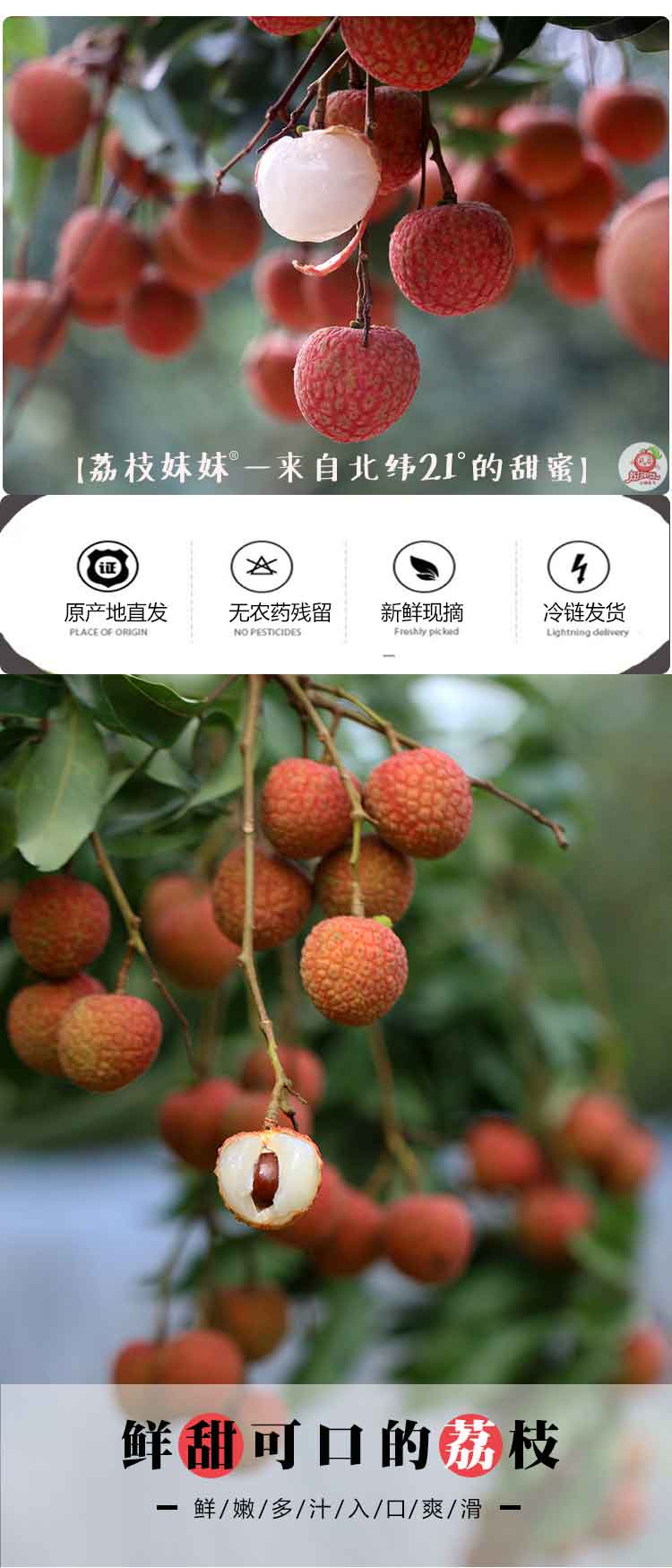 【温馨提示】:收到荔枝后,别着急吃哦,天气炎热会影响口感和风味。先放冰箱冷藏2-3个小时再吃,口感更佳。