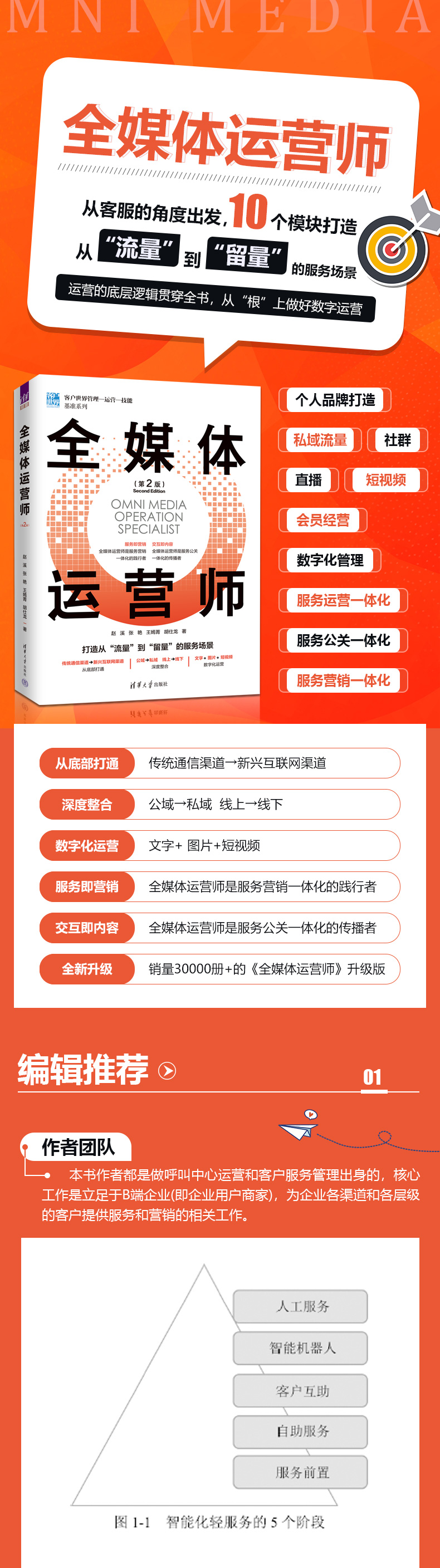在产品多样、竞争加剧、流量稀缺、消费者追求**体验、企业追求成本与效益平衡的当下,如何做好从服务客户到经营客户的所有工作,是每位经营者都在考虑的问题。本书共10章,主要内容包括数字经济背景下的服务机遇、社会化营销、流量生态建设、基于流量经营的个人品牌打造、短视频运营概述与实操要点、直播运营、社群运营及搭建、从品牌到产品的四维营销管理、全媒体社交化客户关系管理、全媒体服务营销管理体系等。本书可助力传统客服行业做好转型工作,帮助线下企业利用私域流量做好服务工作,旨在引导企业在全域流量运营中服务好客户、经营好客户,形成服务营销一体化、服务运营一体化、服务公关一体化的全新模式。本书可作为求变的客服中心负责人、求发展的客服从业者的学习参考书,也可供自媒体从业者、线下连锁店经营者、运营或产品岗位从业者阅读。